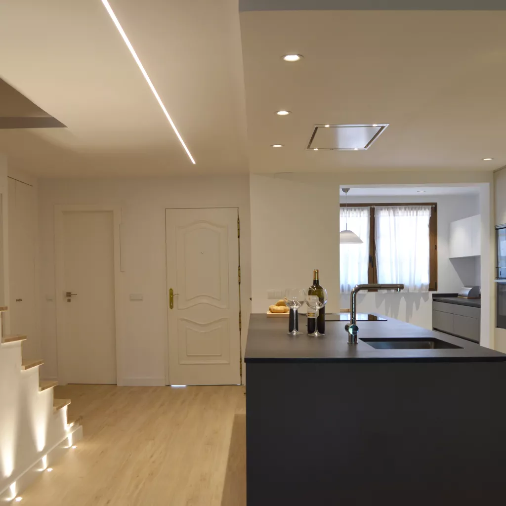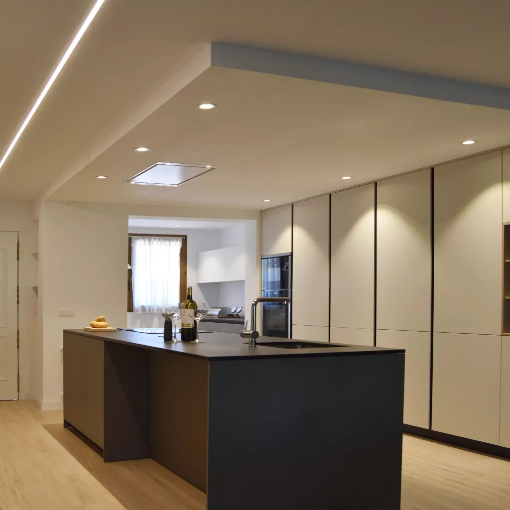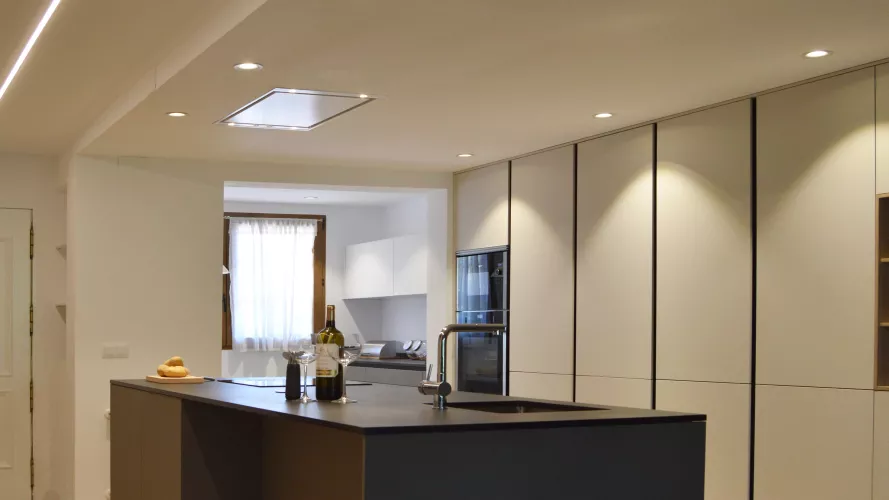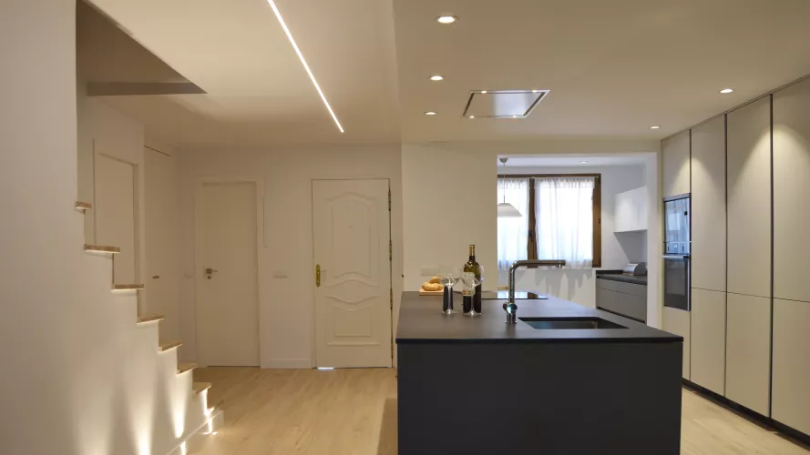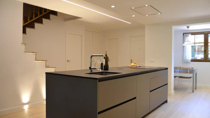 En esta reforma se ha intentado crear un entorno eficiente, elegante y abierto, siendo la cocina la primera impresión nada más entrar en la vivienda. Y es que, cambiar un espacio renueva la energía, a la vez que abre un campo lleno de posibilidades. En esta cocina de diseño, se han combinado distintas tonalidades atemporales: Gris Visón para su zona de trabajo y comedor, Blanco Seff en sus columnas y Negro para su encimera. Entre su mobiliario de Santos realizado en Estratificado destaca su lineal de columnas hasta el techo que potencian la amplitud de la sala a la vez que la hacen realmente espectacular. Estos además de ofrecer un gran almacenamiento al usuario e integrar los electrodomésticos transmiten vitalidad y confort. Delante se ubica una pequeña isla realizada a medida que permite al usuario acceder de una forma espaciosa y sin obstáculos. Al fondo encontramos un segundo lineal que además de estar formado por muebles altos con abertura plegable, ofrece mayor libertad de trabajo. Este espacio contiene una luminosa zona de comedor que añade funcionalidad y comodidad. Para el pavimento se ha utilizado una madera natural que permite encontrar el equilibrio ante los colores mate de su mobiliario. De esta forma, se plantea una estética acogedora, uniforme y con mucho estilo. Los materiales Santos utilizados en este proyecto son: LINE ESTRATIFICADO GRIS VISÓN LINE ESTRATIFICADO BLANCO SEFF ENCIMERA DEKTON SIRIUS SOLID