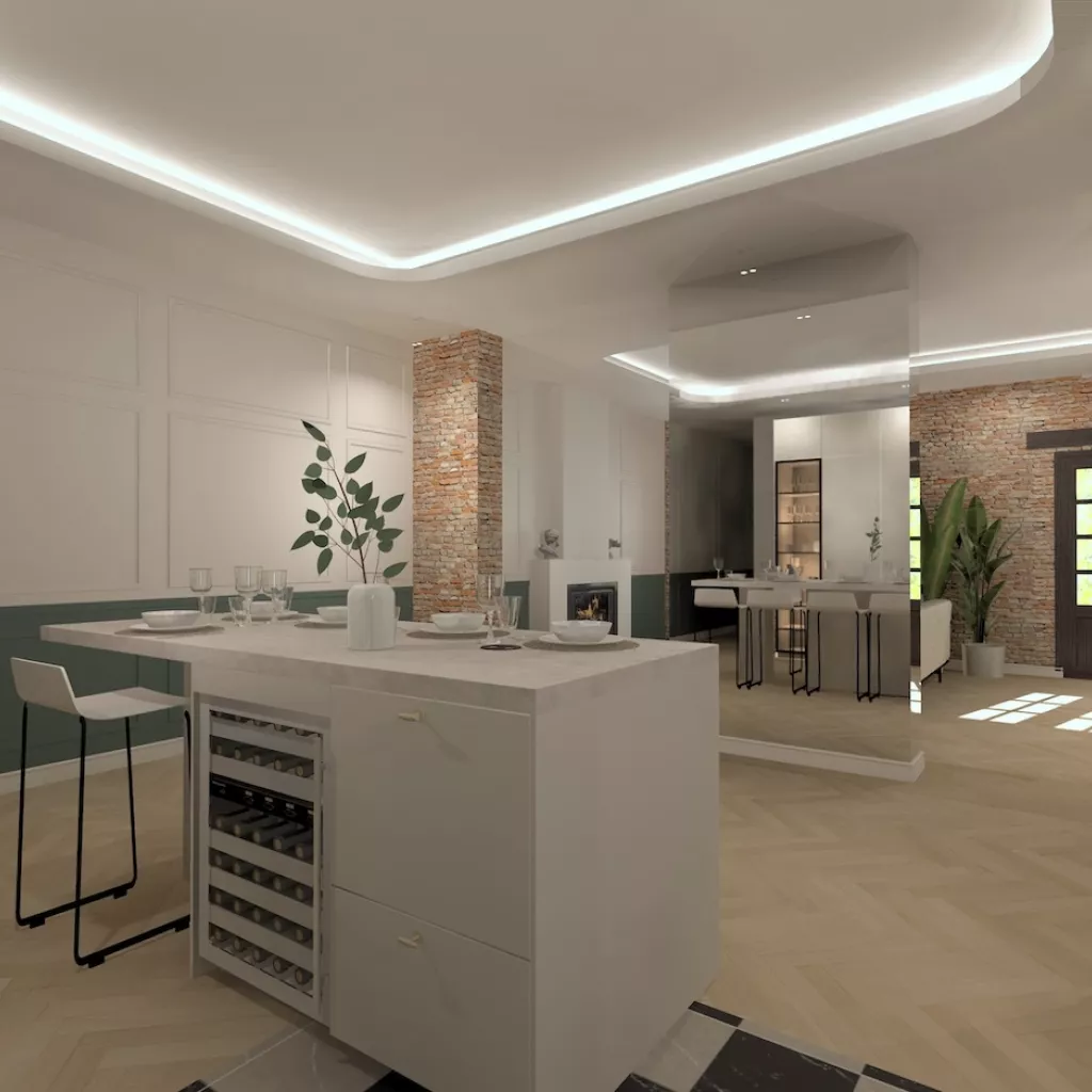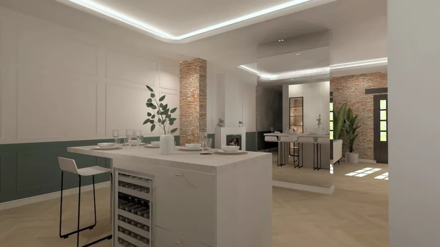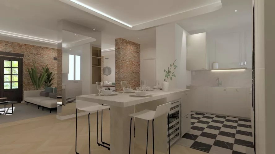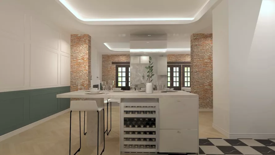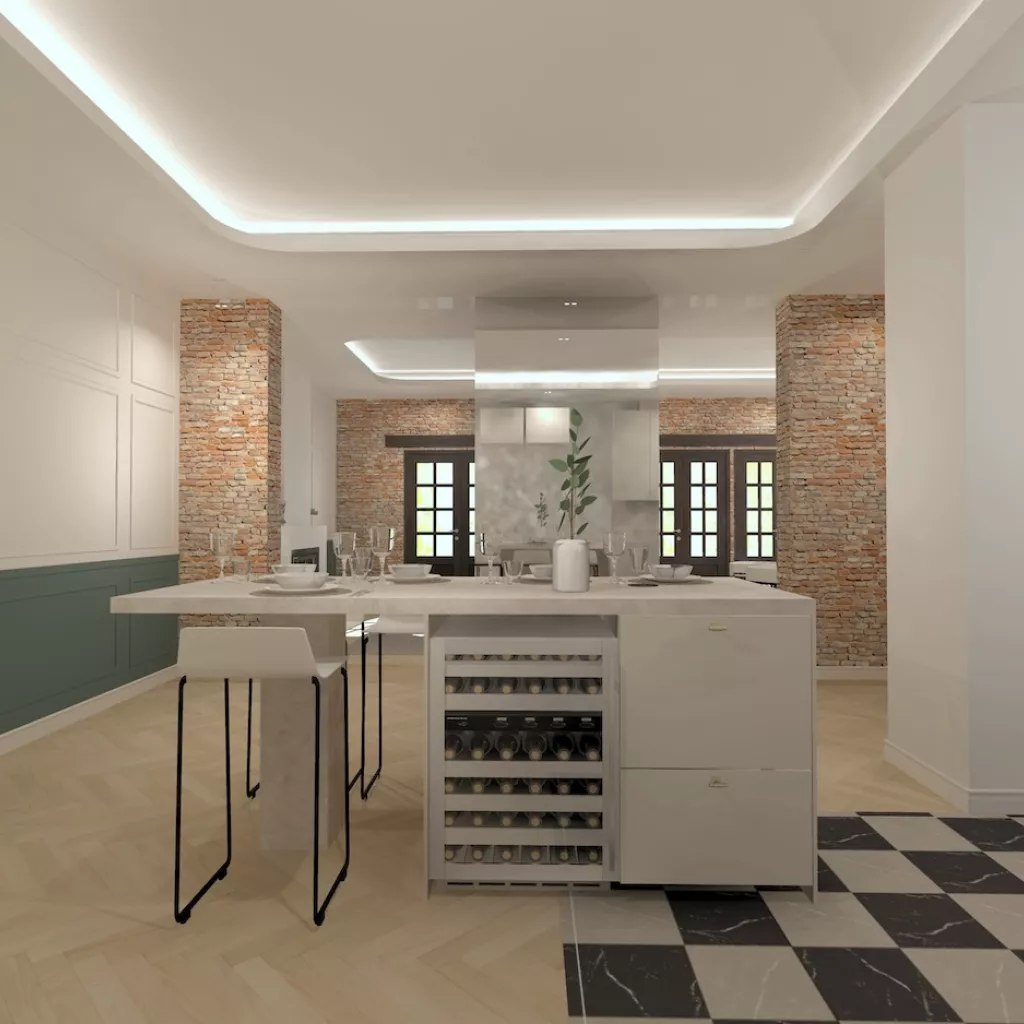 Cocina con muebles Santos abiertos al salón, de color Blanco perla con una isla donde hemos dispuesto muebles de almacenamiento, vinoteca con 2 zonas de temperatura, y zona para comer.