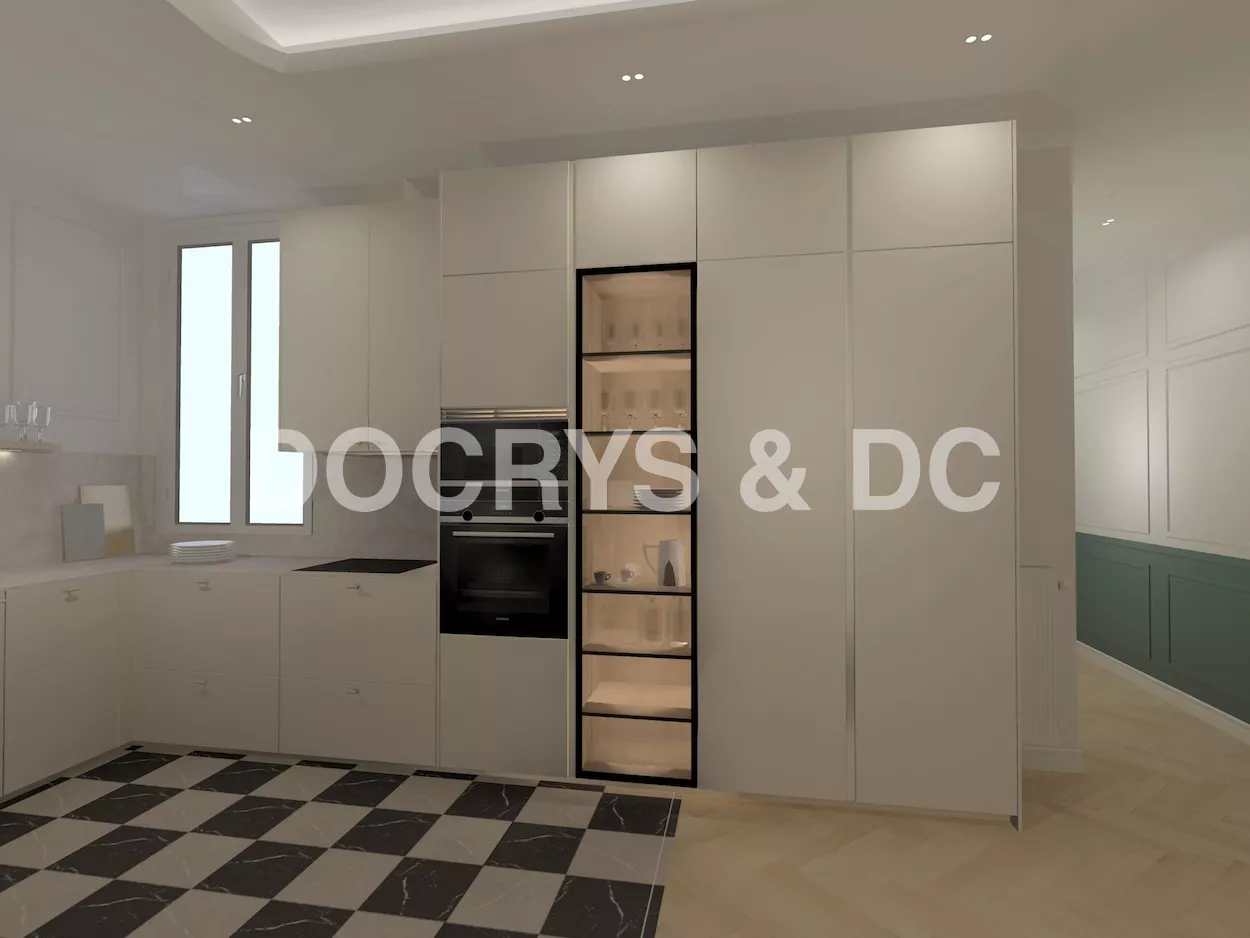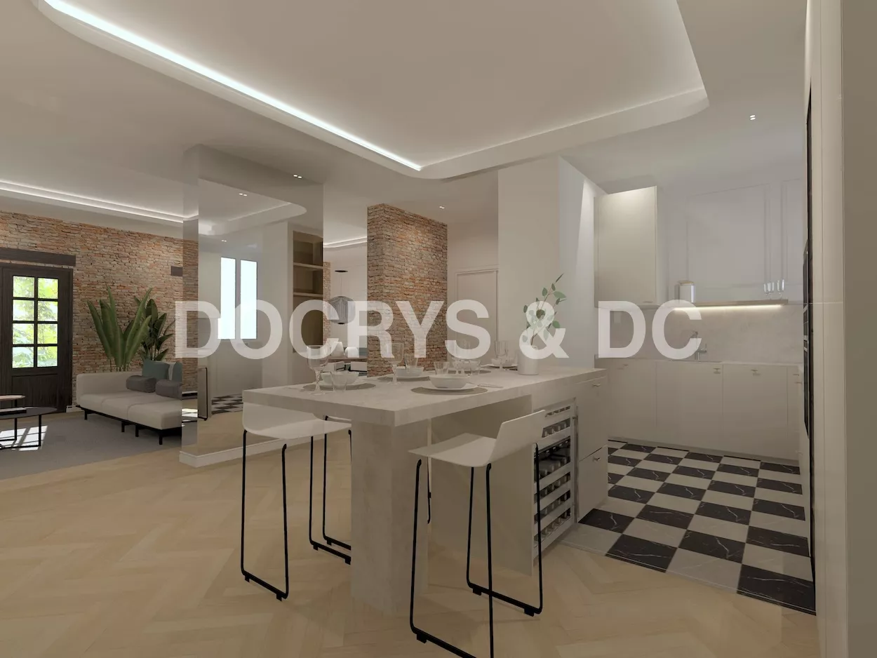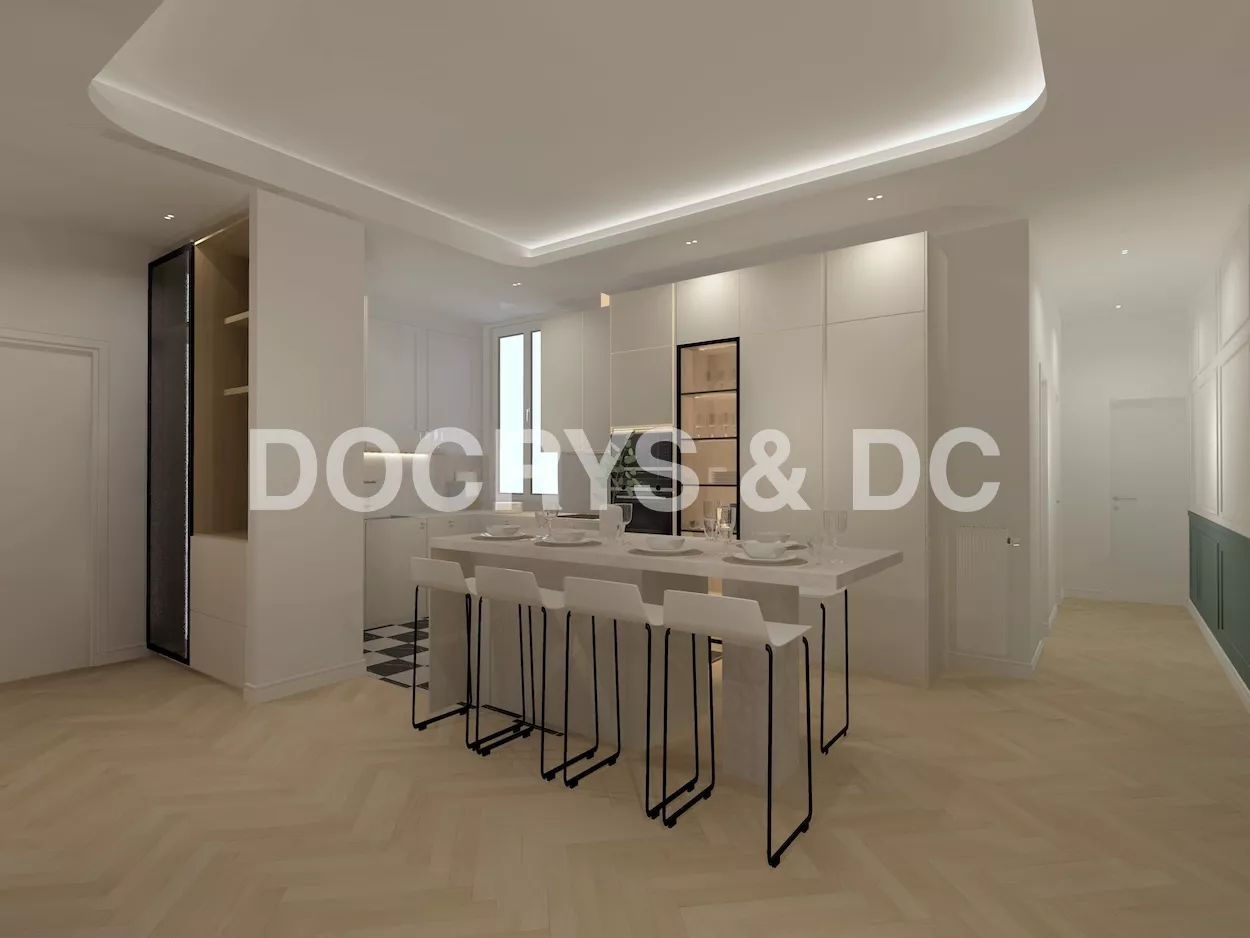 Cocina con muebles Santos abiertos al salón, de color Blanco perla con una isla donde hemos dispuesto muebles de almacenamiento, vinoteca con 2 zonas de temperatura, y zona para comer.