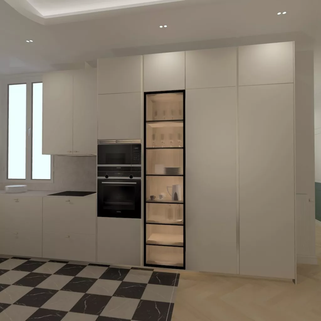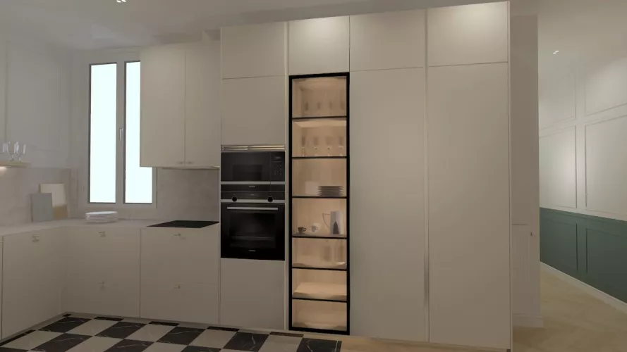 Por otro lado, los muebles están en forma de L, de un lado donde está la zona de agua junto con el lavavajillas y la zona de agua y muebles altos de almacenamiento, y justo formando la L del otro lado, el horno y microondas en torre, una vitrina de 6 divisiones con luz incorporada, y seguido dos columnas que vendrían a ser el frigorífico y el congelador integrados y ocultos, para una mayor estética y pulcritud en el diseño.