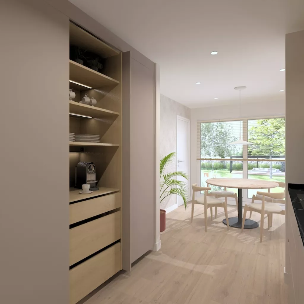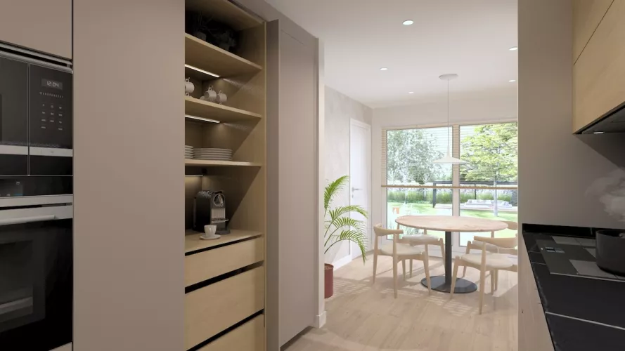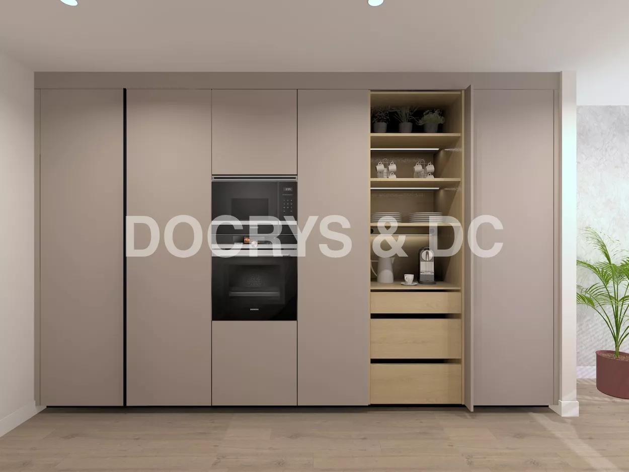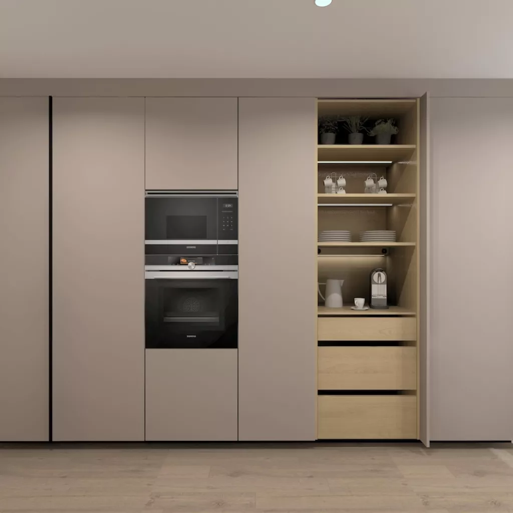 En el frente contrario encontramos la nevera oculta con el color del mueble, un detalle muy estético que le da un toque muy moderno. A su lado tenemos horno y microondas encastrados en el mueble gris arena y para finalizar un mueble en roble con menaje.