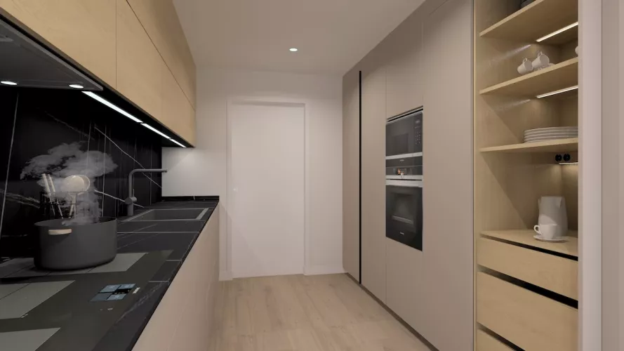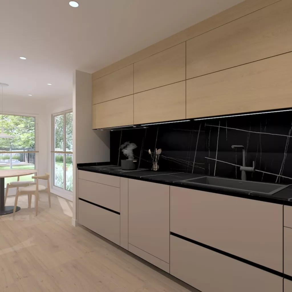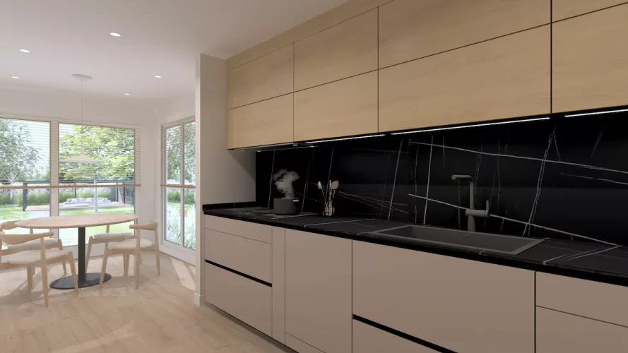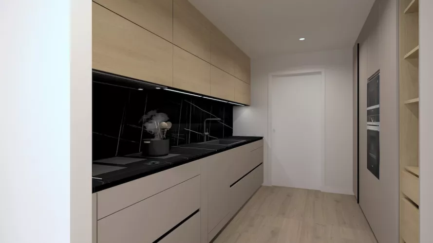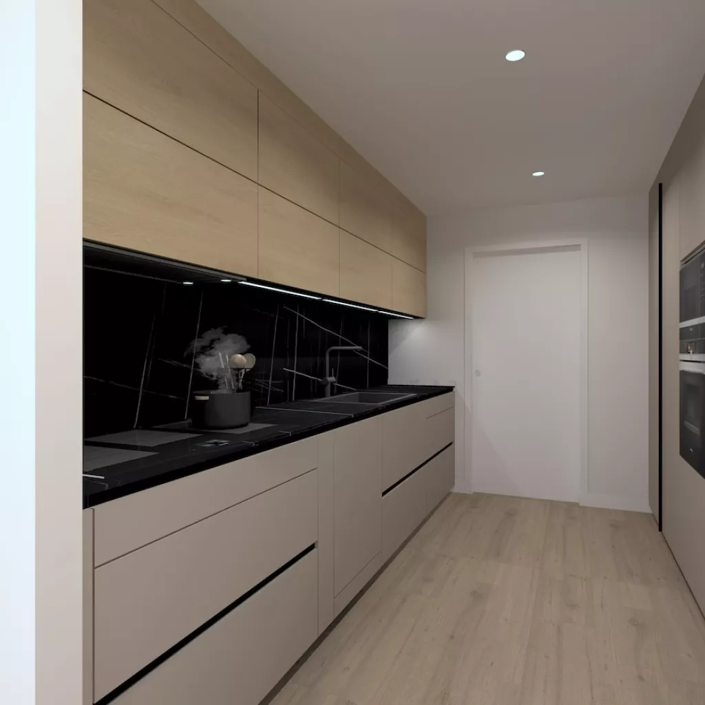 Cocina gris arena con encimera y trasera Azalai Negro, esta se compone de dos frentes uno encima del otro con detalles en roble natural.