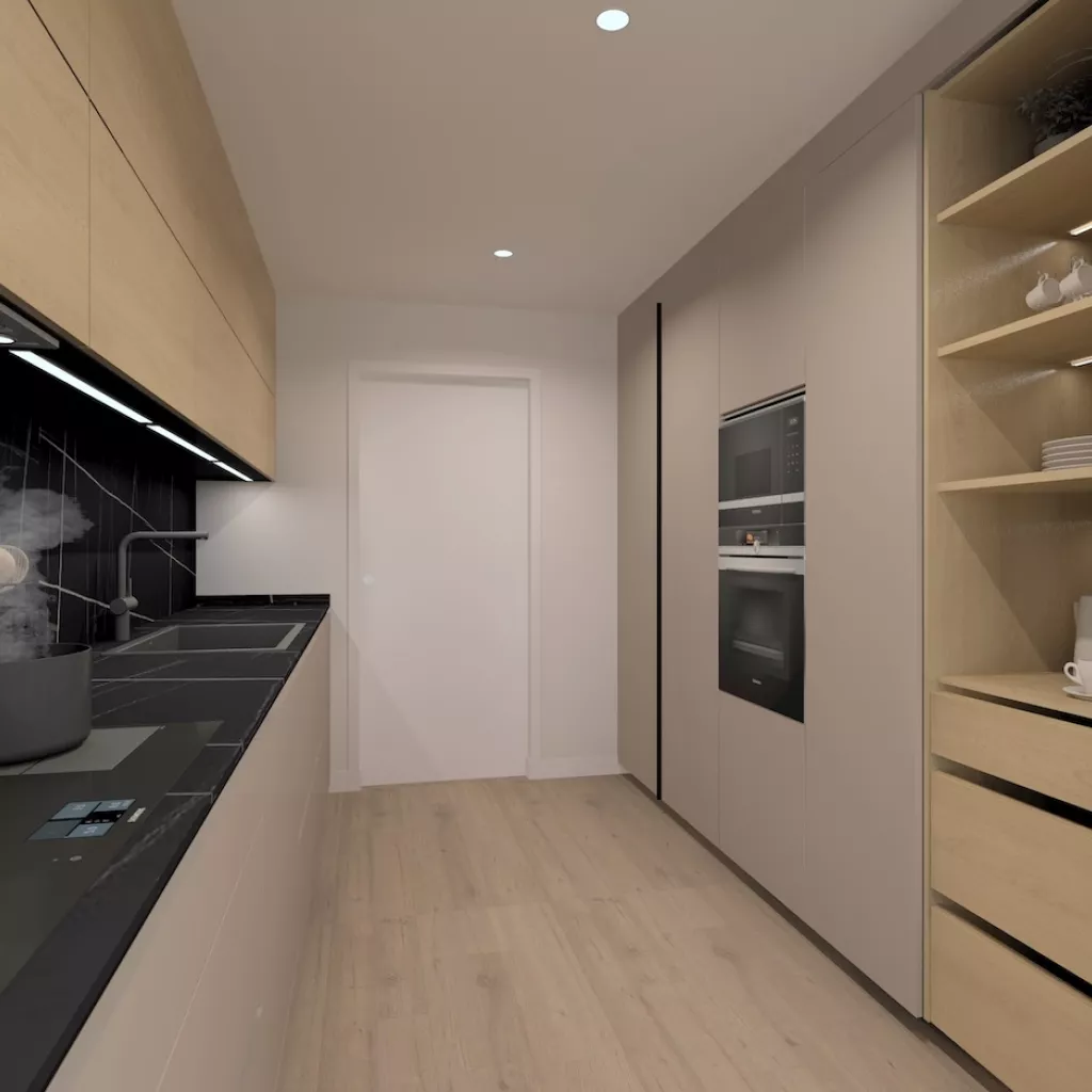 En el primero de estos podemos ver la vitrocerámica y el fregadero con la campana extractora y la iluminación bajo mueble, los altos para el almacenaje son en roble natural, lo que aporta calidez a la cocina. Los tiradores son push para evitar ruido visual.
