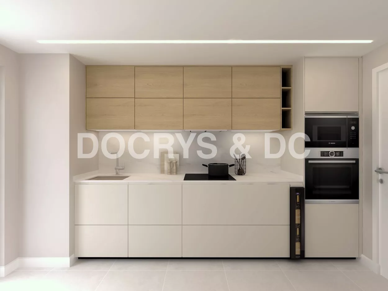 En cuanto al suelo, el pavimento porcelánico en tono neutro da continuidad a la paleta cromática y refuerza la percepción de unidad. La iluminación general se resuelve con una línea empotrada en el techo que proporciona luz homogénea y funcional, mientras que las tiras LED bajo los módulos superiores iluminan la encimera de forma directa, facilitando el trabajo diario y aportando un matiz acogedor al ambiente.