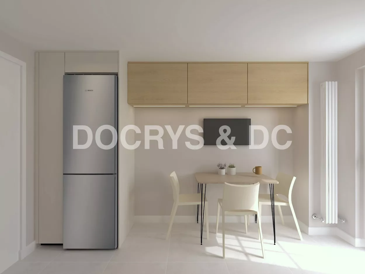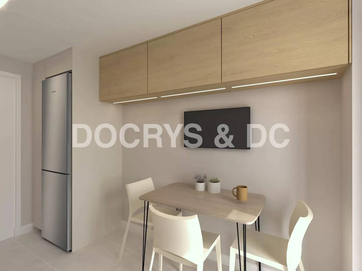 La zona de comedor se integra con naturalidad en la parte opuesta, con una mesa de madera clara de líneas sencillas acompañada de sillas blancas que aportan ligereza visual. Sobre ella, un mueble alto continúa la línea de almacenamiento, y una pantalla mural convierte este rincón en un lugar polivalente: ideal para comer, trabajar o disfrutar de un momento de relax. La disposición cercana a la ventana permite el paso de la luz natural, haciendo del conjunto un espacio cómodo y agradable para cualquier hora del día.