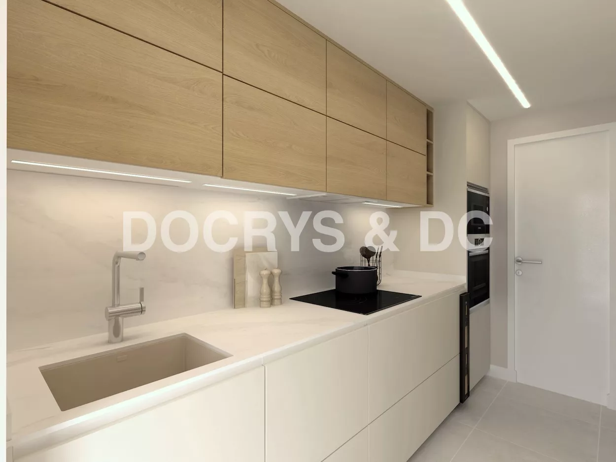 El mobiliario inferior, en acabado blanco mate y con frentes lisos sin tiradores, contribuye a una imagen minimalista y pulida. En contraste, los muebles altos en tono madera natural aportan calidez y textura, creando un equilibrio visual muy armónico. Esta dualidad cromática entre blanco y madera refuerza la luminosidad del espacio, mientras que el frente y la encimera en acabado mármol claro complementan la atmósfera serena y sofisticada.