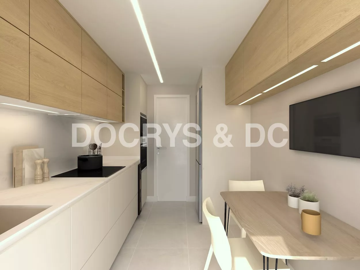 Esta cocina lineal con comedor integrado se ha diseñado para ofrecer el máximo aprovechamiento del espacio sin renunciar a una estética moderna y cálida. La distribución a lo largo de una sola pared permite liberar el resto del ambiente, generando una sensación de amplitud muy agradecida en cocinas de dimensiones ajustadas. Cada elemento ha sido cuidadosamente seleccionado para favorecer la funcionalidad, el orden y la limpieza visual en el día a día.