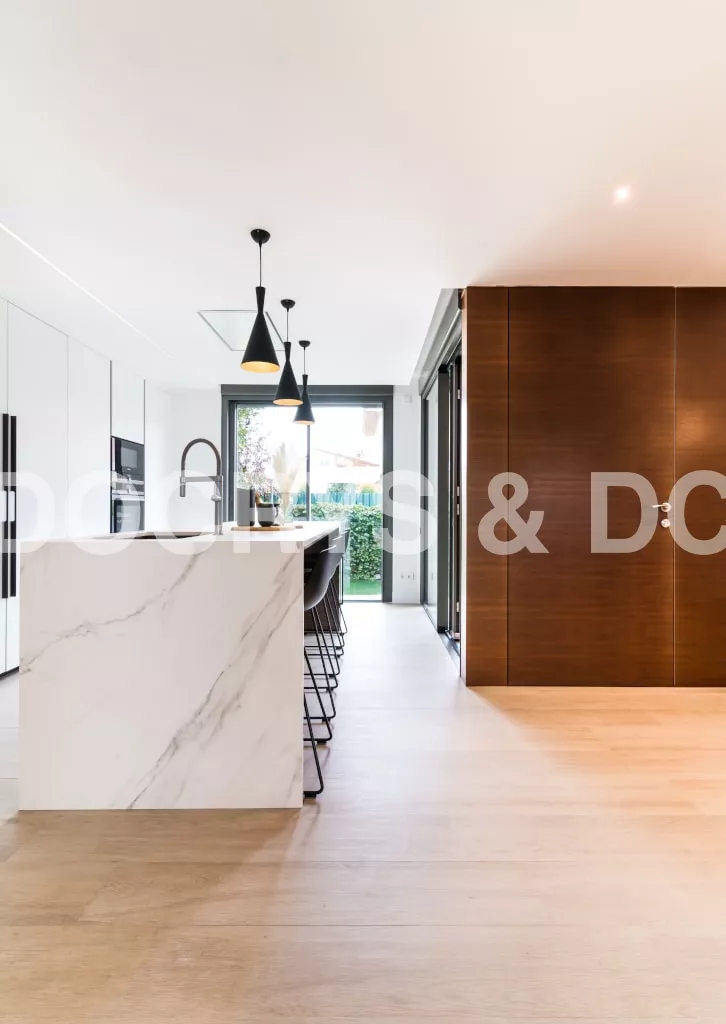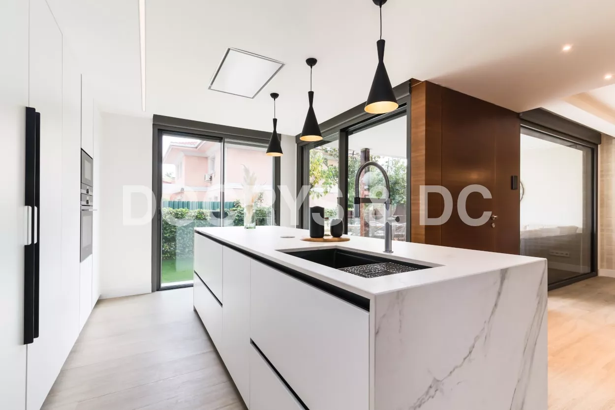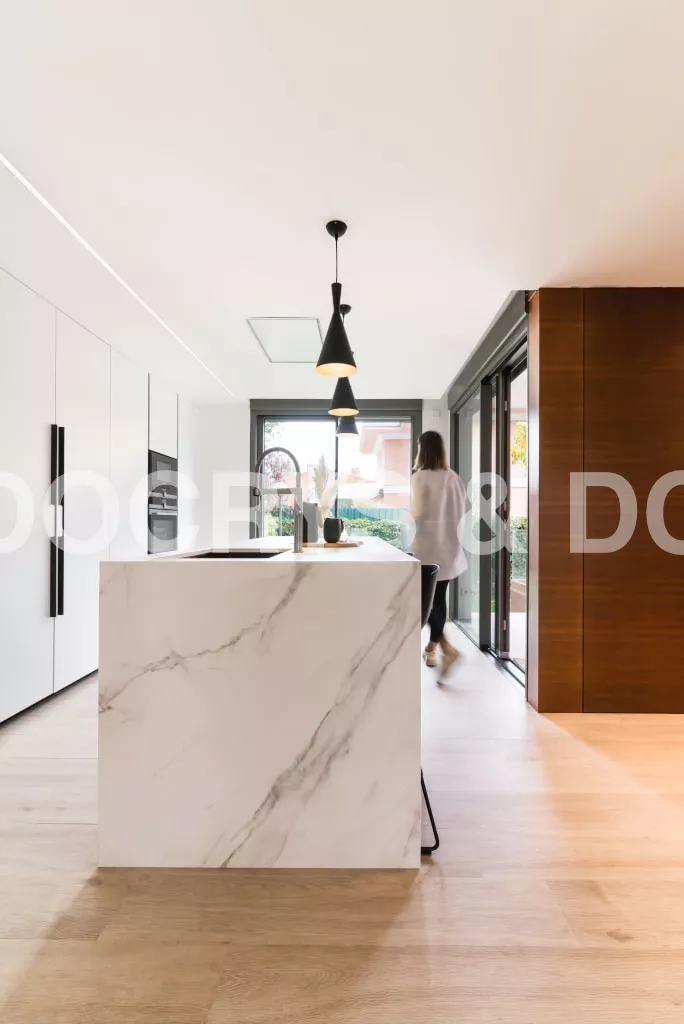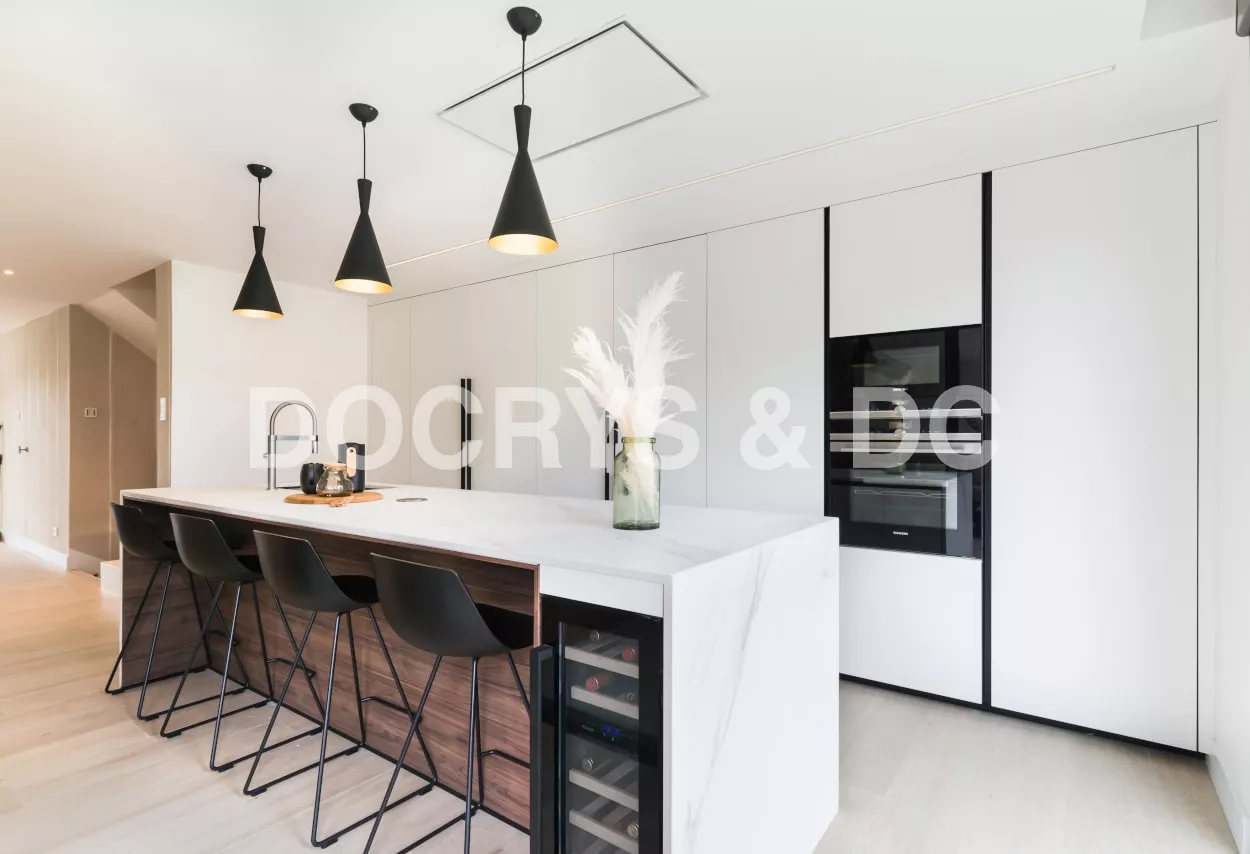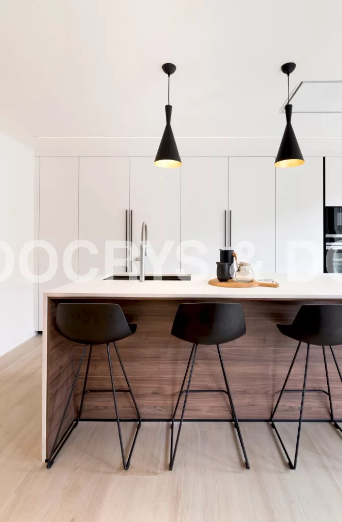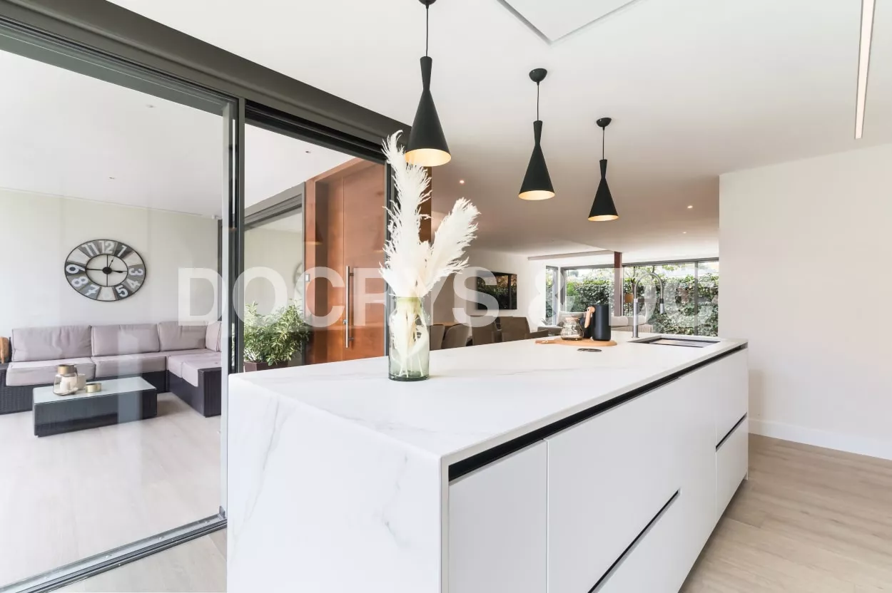 El diseño de esta cocina en color blanco seff, se fusiona con la decoración del resto de la estancia, creando un entorno de diseño moderno.