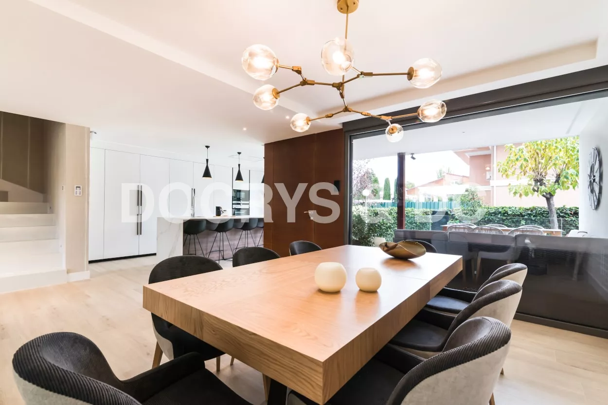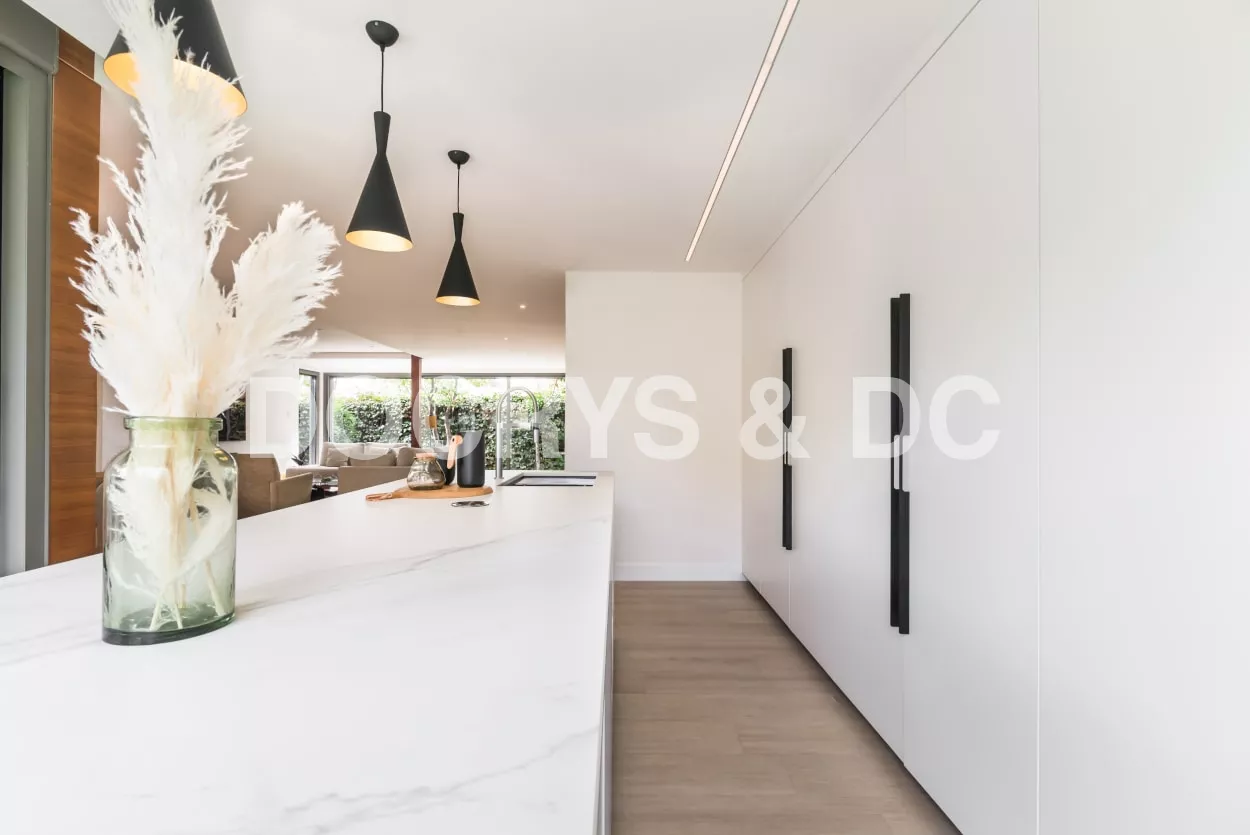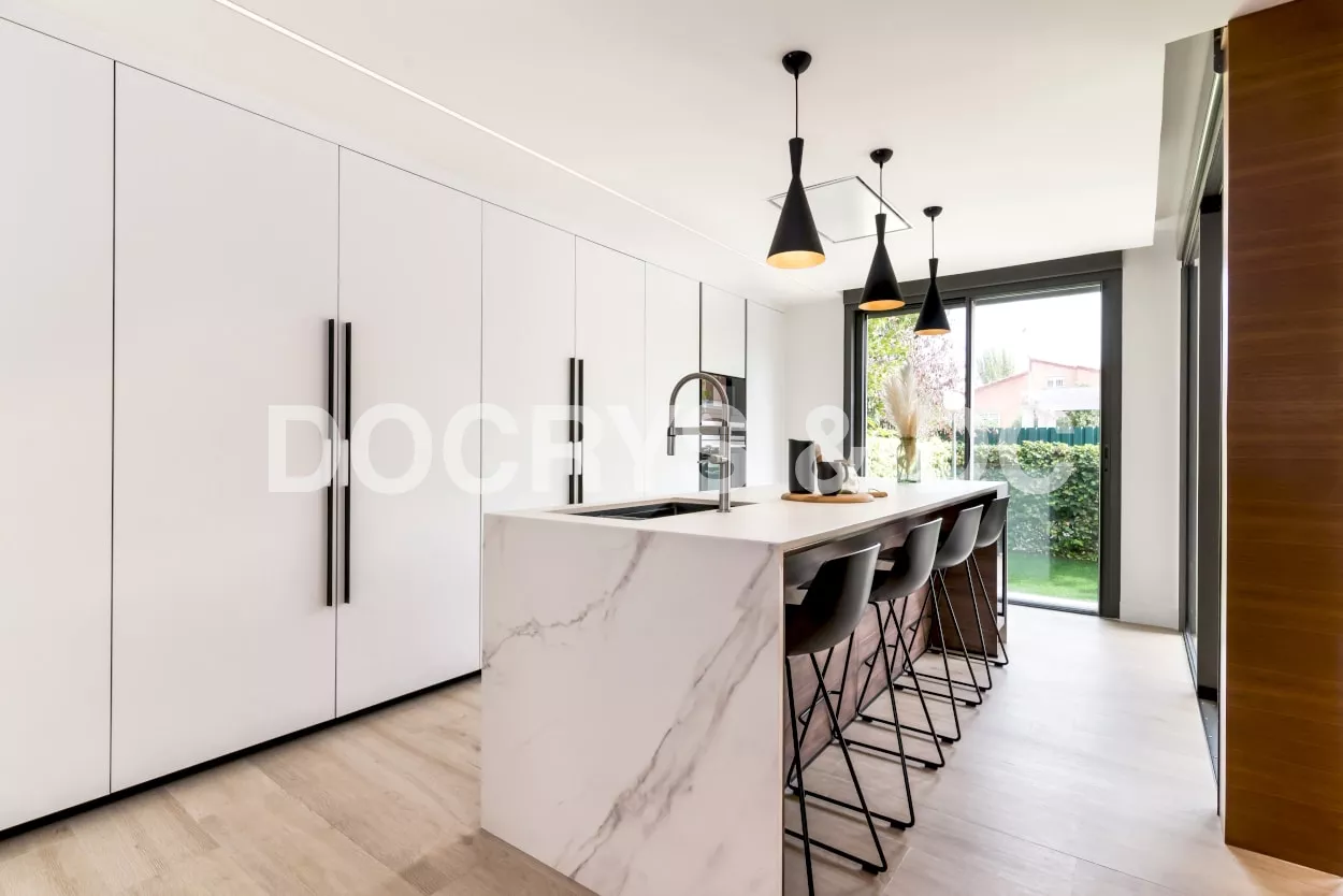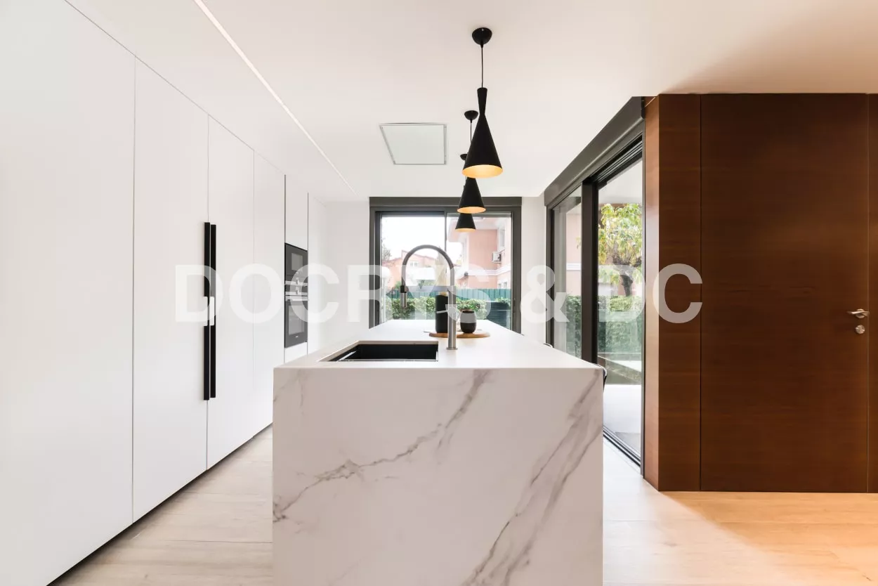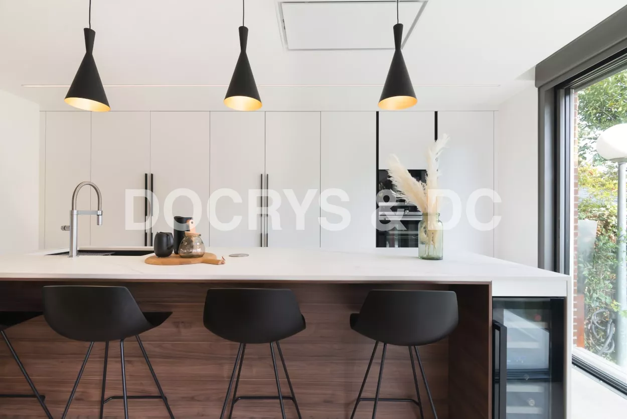 El diseño de esta cocina en color blanco seff, se fusiona con la decoración del resto de la estancia, creando un entorno de diseño moderno.