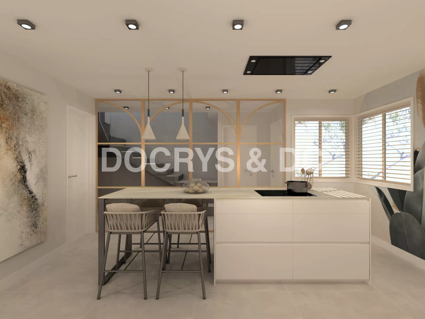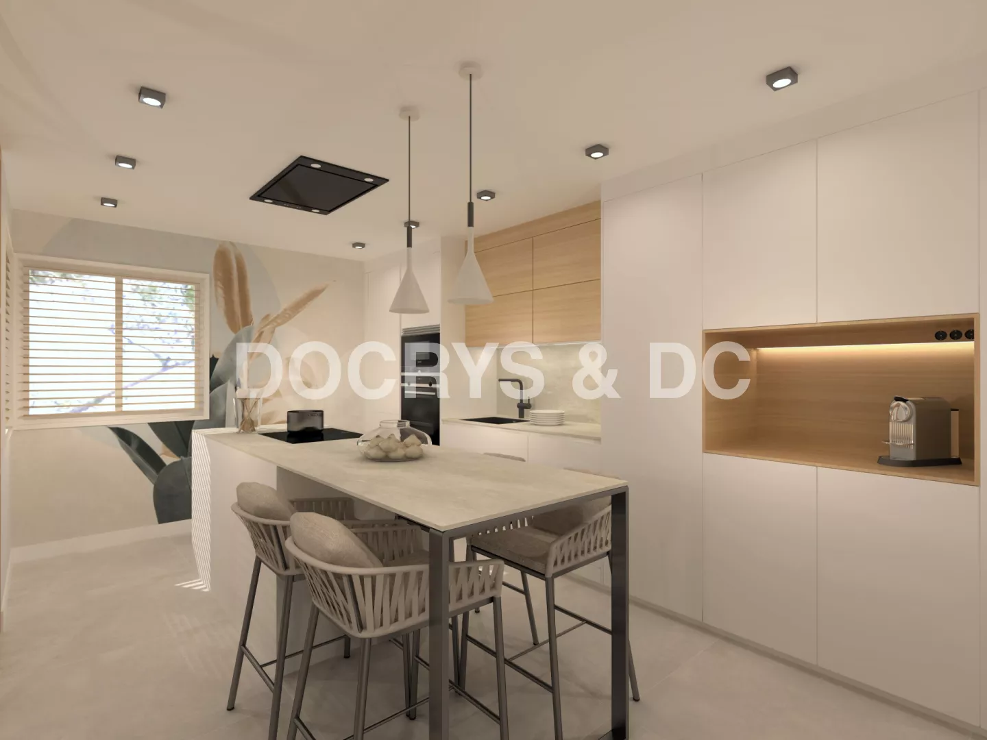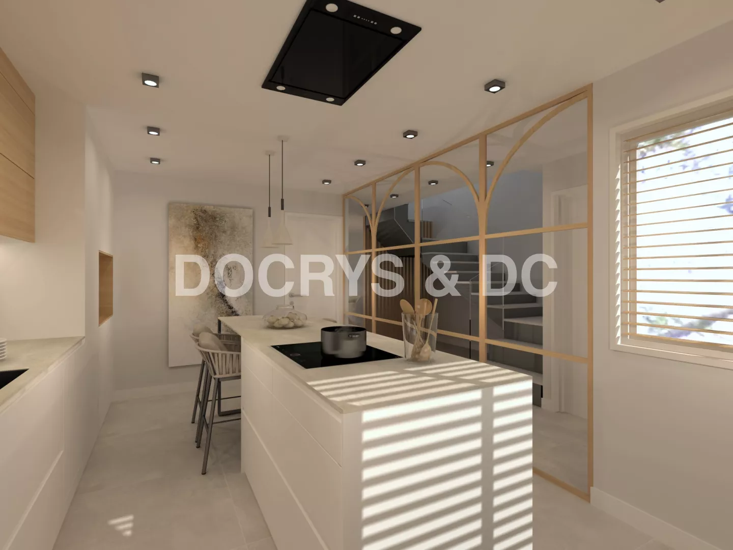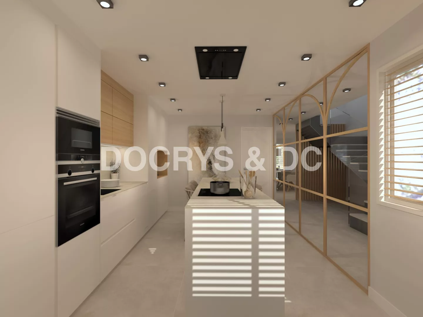 La cocina es semi abierta y cuenta con unas puertas correderas de cristal y madera, permitiendo la entrada de luz, creando un espacio luminoso y mucho más amplio.