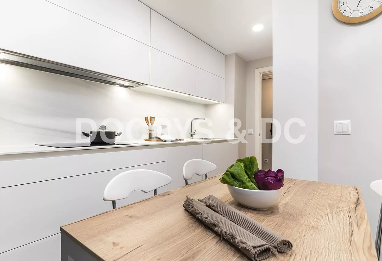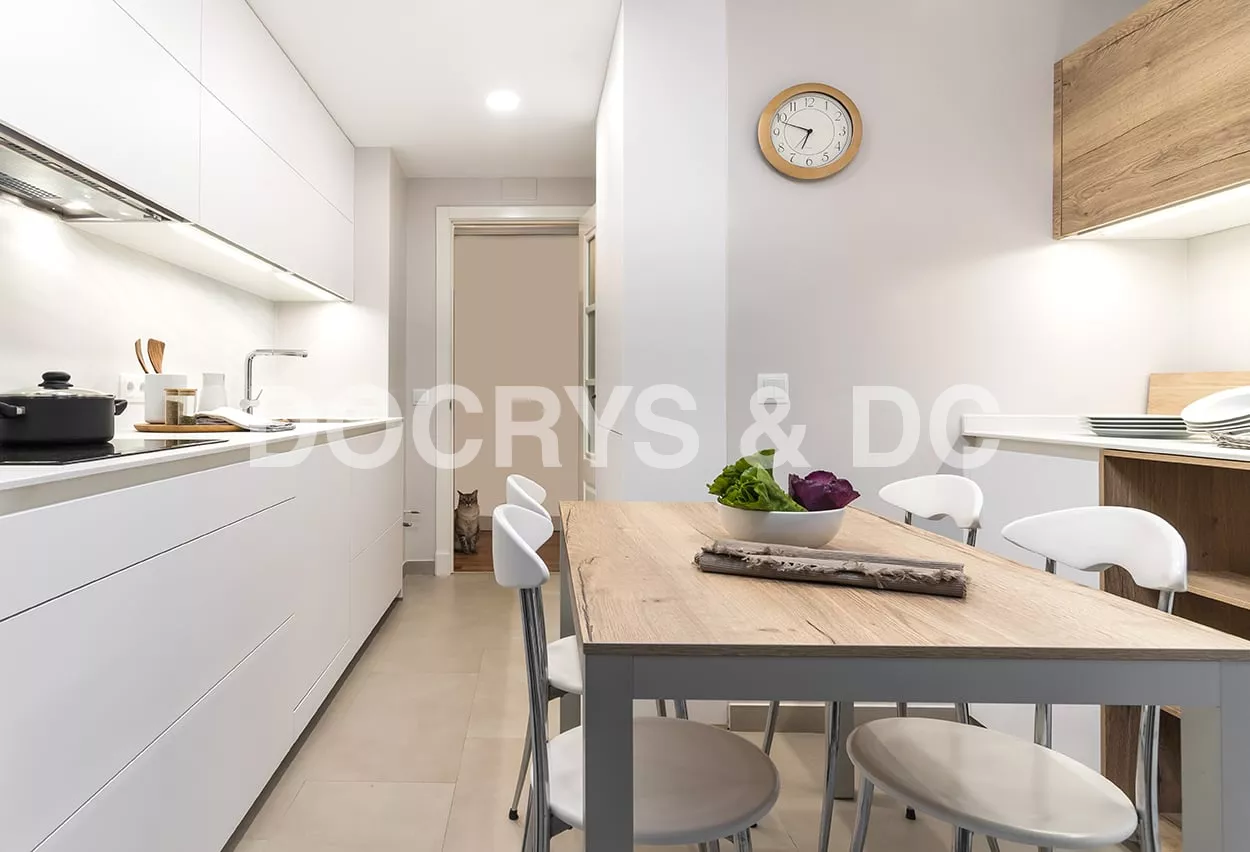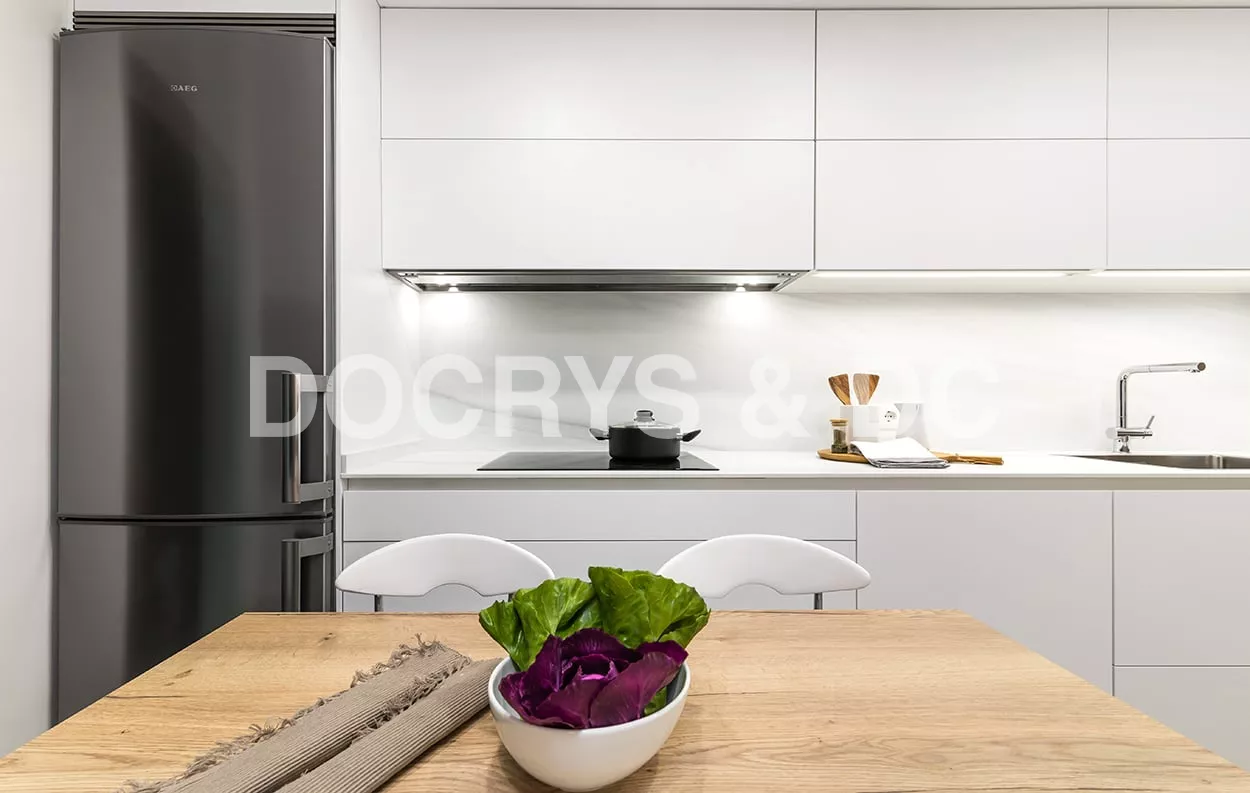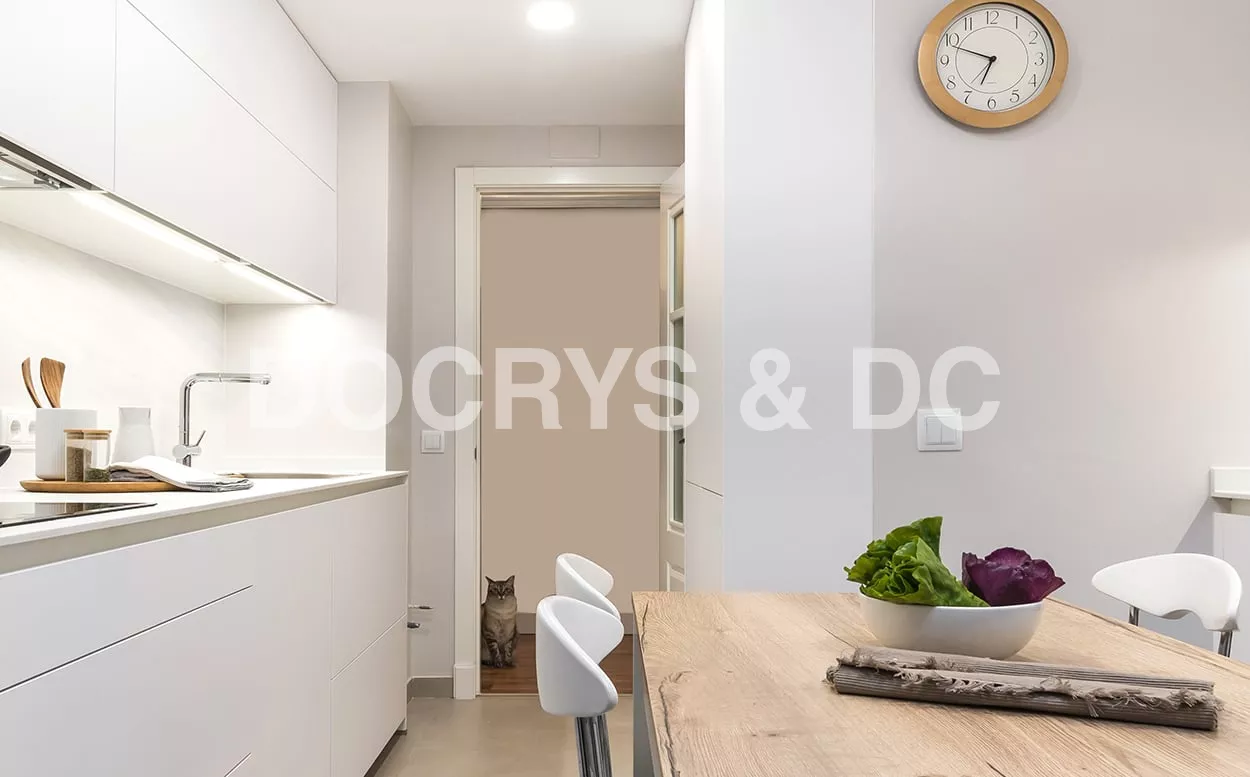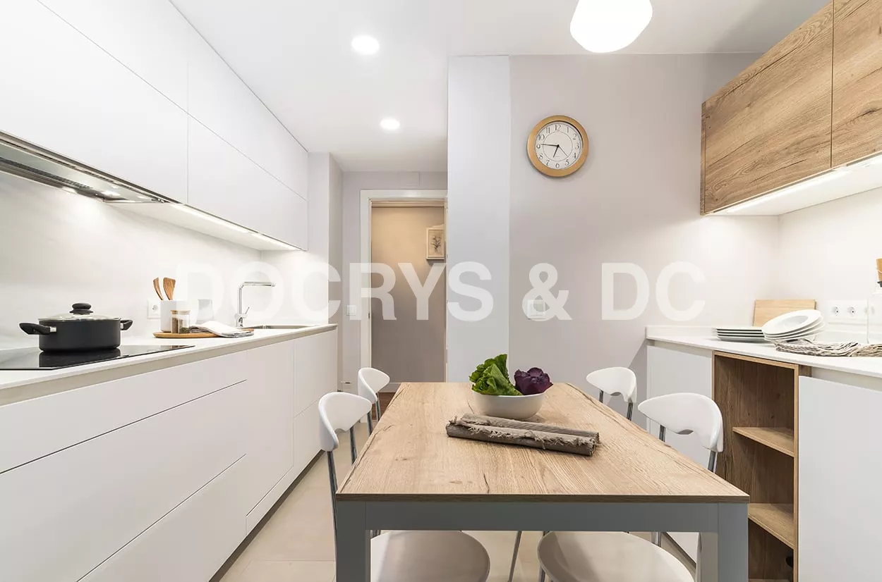 La cocina cuenta con un pequeño espacio donde hemos colocado un mesado de SANTOS con acabado roble rústico (mismo color que los muebles altos) para cuatro comensales.
