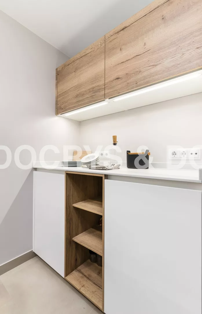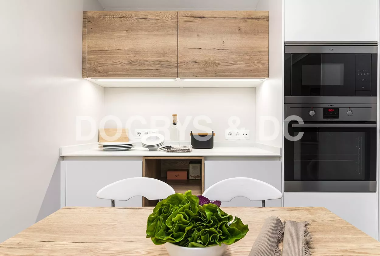 Ambos frentes cuentan con muebles bajos y altos, mezclando el color blanco con el roble rústico, creando una combinación perfecta y muy atemporal.