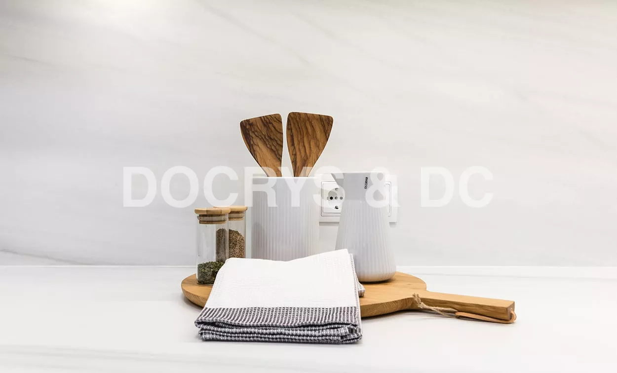 Cocina Santos en color Blanco Innsbruck y Roble rústico sincro con material estratificado y encimera de Sapienstone, en color Blanco lasa con acabado Silk.