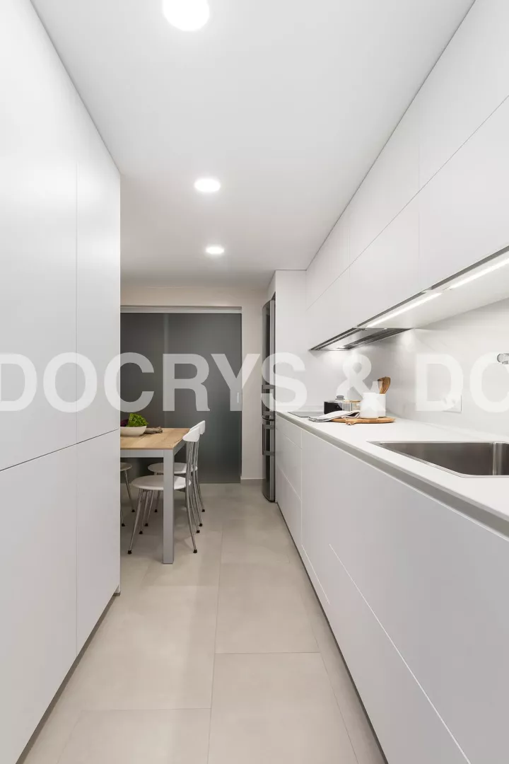 La distribución de esta cocina moderna es en paralelo y se divide en dos frentes.