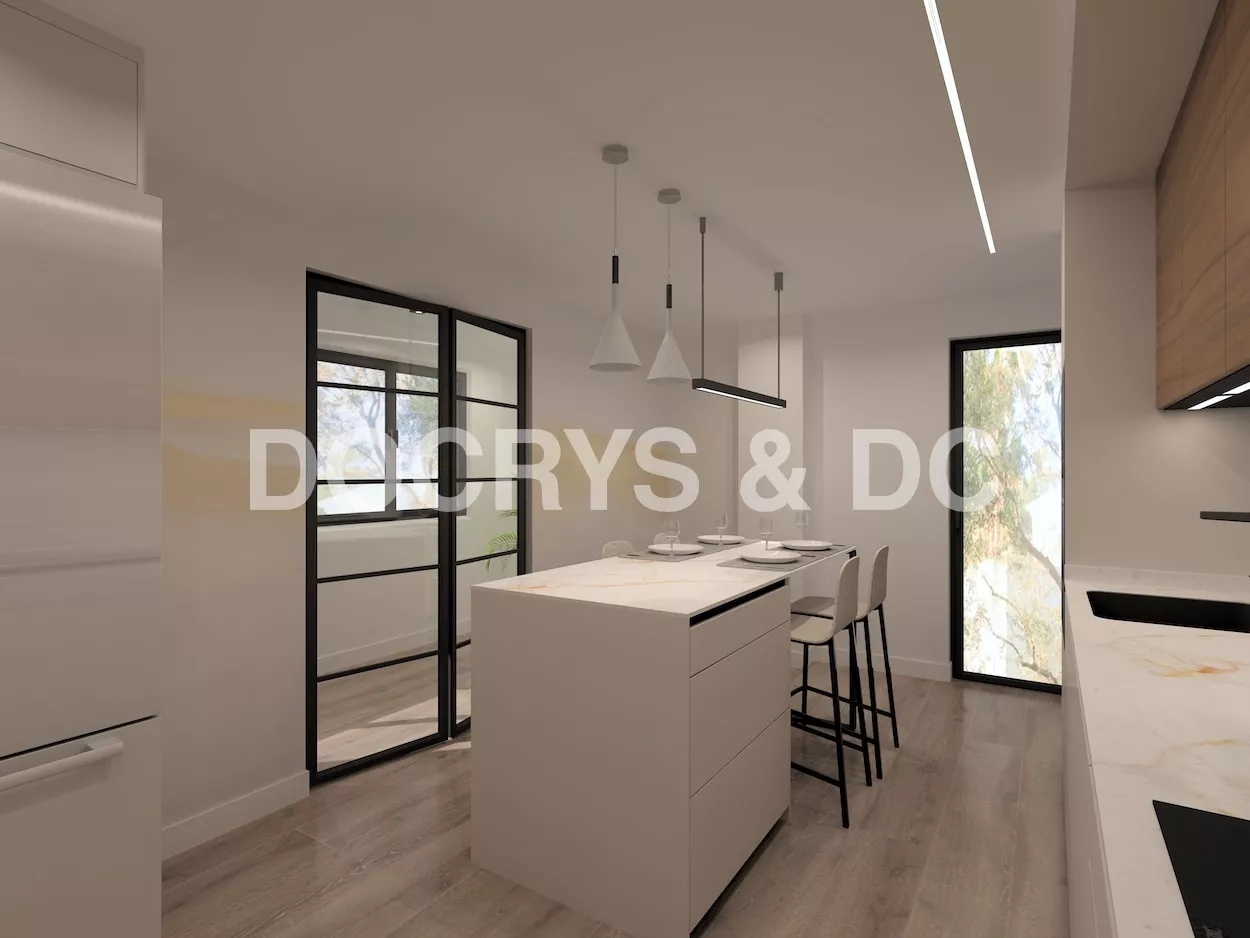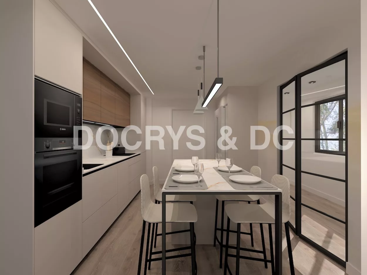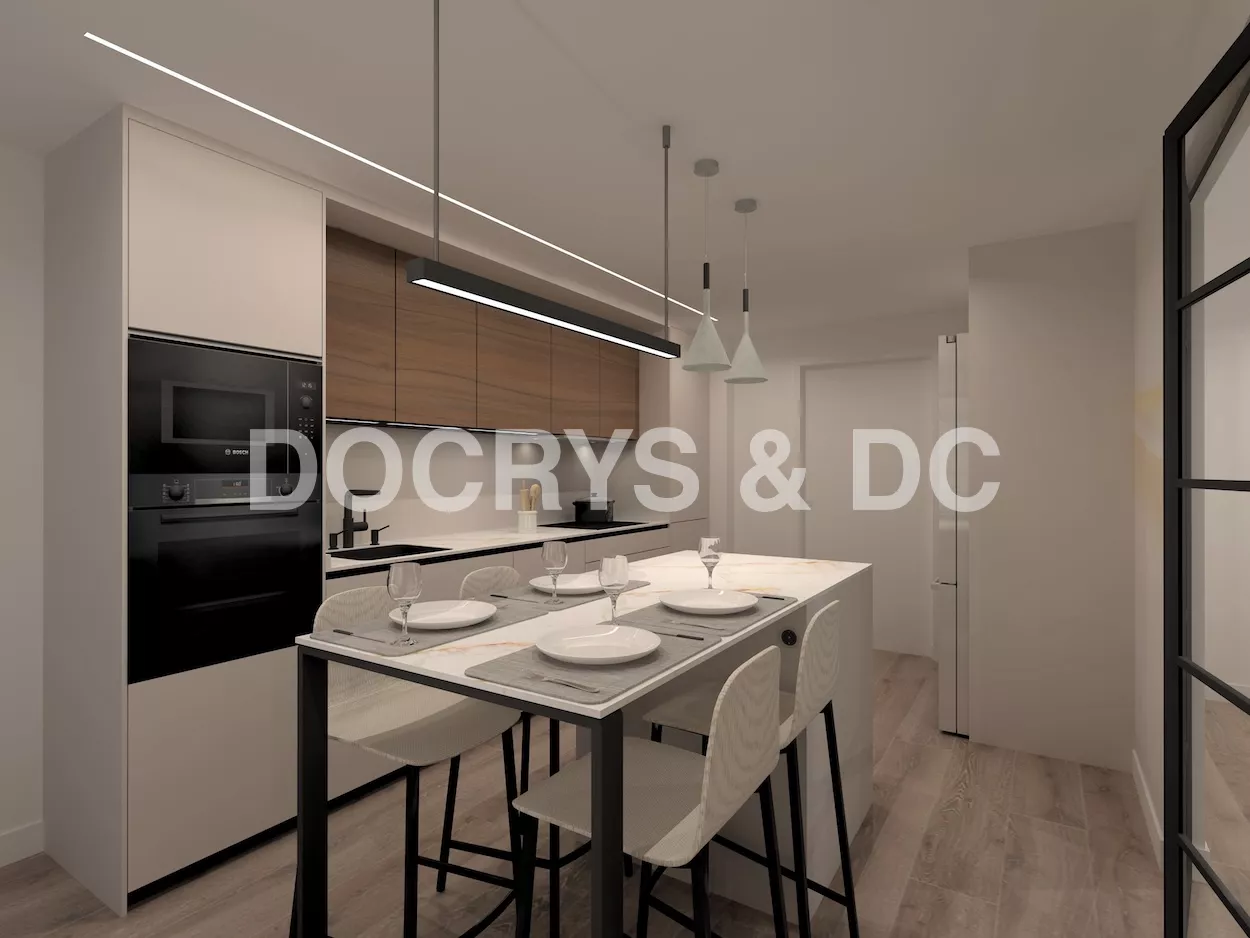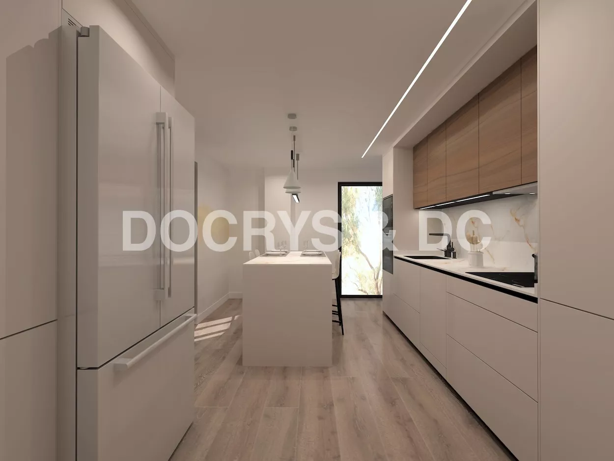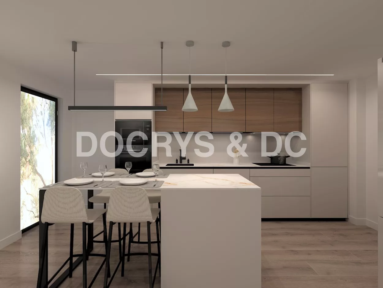 La iluminación técnica, cuidadosamente diseñada, combina líneas de luz empotradas en el techo con lámparas colgantes sobre la isla y un lineal suspendido sobre la mesa, proporcionando una iluminación general homogénea y una luz focal cálida para los momentos de reunión y cocina. El suelo, con efecto madera en tonos naturales, aporta continuidad visual y refuerza la calidez del conjunto.