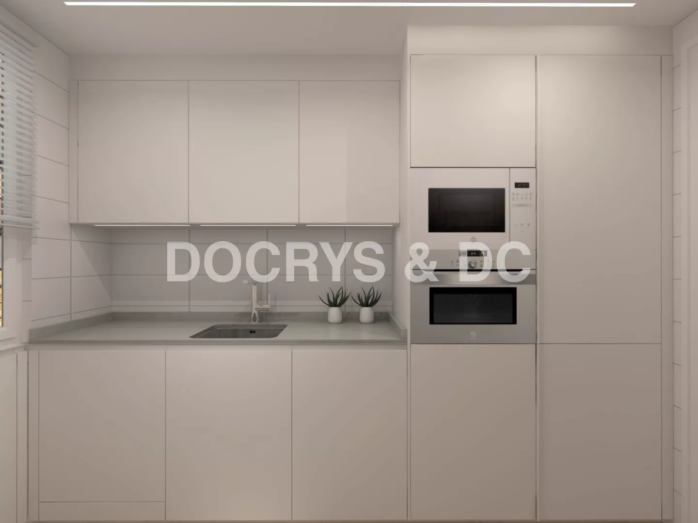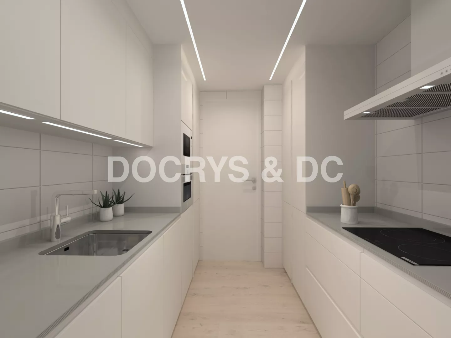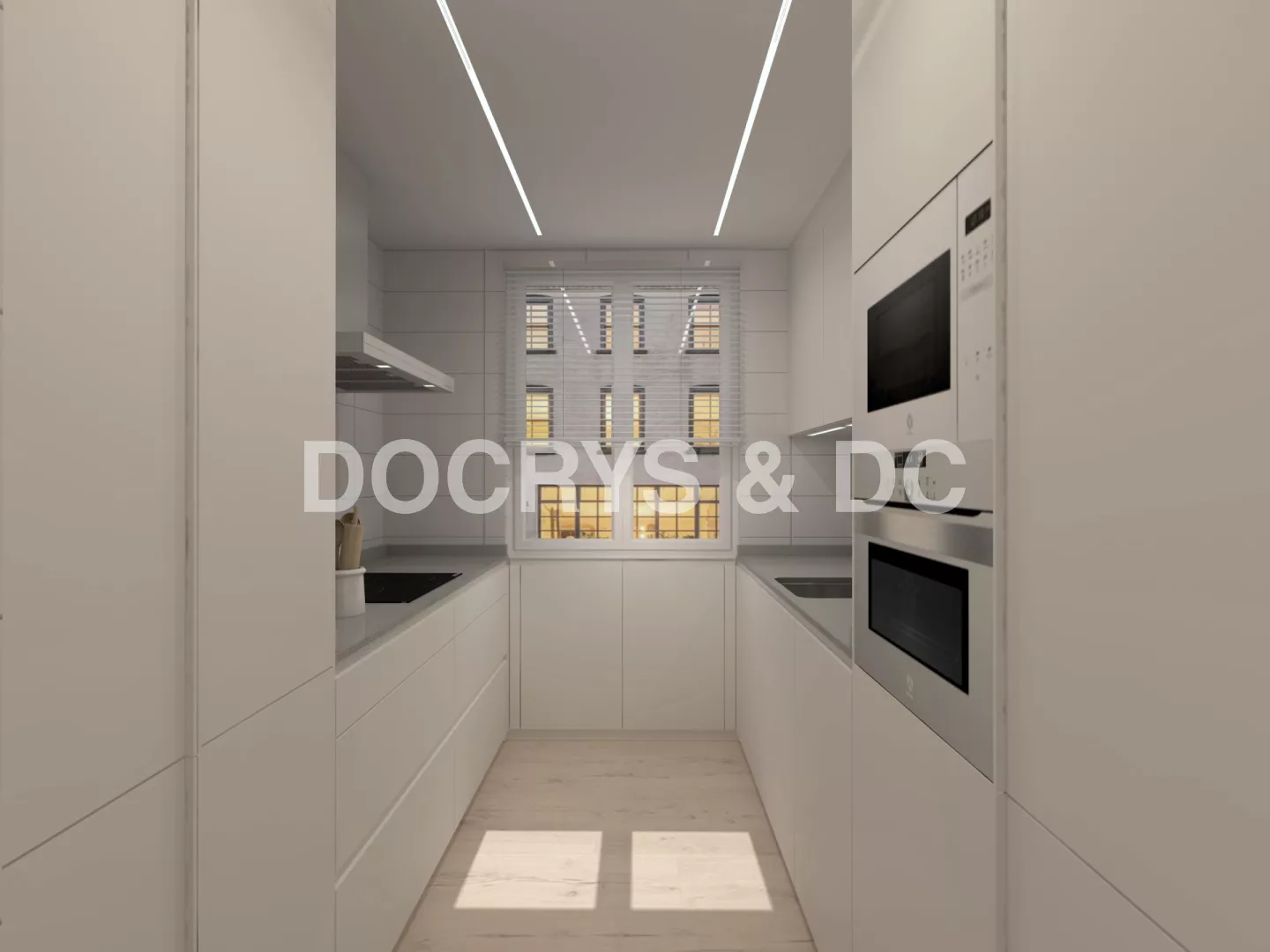 La distribución en línea doble permite trabajar de forma cómoda y eficiente: zona de aguas junto a la ventana para aprovechar la luz natural, electrodomésticos en columna y amplias superficies de apoyo a ambos lados. La iluminación integrada bajo los muebles altos y las líneas de luz en el techo añaden un toque contemporáneo que realza la claridad y sobriedad del conjunto.