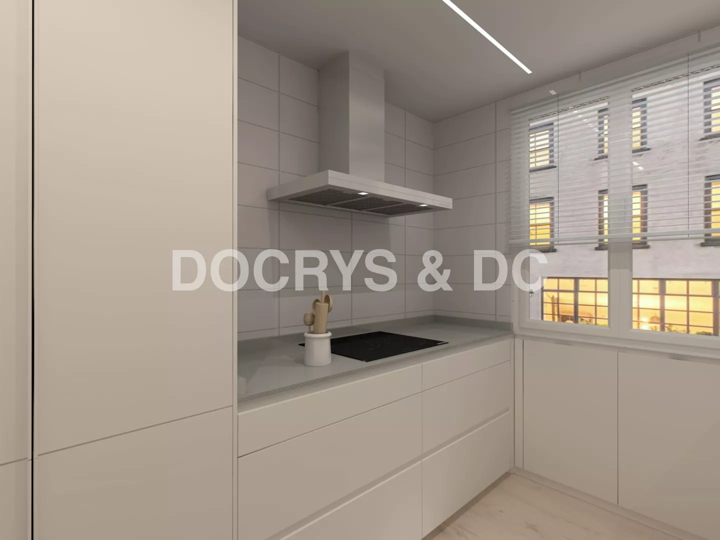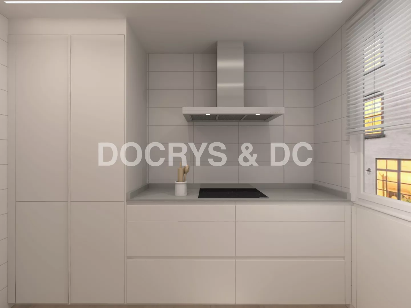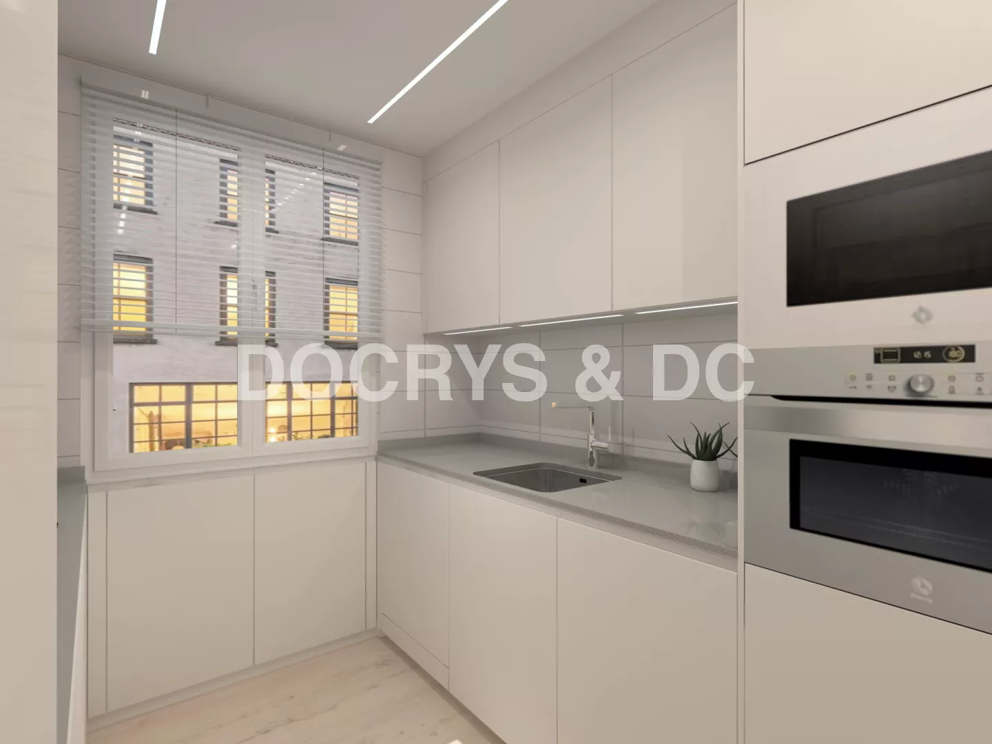 La distribución en línea doble permite trabajar de forma cómoda y eficiente: zona de aguas junto a la ventana para aprovechar la luz natural, electrodomésticos en columna y amplias superficies de apoyo a ambos lados. La iluminación integrada bajo los muebles altos y las líneas de luz en el techo añaden un toque contemporáneo que realza la claridad y sobriedad del conjunto.