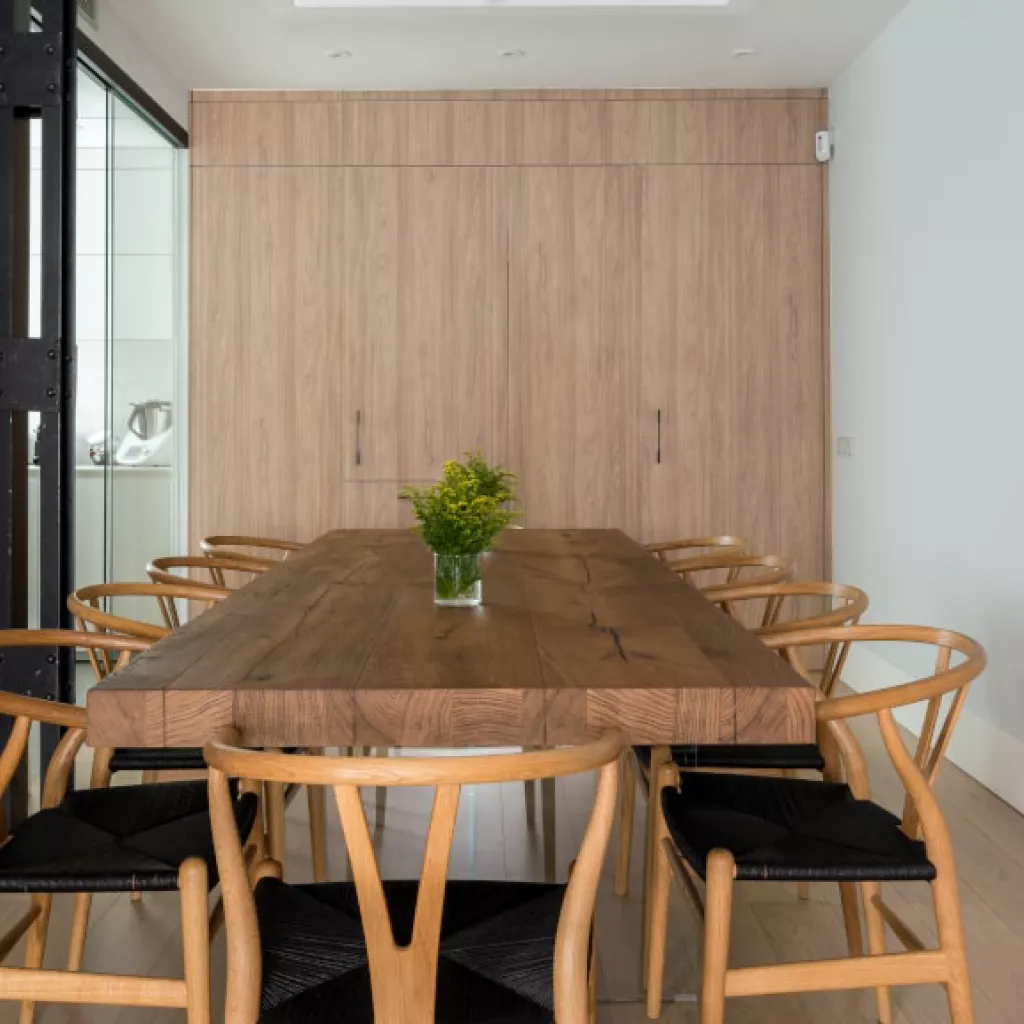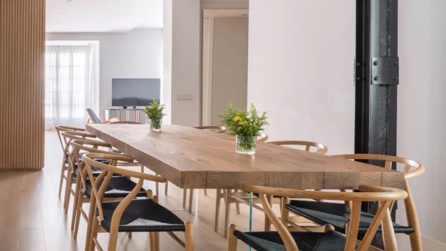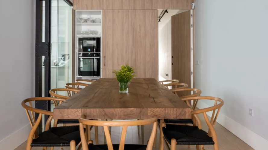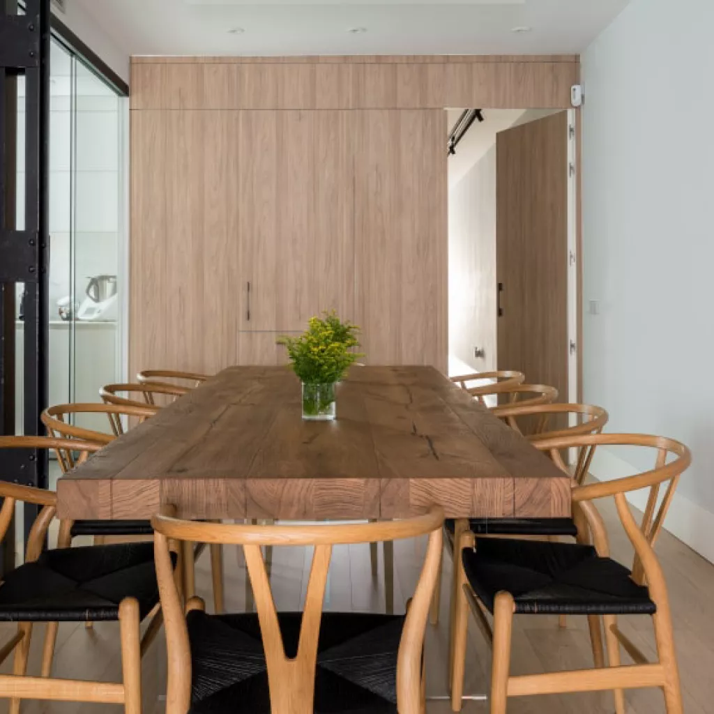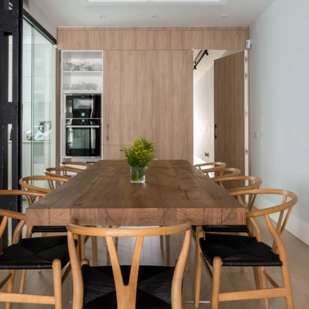 Por otro lado, un frente en la zona de comedor compuesto por columnas y gavetas en olmo claro con tirador en negro, una perfecta combinación para la zona de comedor y salón.