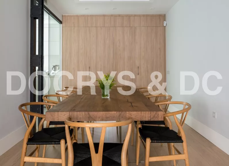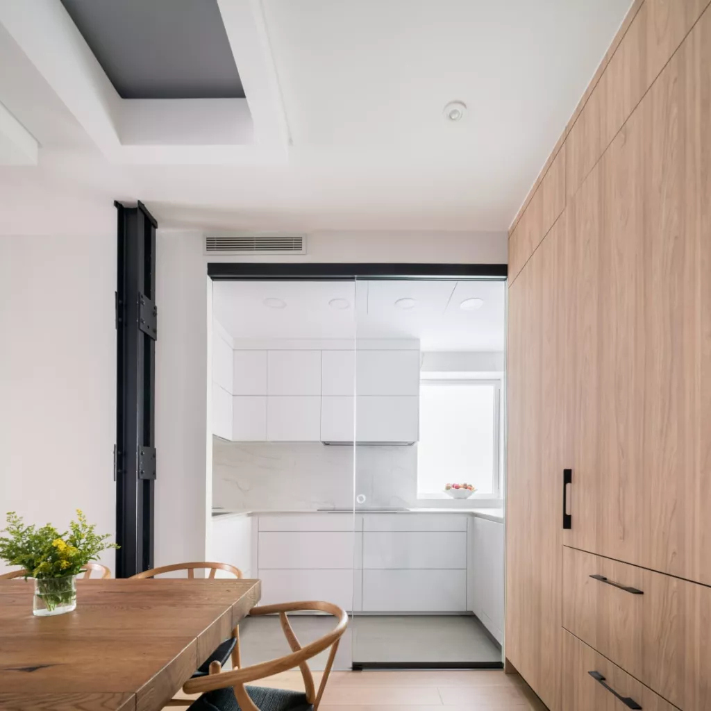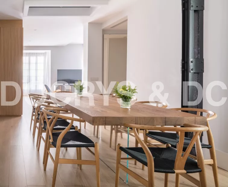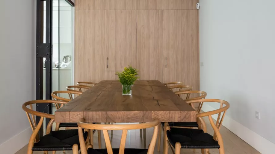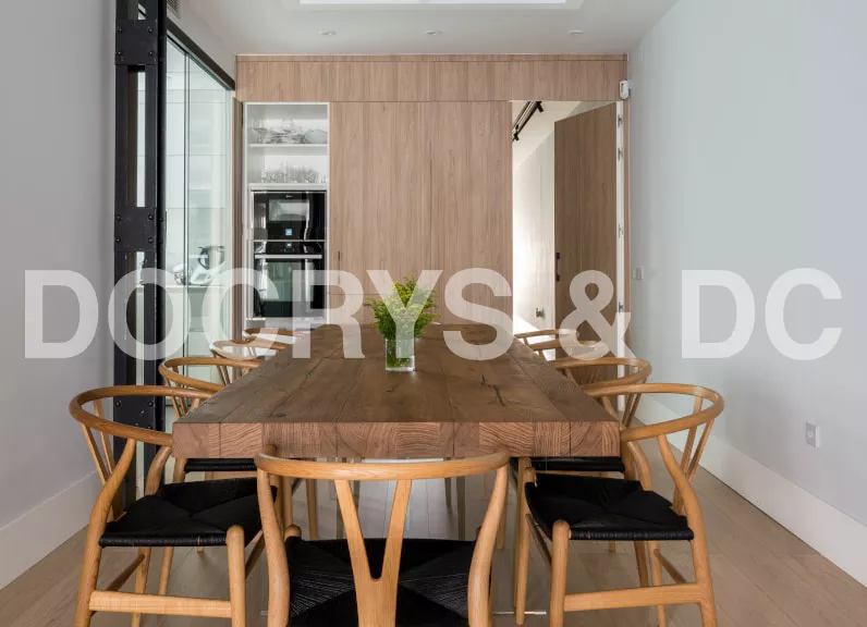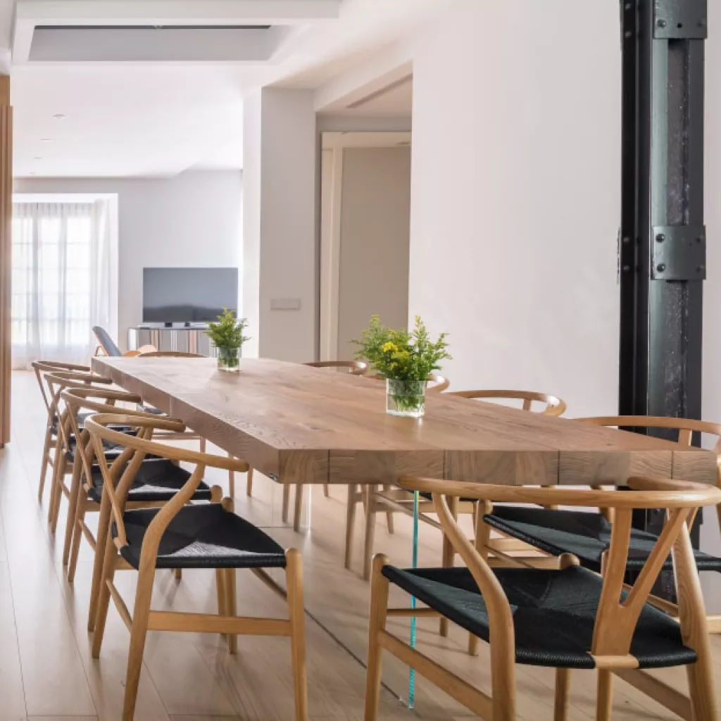 Por otro lado, un frente en la zona de comedor compuesto por columnas y gavetas en olmo claro con tirador en negro, una perfecta combinación para la zona de comedor y salón.