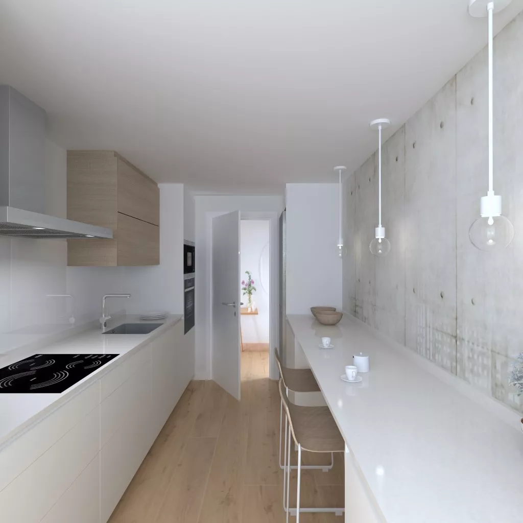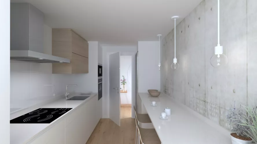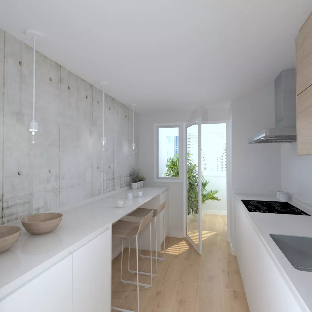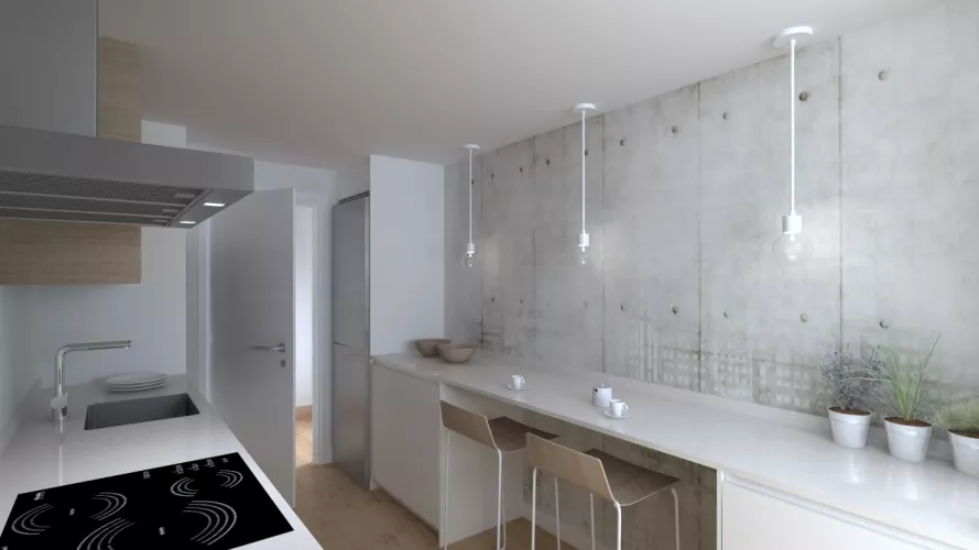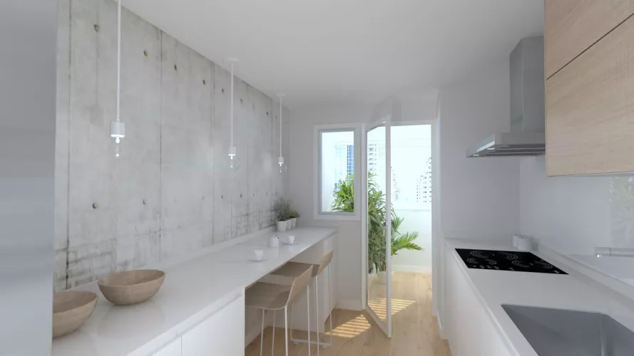 El triunfo de la sencillez en esta cocina Santos promete comodidad y funcionalidad para el usuario. Su mobiliario Line Estratificado Blanco Innsbruk y su encimera Silestone Blanco Zeus hace homenaje a una estética marcada por la austeridad y la pureza. Se compone de un frente y una barra con armarios bajos con el fin de aumentar el almacenaje. El toque distintivo lo aporta su papel pintado de tonos claros que remite relieve en la estancia, así como sus muebles altos en Roble que reportan una inmediata calidez. Se trata de una estancia estrecha pero que, combinando sus elementos de una manera sabia, nos deja con una cocina que da sensación de amplitud. Como veis, la elección de los colores es fundamental. Si se utilizan tonos y mobiliario claros, el efecto de espacio será mucho más grande. El papel pintado siempre es una opción moderna y fácil de limpiar para casi cualquier estancia de tu vivienda. Materiales que hemos utilizado en este proyecto 3d: LINE ESTRATIFICADO BLANCO INNSBRUK ENCIMERA SILESTONE BLANCO ZEUS Si estáis pensando en renovar vuestra cocina y queréis que nuestros expertos en arquitectura e interiorismo os asesoren, no dudéis en contactar con nosotros. ¡Estaremos encantados de ayudarte a crear tus ambientes soñados!