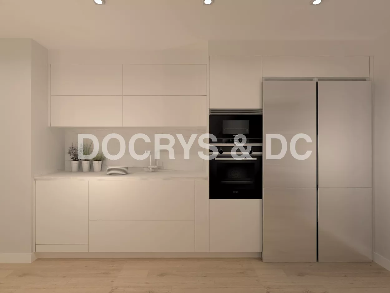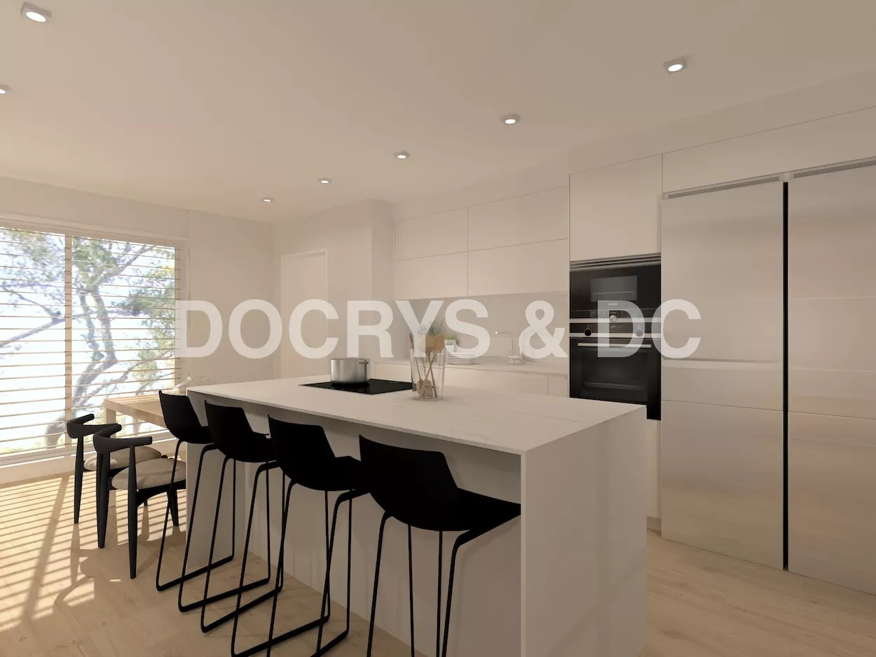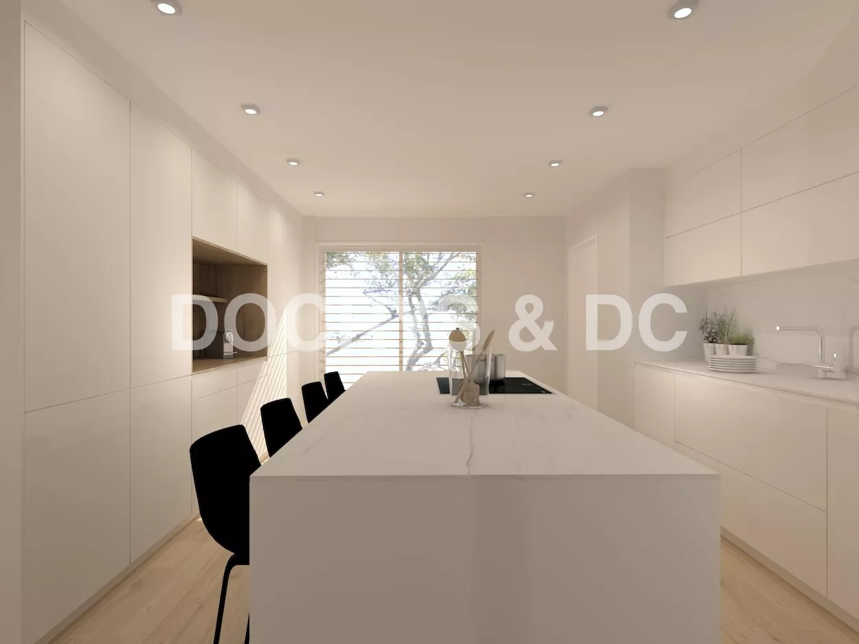Proyecto de Cocina Santos de alta gama, caracterizada por su diseño de doble frente y una isla central multifuncional que se erige como el corazón del espacio. La cocina presenta muebles blanco perla que se extienden hasta el techo, lo que aporta una sensación de amplitud y luminosidad. La encimera y la trasera, ambas realizadas en Neolith color Mont Blanc con un acabado Silk, proporcionan una estética bonita, elegante con una superficie duradera y de fácil mantenimiento.