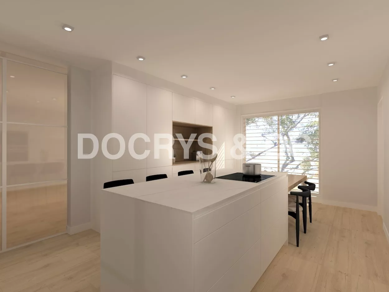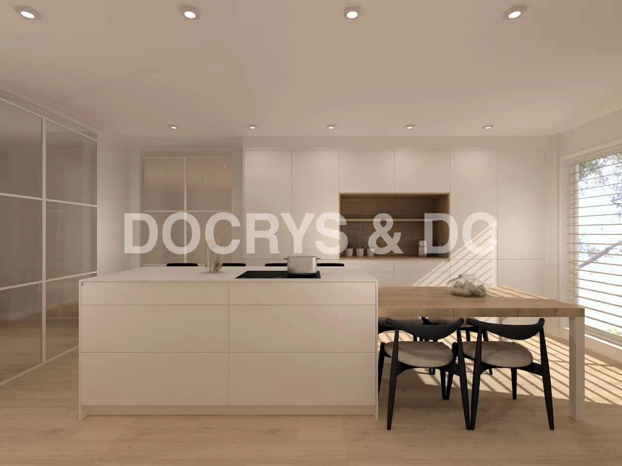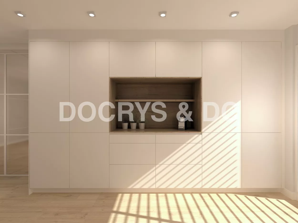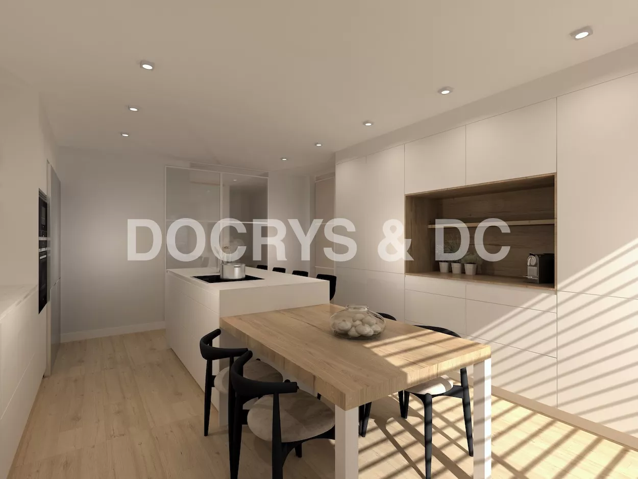 Proyecto de Cocina Santos de alta gama, caracterizada por su diseño de doble frente y una isla central multifuncional que se erige como el corazón del espacio. La cocina presenta muebles blanco perla que se extienden hasta el techo, lo que aporta una sensación de amplitud y luminosidad. La encimera y la trasera, ambas realizadas en Neolith color Mont Blanc con un acabado Silk, proporcionan una estética bonita, elegante con una superficie duradera y de fácil mantenimiento.