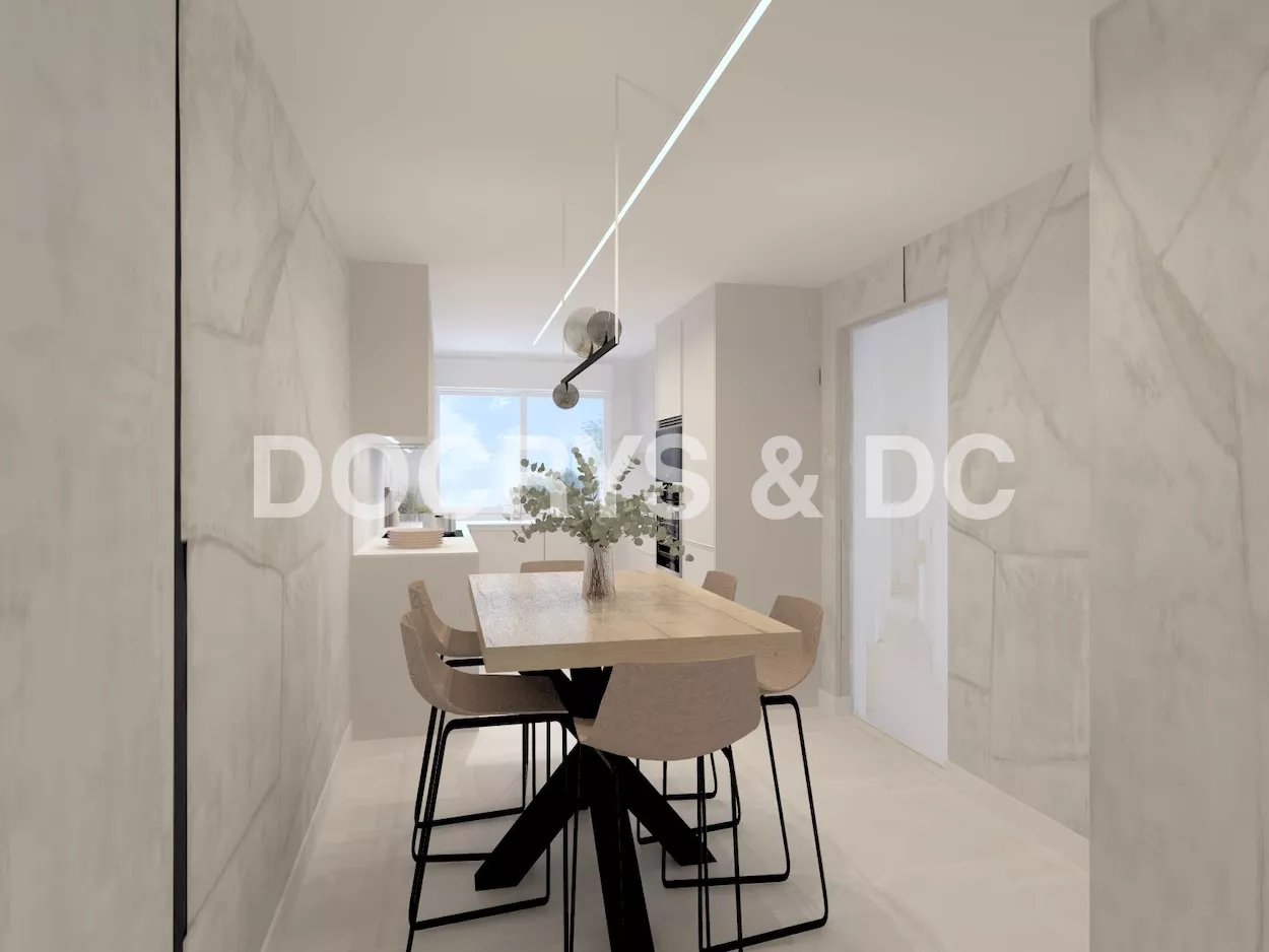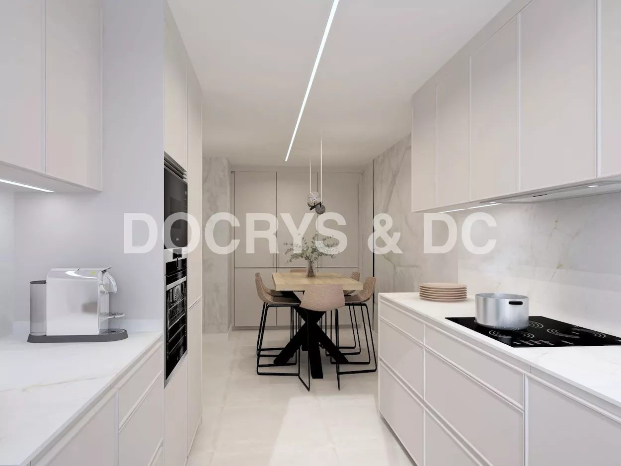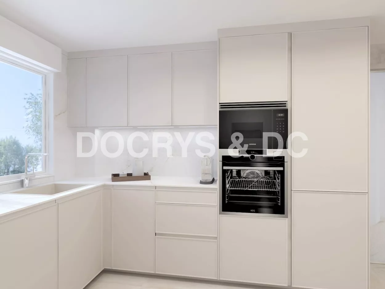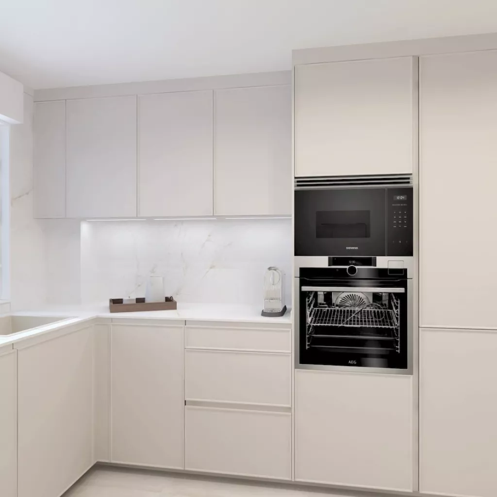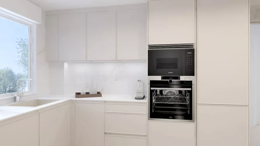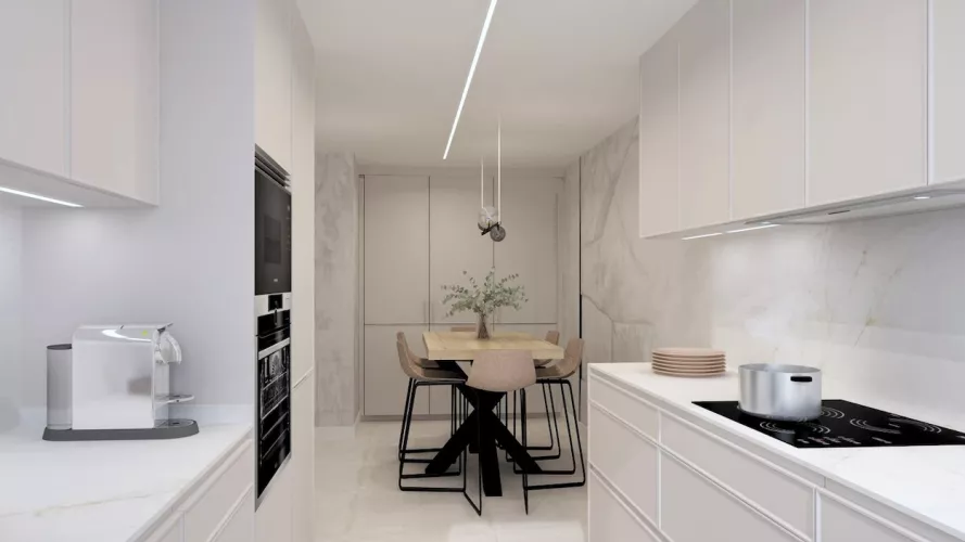 La cocina se completa con electrodomésticos integrados en columna, zona de aguas bajo encimera y un gran armario de suelo a techo destinado a almacenaje, todo pensado para mantener el orden y facilitar el día a día.
