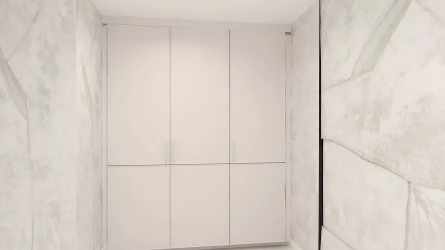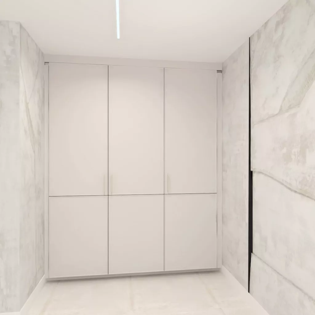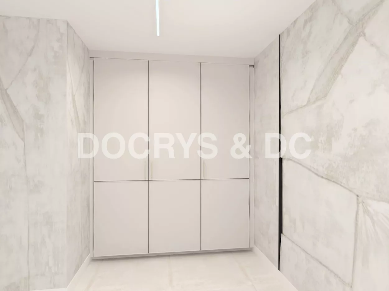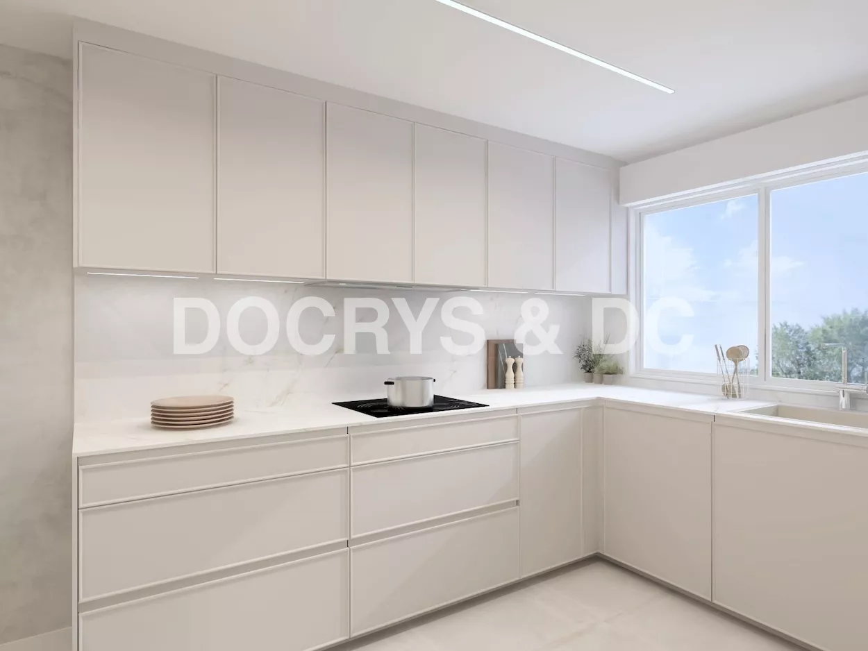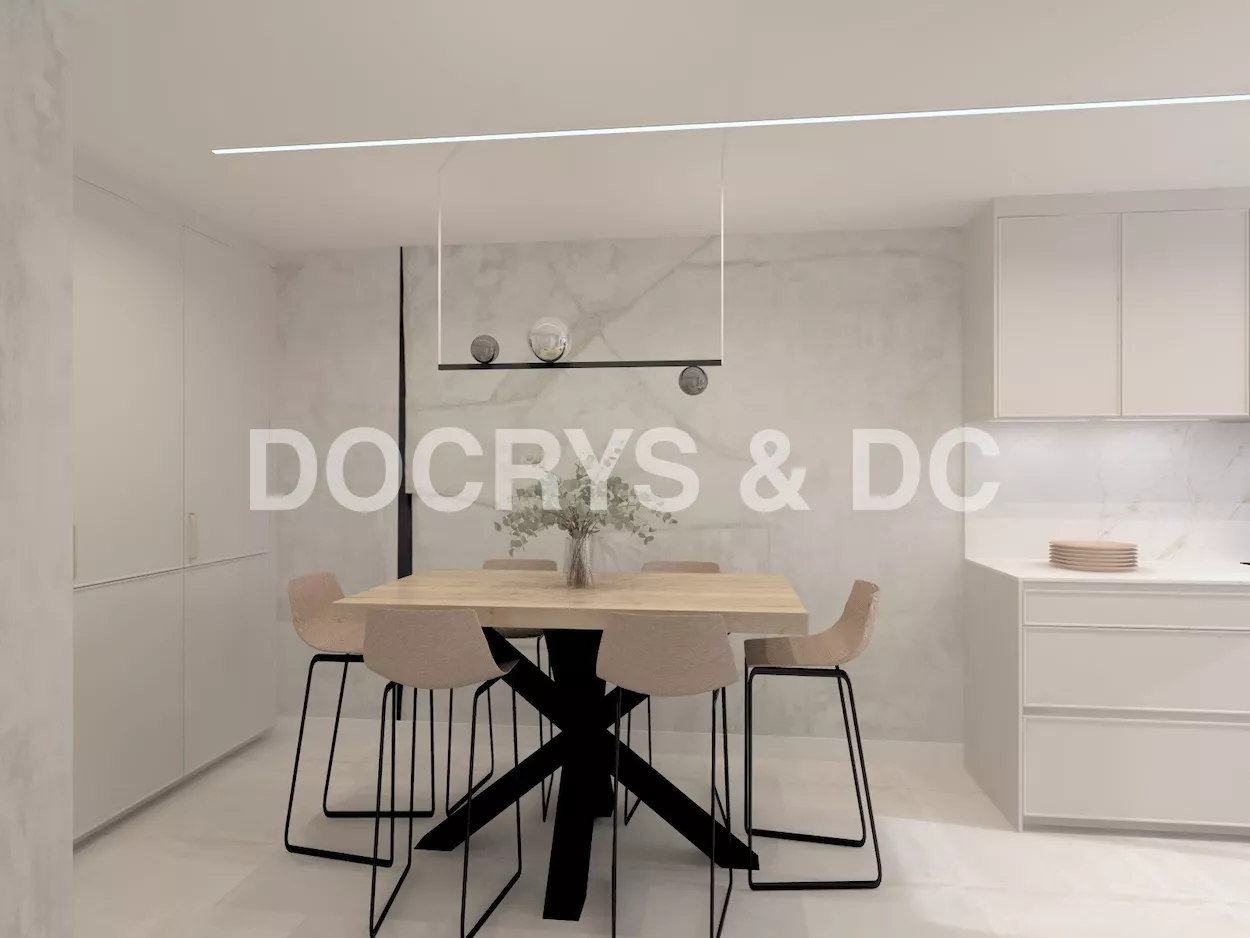 La cocina se completa con electrodomésticos integrados en columna, zona de aguas bajo encimera y un gran armario de suelo a techo destinado a almacenaje, todo pensado para mantener el orden y facilitar el día a día.