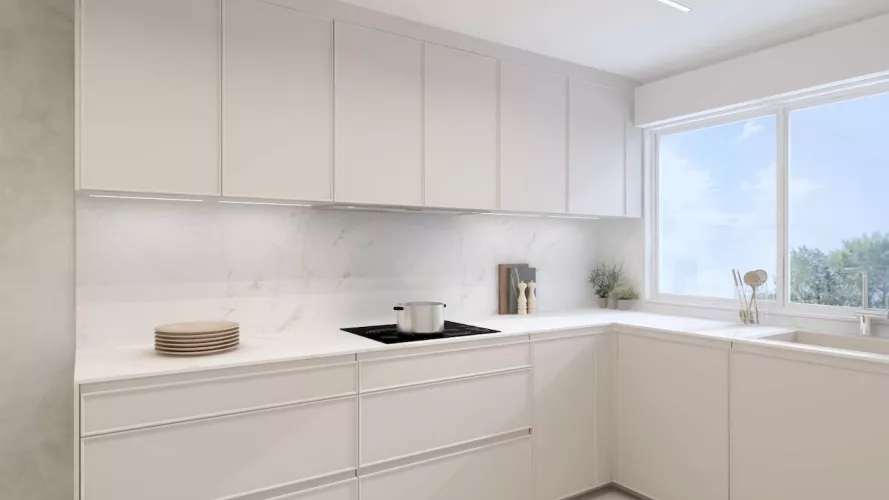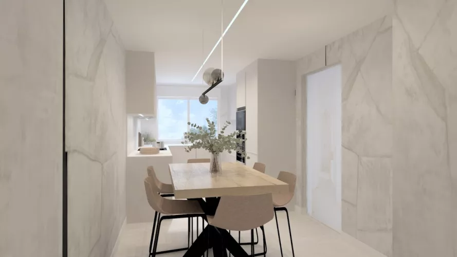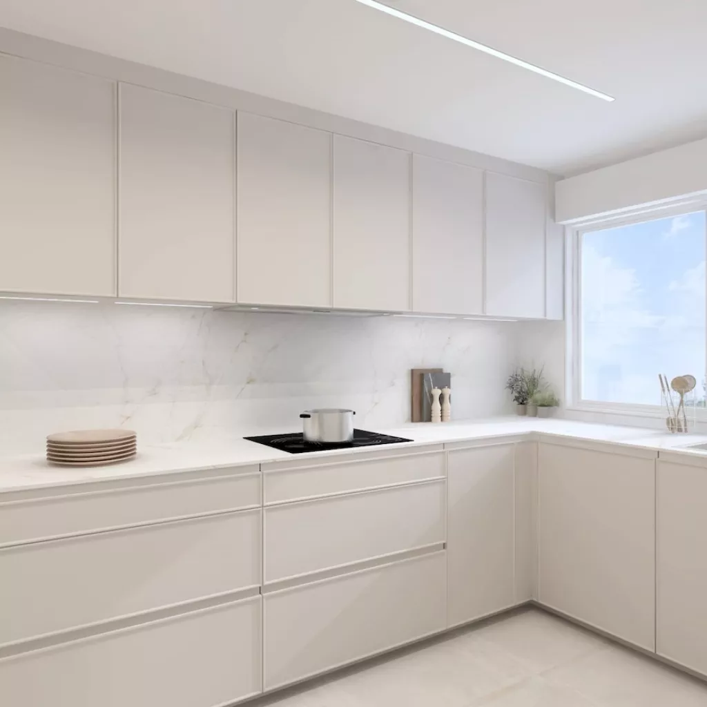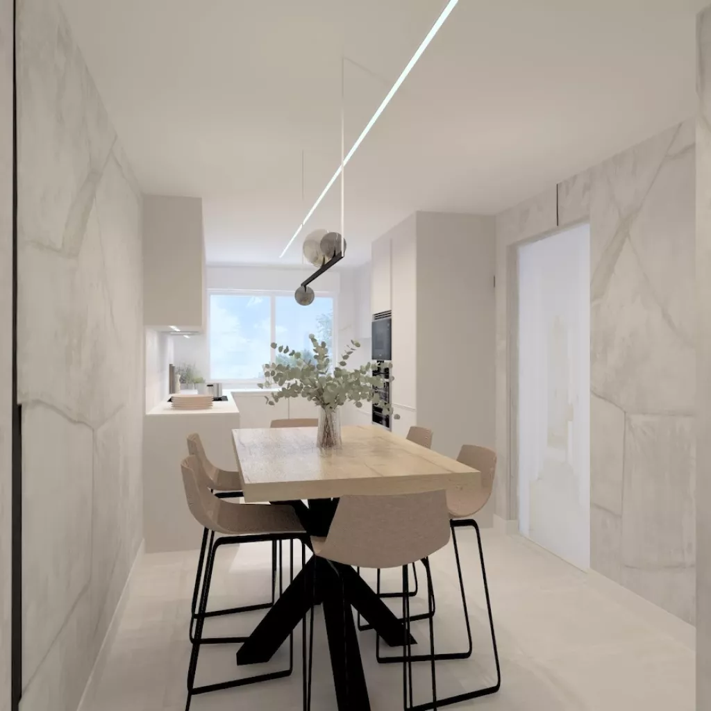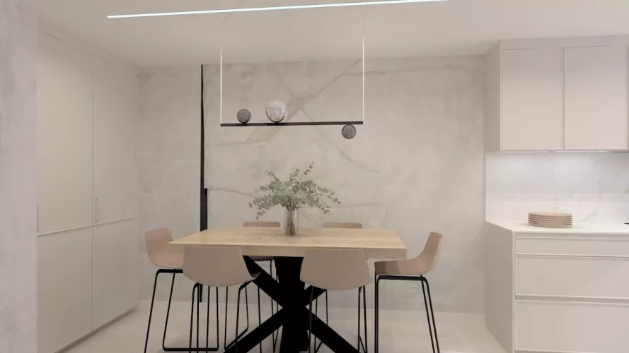 El mobiliario, en acabado arena mate y sin tiradores, refuerza la estética minimalista y limpia, mientras que la encimera y el frente porcelánico con suaves vetas introducen textura y sofisticación sin romper la armonía cromática. La continuidad visual se refuerza con un pavimento porcelánico en tono claro que unifica cocina y comedor.