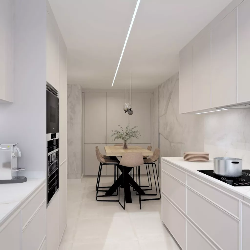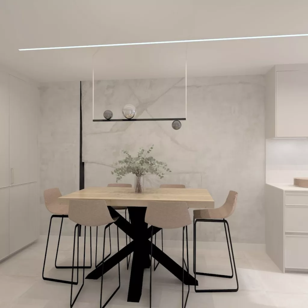 Una línea LED empotrada en el techo recorre toda la estancia, aportando iluminación general homogénea. Bajo los muebles altos, una iluminación cálida baña la encimera y realza los materiales, mejorando la experiencia de uso y el confort visual.