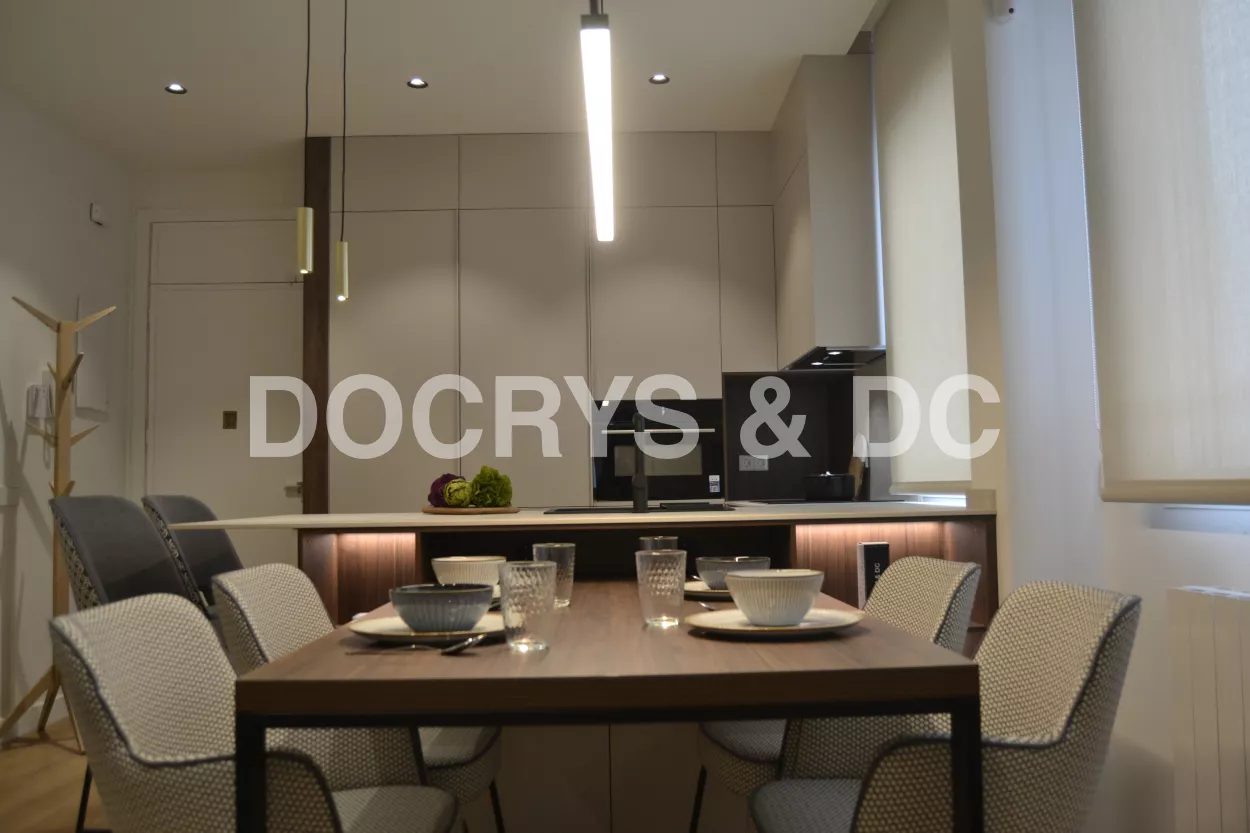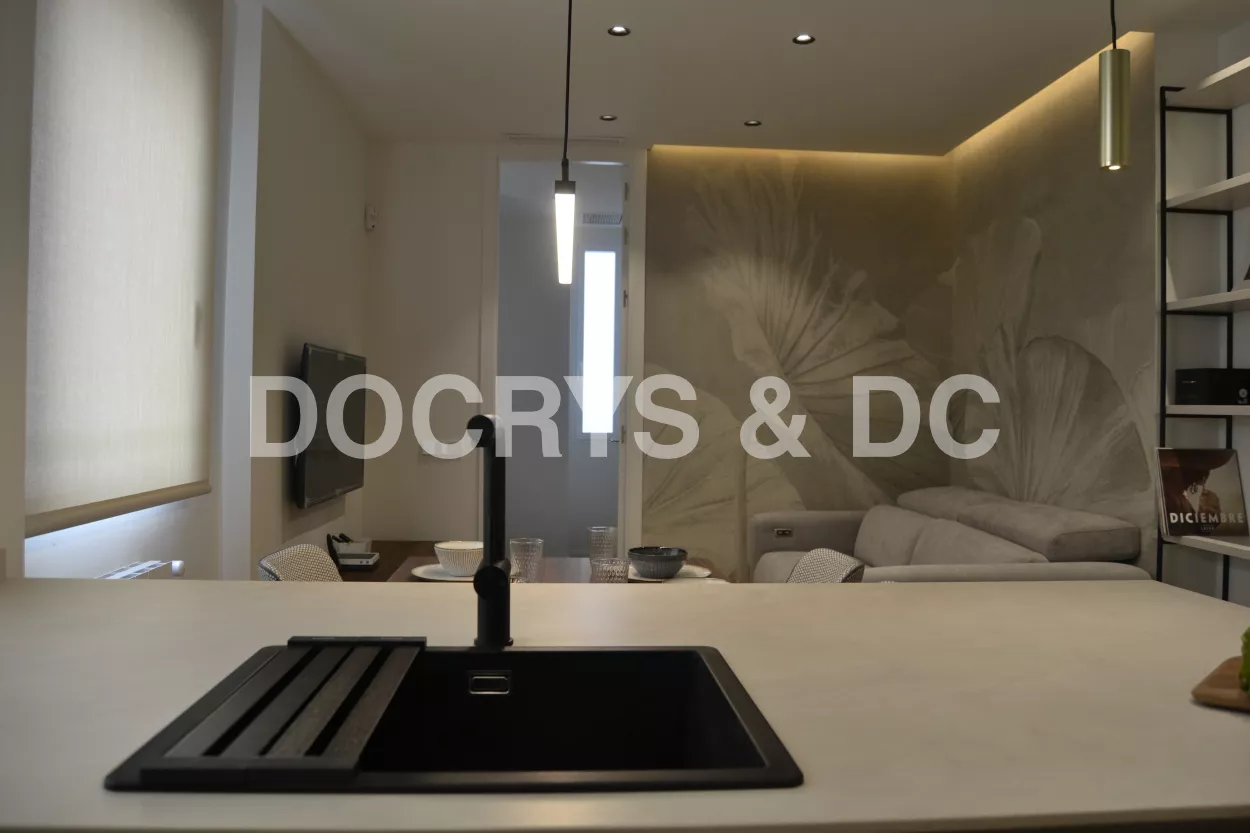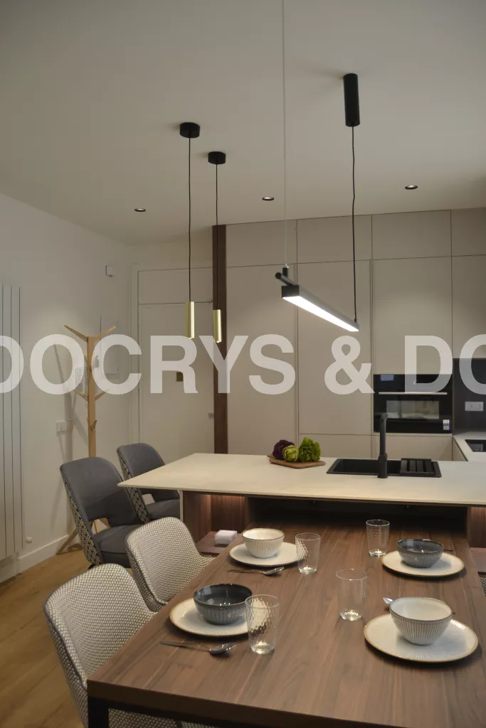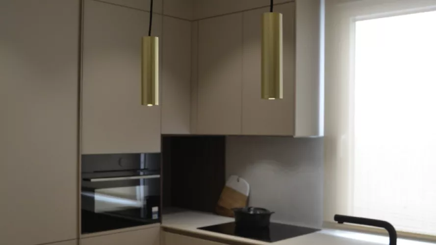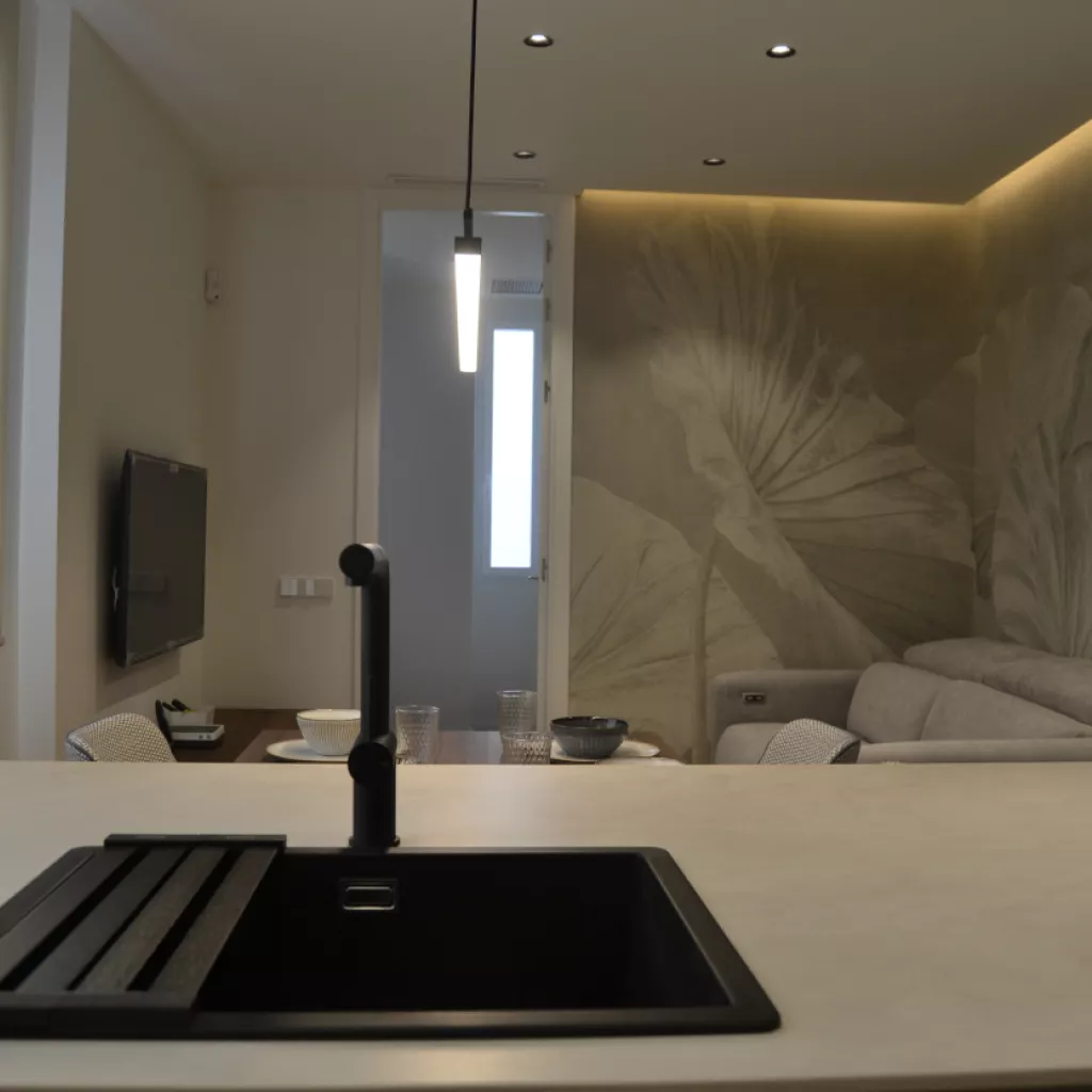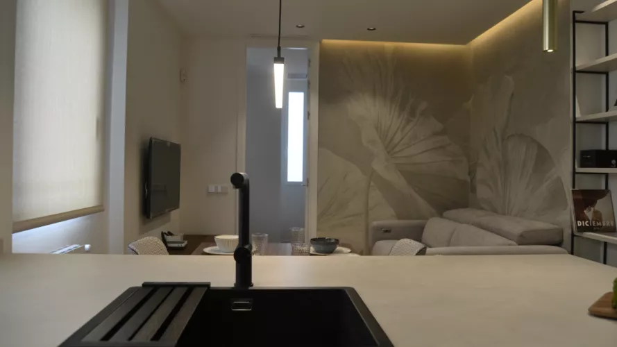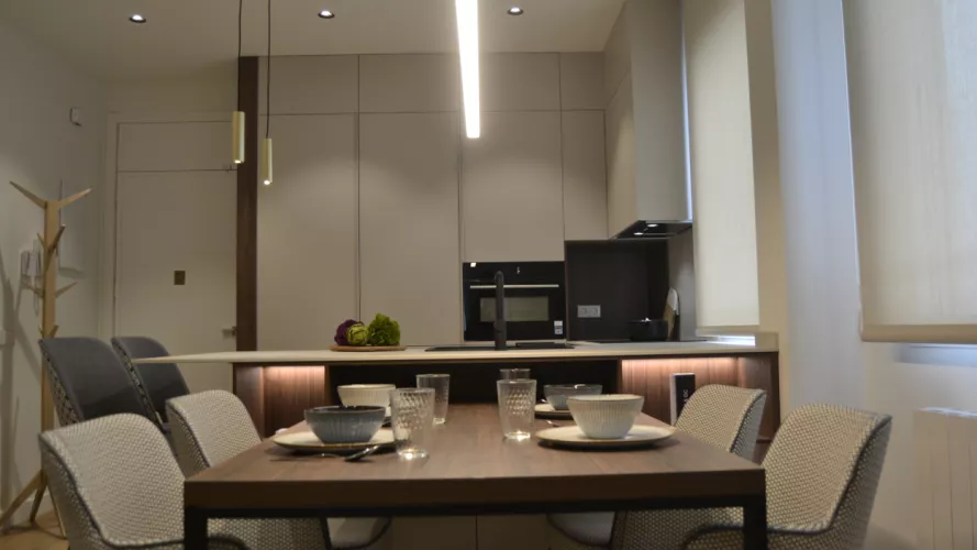 El material es estratificado y la encimera Dekton en color Albarium 22, lo que aporta gran amplitud y permite que la luz refracte y por lo tanto la cocina sea mucho más luminosa. Creando un ambiente de modernidad y lujo.