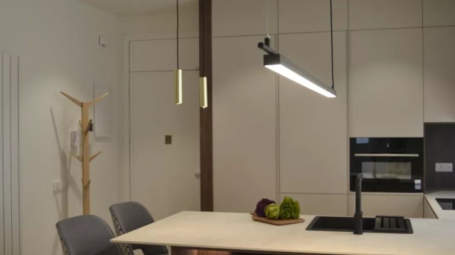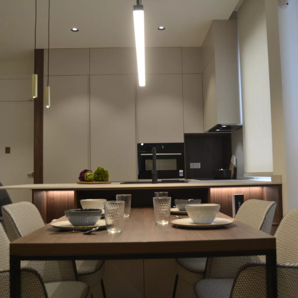 Por otro lado tenemos la hornacina, los bajos y la columna en color Nogal Tierra con la veta en vertical. Esto añade gran calidez a la cocina, lo que la hace mucho más acogedora, a esto se le añade la iluminación en tono cálido (3000K) tanto en la lámpara de colgar sobre la mesa como en las tiras led bajo mueble dentro de la propia península.