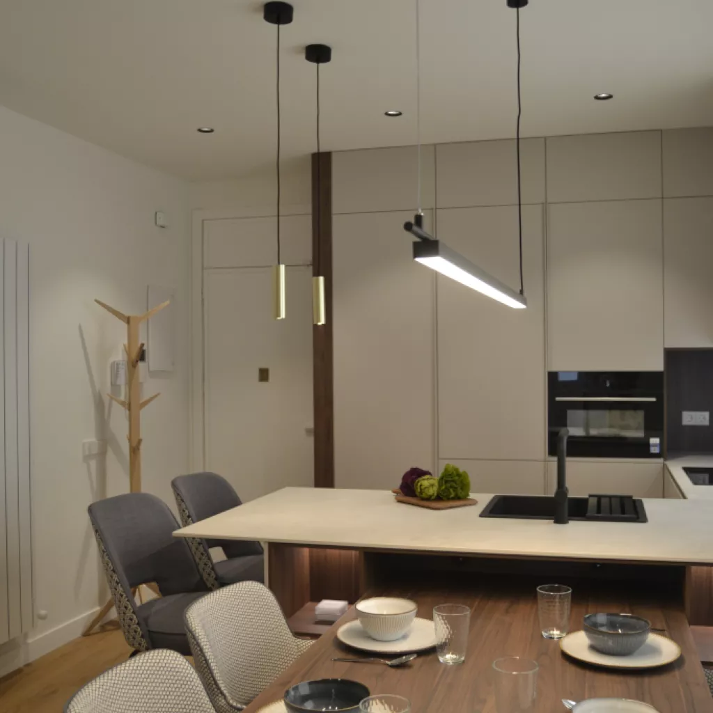 Cuenta con dos frentes y una península, en el primer frente encontramos congelador y frigorífico panelados para aportar mayor estilo a la cocina ocultando los electrodomésticos, a continuación vemos el horno encastrado, lo que continúa con la misma línea fina de la cocina. En el siguiente frente tenemos la placa de inducción y la campana Novy totalmente oculta.