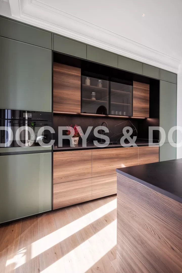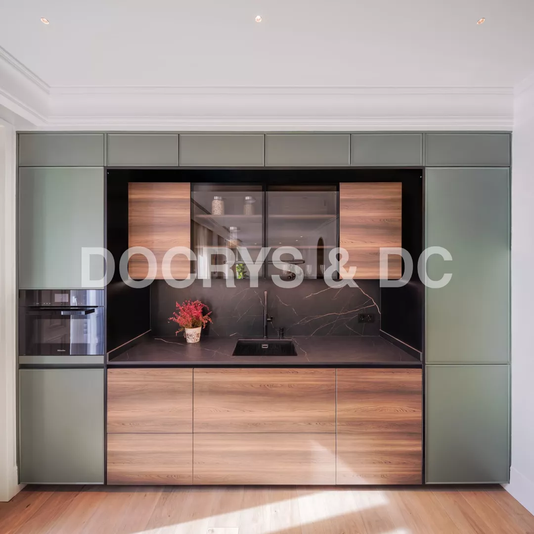 El mobiliario combina frentes de madera natural con módulos lacados en verde salvia, un tono que aporta a la cocina frescura y distinción. La encimera y el frente en piedra oscura veteada aportan a la cocina contraste y profundidad, mientras que por otro lado, los módulos altos con vidrios ahumados y marco negro aportan ligereza visual.