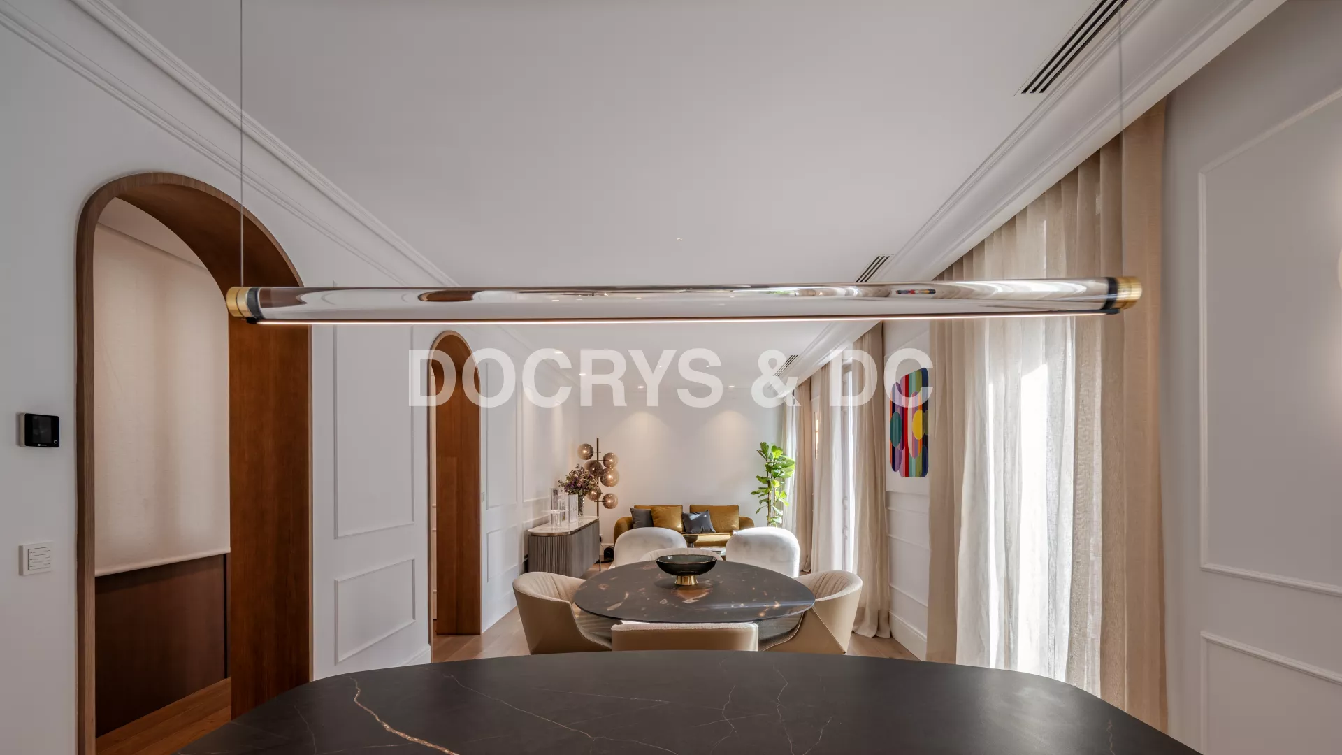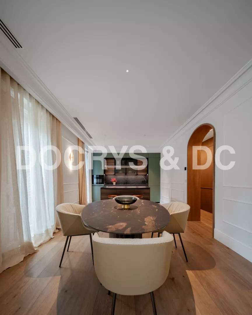 El conjunto se completa con una zona de comedor con una mesa de la marca LAGO en cristal mate con sillas tapizadas en tonos neutros, la cual crea una transición perfecta hacia el salón.