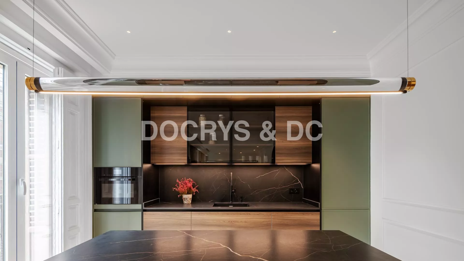 La iluminación juega un papel esencial en este proyecto, una lámpara colgante lineal suspendida sobre la isla, la cual aporta un guiño contemporáneo a la estancia, los apliques laterales y la luz natural que entra por los balcones aportan además una atmósfera acogedora y sofisticada.