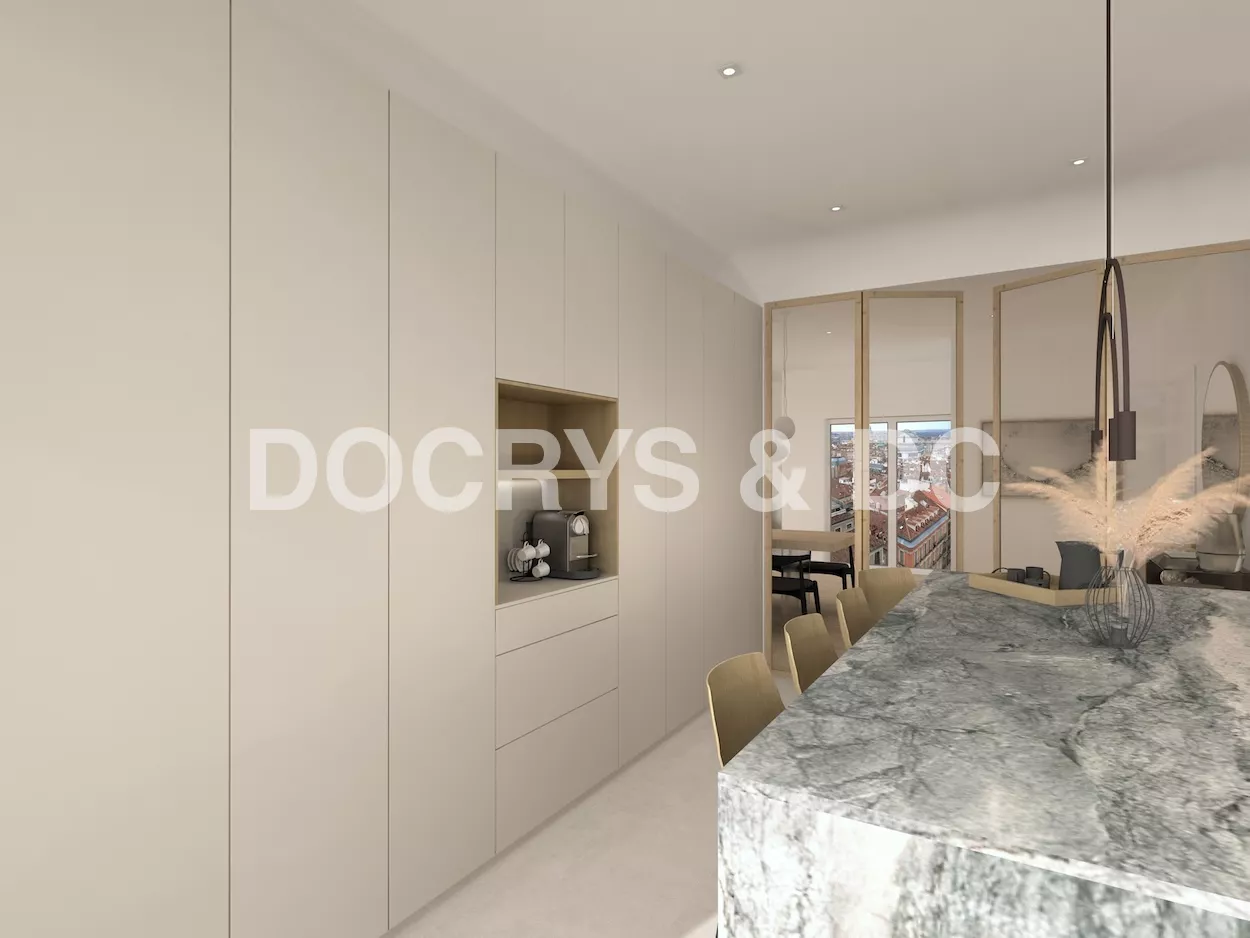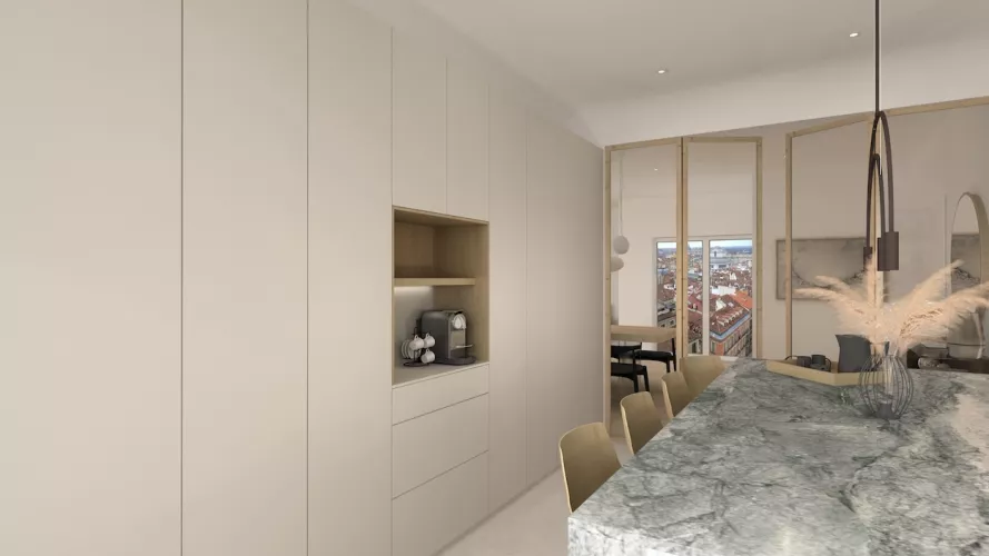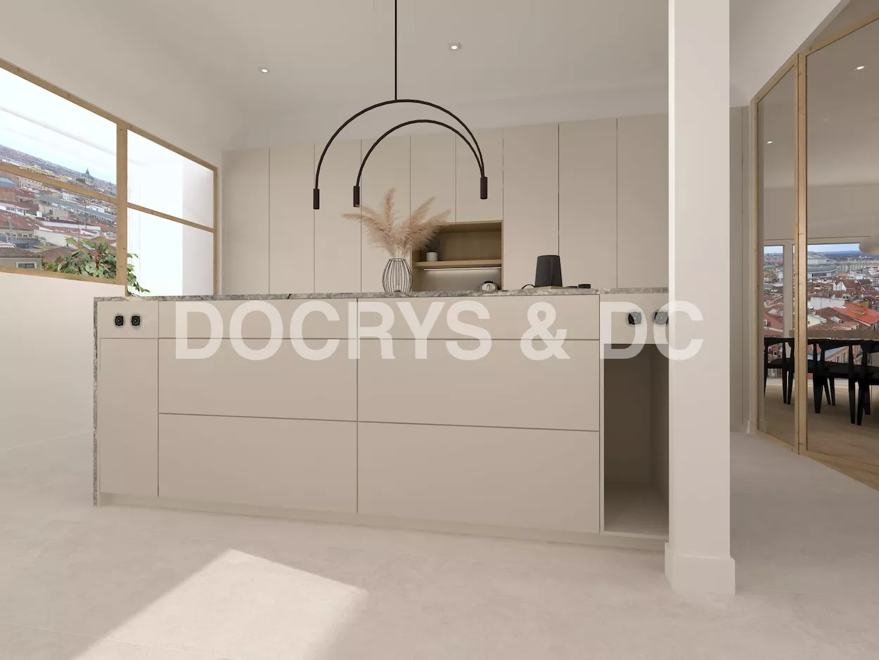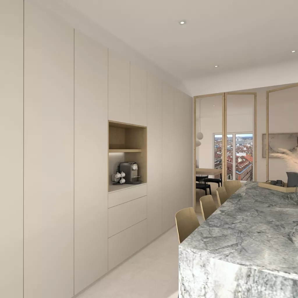 La cocina la hemos divivido del salón a través de una puerta de cristal con el marco de madera, de la misma manera del lado contrario a la cocina,dando salida a una hermosa terazza al centro de la ciudad.