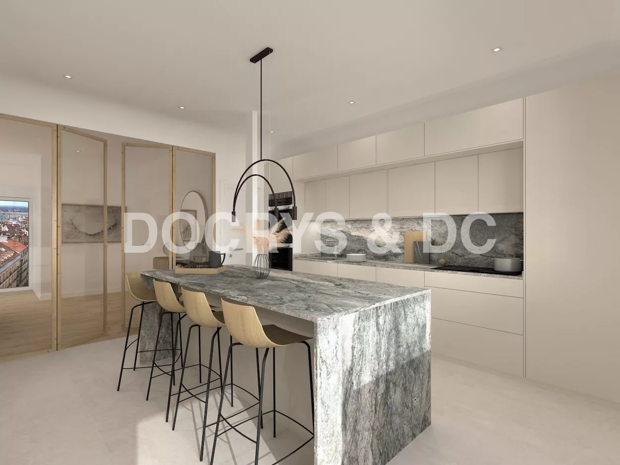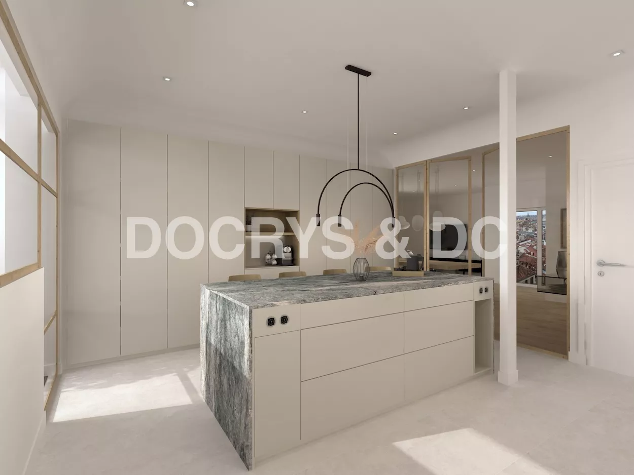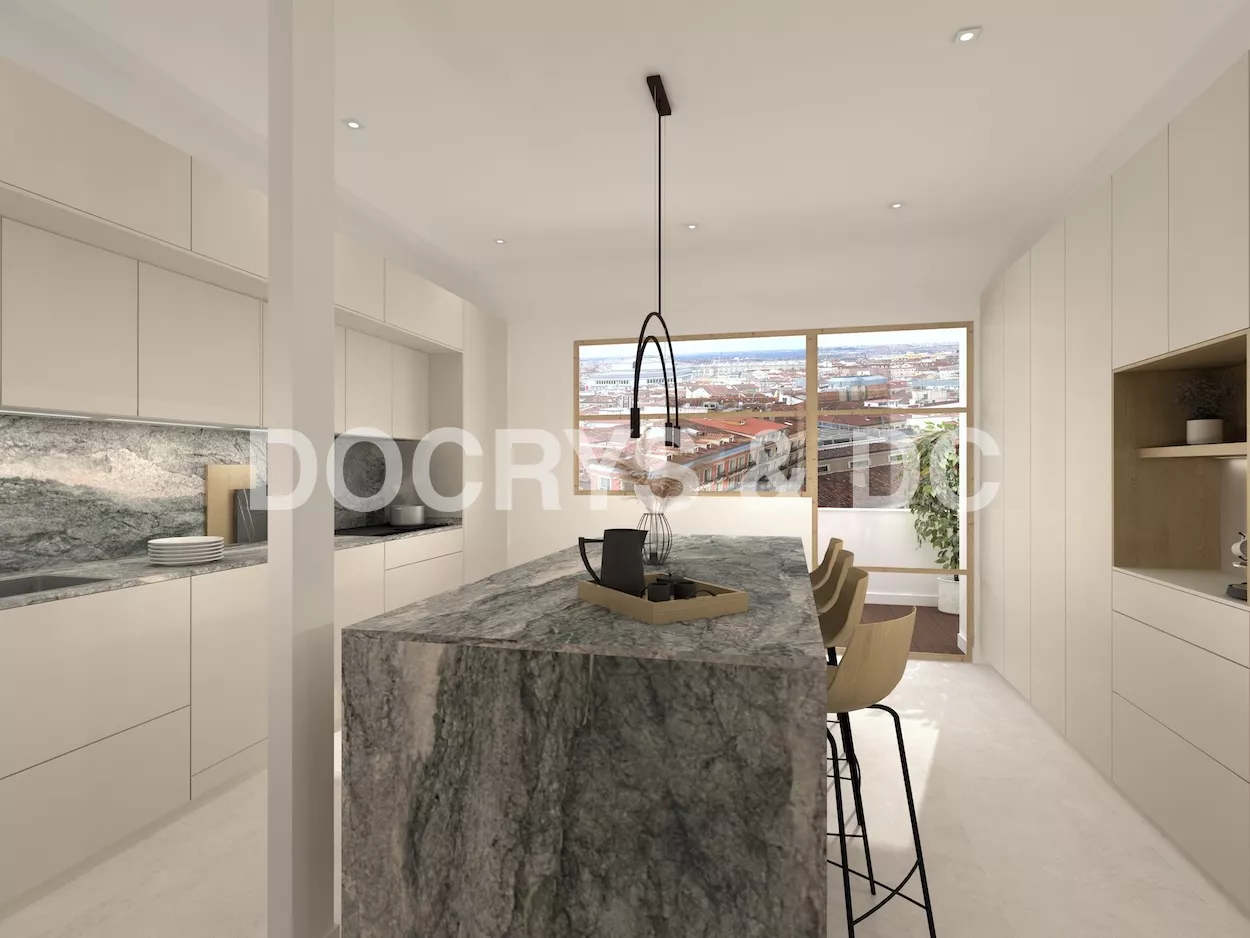La cocina la hemos divivido del salón a través de una puerta de cristal con el marco de madera, de la misma manera del lado contrario a la cocina,dando salida a una hermosa terazza al centro de la ciudad.