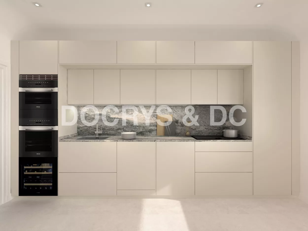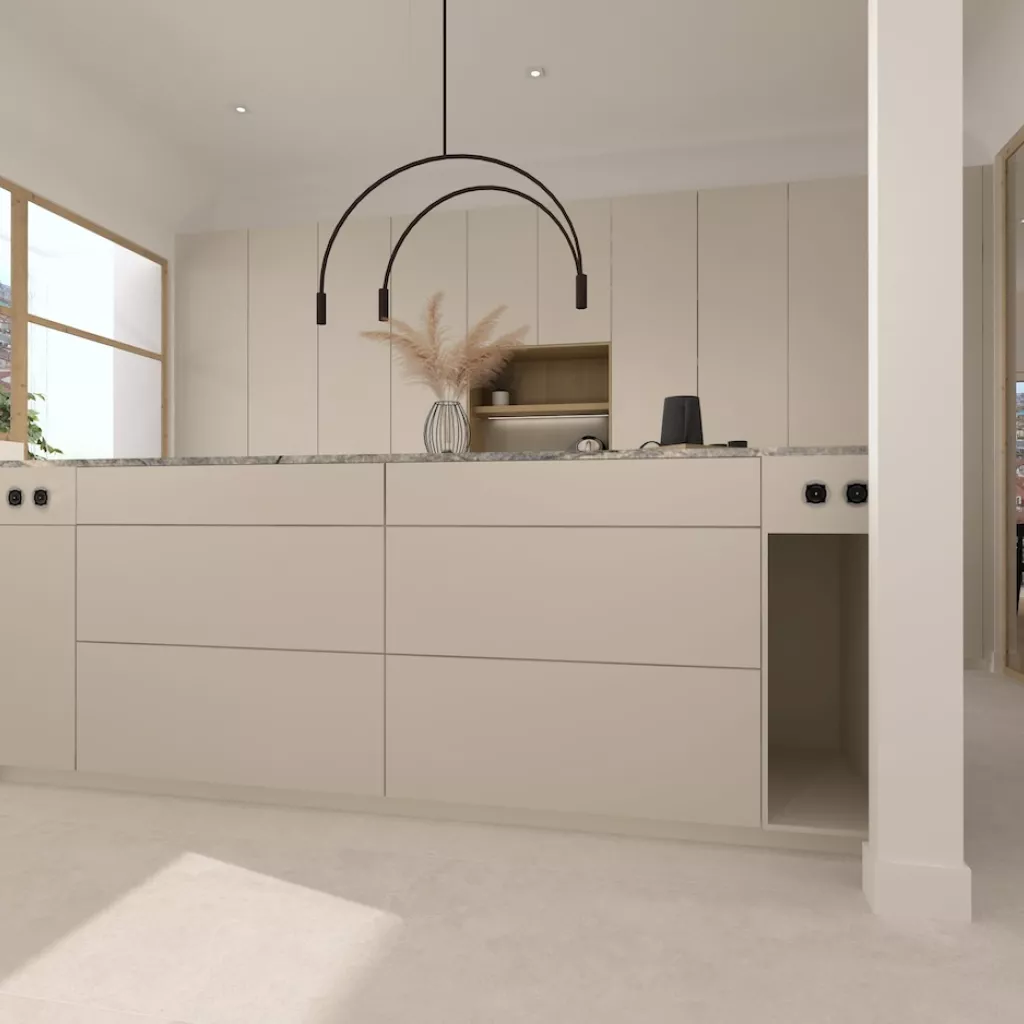 Precioso proyecto de una Cocina Santos, diseñado para combinar elegancia en todo su esplendor. Este espacio cuenta con muebles tanto bajos como altos en un mismo color de blanco perla, que aportan amplitud al ambiente, y la impresionante isla central que debido a su color, destaca entre todo lo demás dispuesto en esta estancia. Esta isla está elaborada con encimera y costados en el material Naturamia del modelo Aquabella, acabado Vintage creado de cuarcita verde natural. Este material no solo ofrece una estética refinada, sino también durabilidad y resistencia, perfectas para el uso diario.