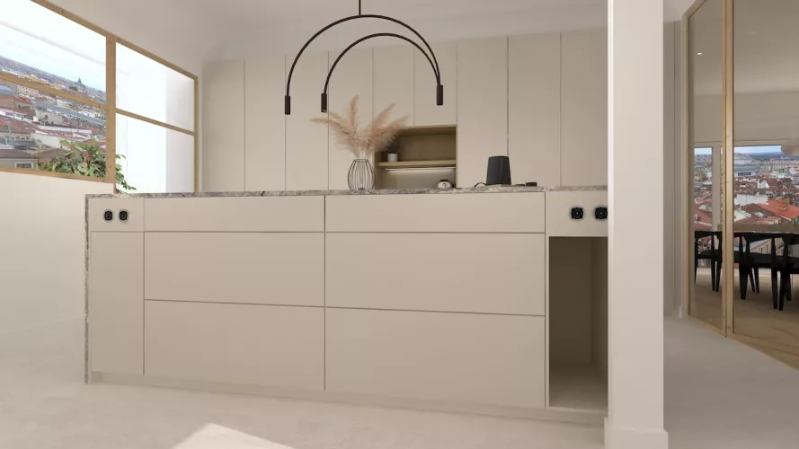 Debajo de la isla, hemos dispuesto un amplio espacio de almacenamiento. Esta solución optimiza el uso del espacio, permitiendo mantener la cocina ordenada y todos los utensilios a mano. Los muebles altos crean formas más delicadas y esbeltas, que pueden crear diseños más elegantes y distinguidos.