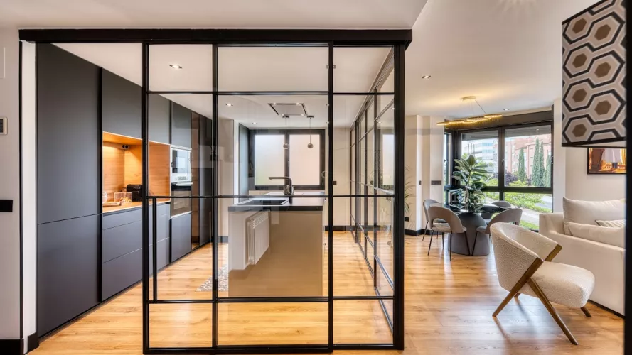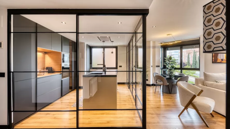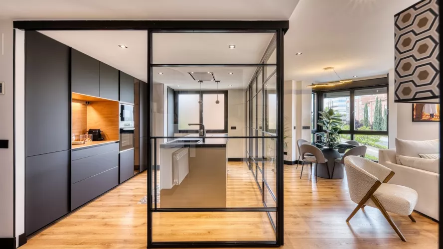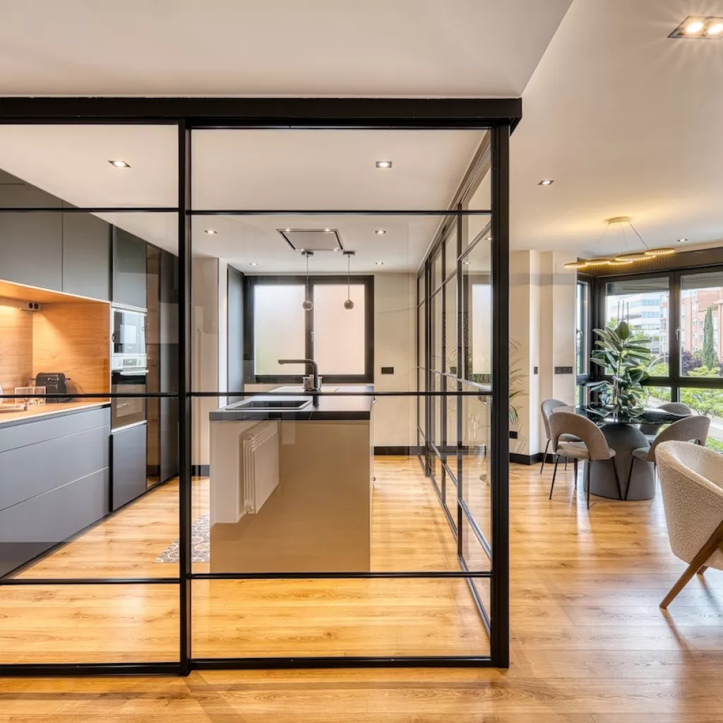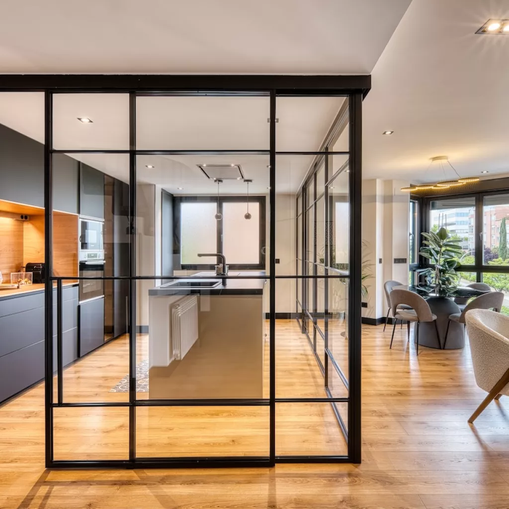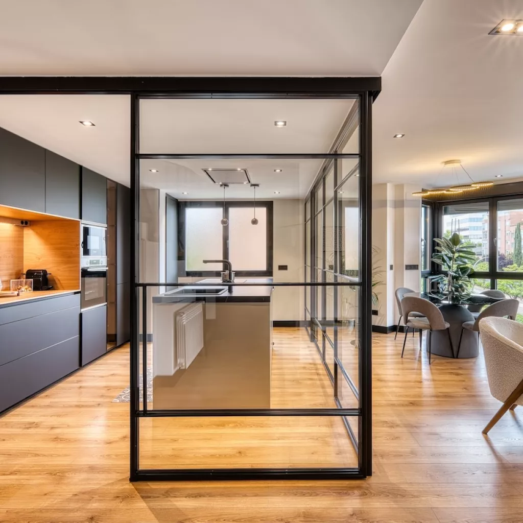 La cocina está cerrada en todo su perímetro por puertas correderas de cristal transparente con marcos de aluminio negro. Estas puertas no solo permiten que la luz natural fluya libremente, sino que también ofrecen la flexibilidad de abrir o cerrar el espacio según sea necesario. Esta característica es ideal para mantener la cocina conectada con el resto de la vivienda o para cerrarla cuando se requiere mayor privacidad.