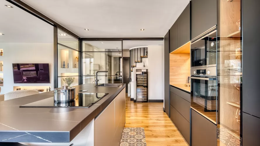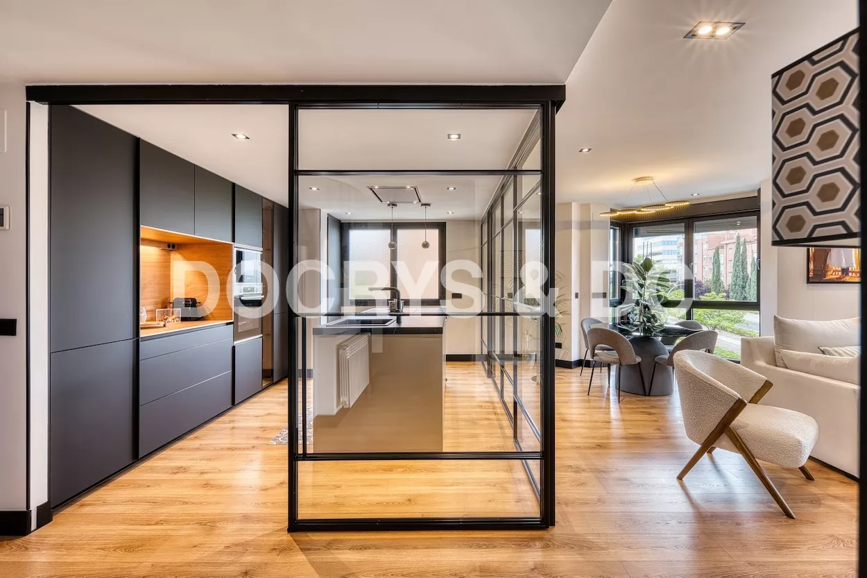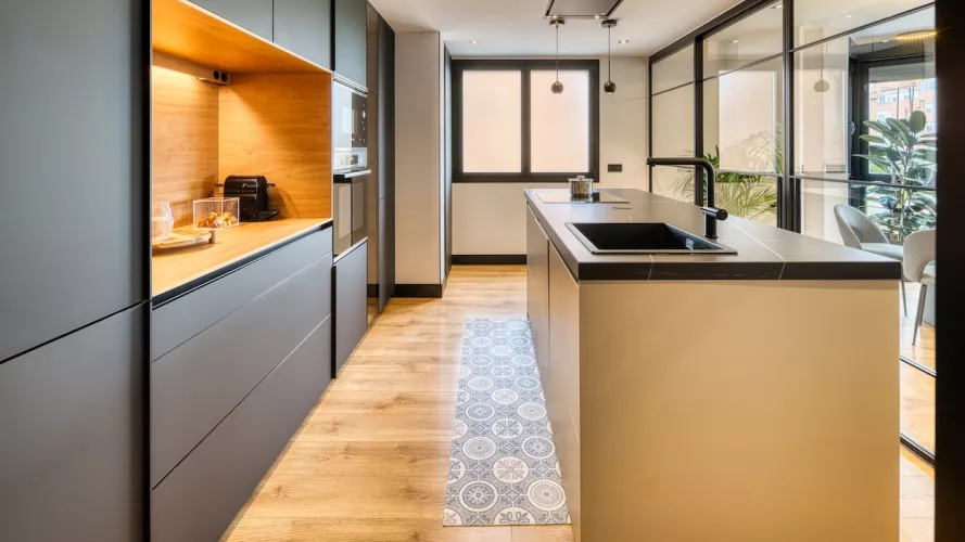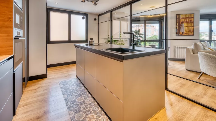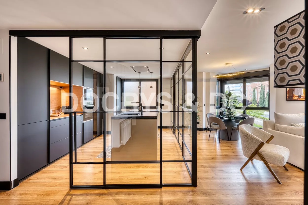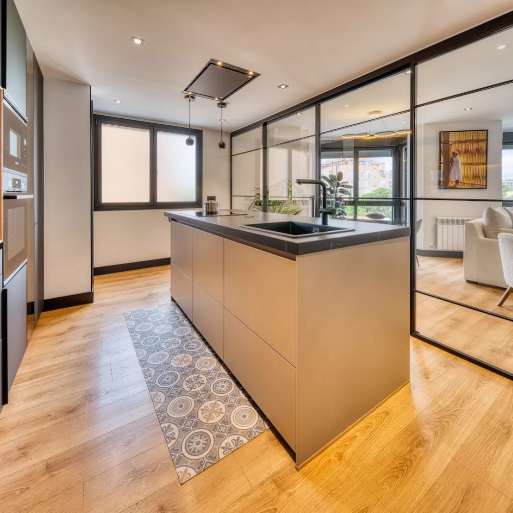 La cocina está cerrada en todo su perímetro por puertas correderas de cristal transparente con marcos de aluminio negro. Estas puertas no solo permiten que la luz natural fluya libremente, sino que también ofrecen la flexibilidad de abrir o cerrar el espacio según sea necesario. Esta característica es ideal para mantener la cocina conectada con el resto de la vivienda o para cerrarla cuando se requiere mayor privacidad.