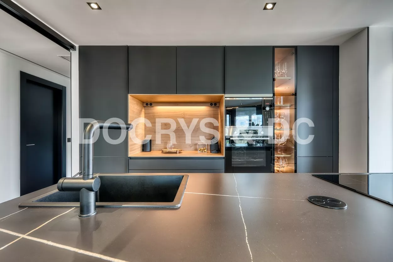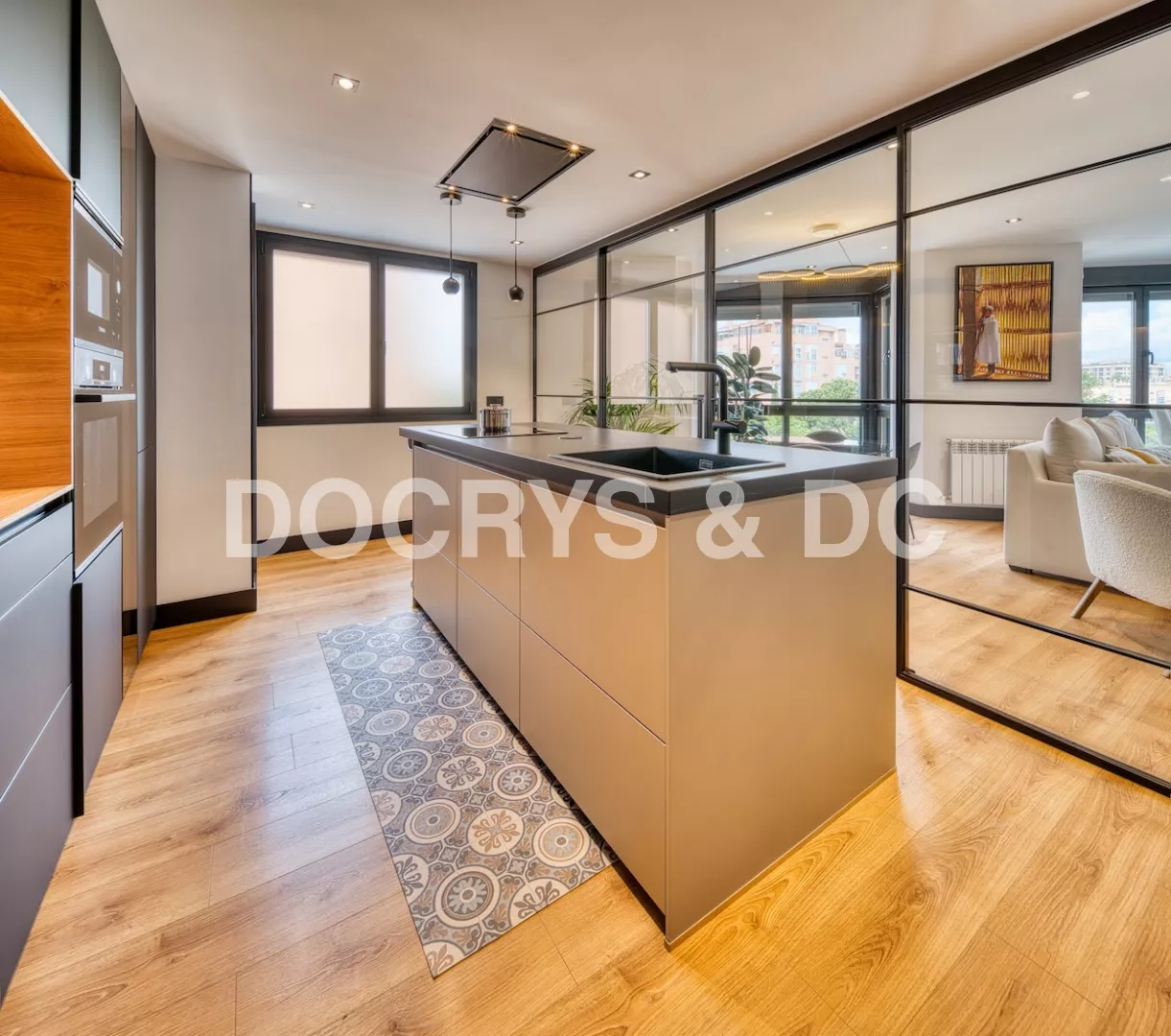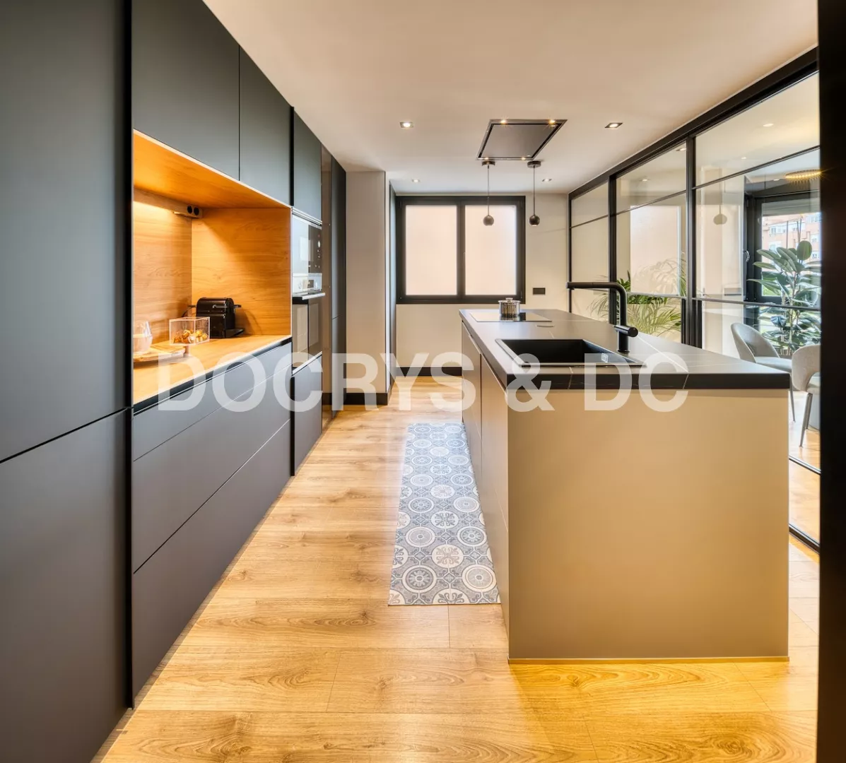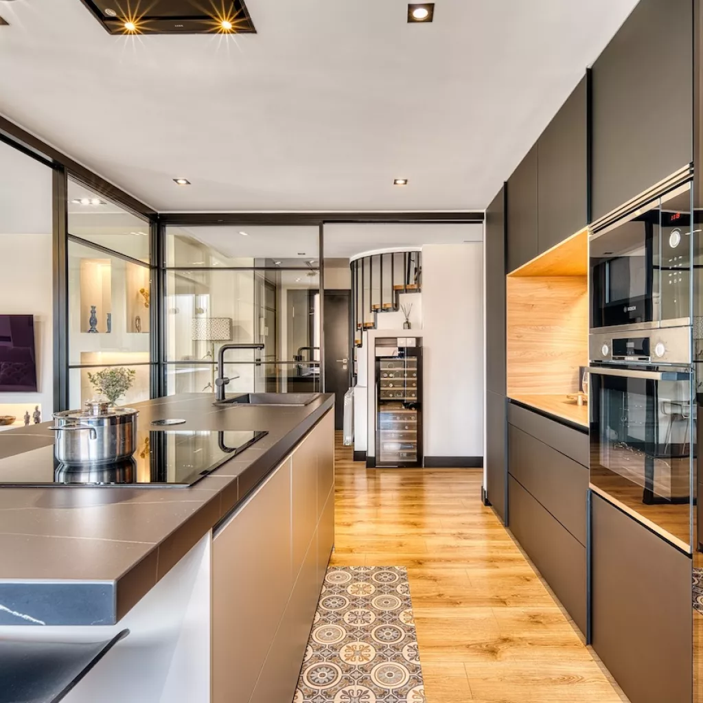 La cocina está cerrada en todo su perímetro por puertas correderas de cristal transparente con marcos de aluminio negro. Estas puertas no solo permiten que la luz natural fluya libremente, sino que también ofrecen la flexibilidad de abrir o cerrar el espacio según sea necesario. Esta característica es ideal para mantener la cocina conectada con el resto de la vivienda o para cerrarla cuando se requiere mayor privacidad.