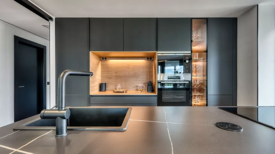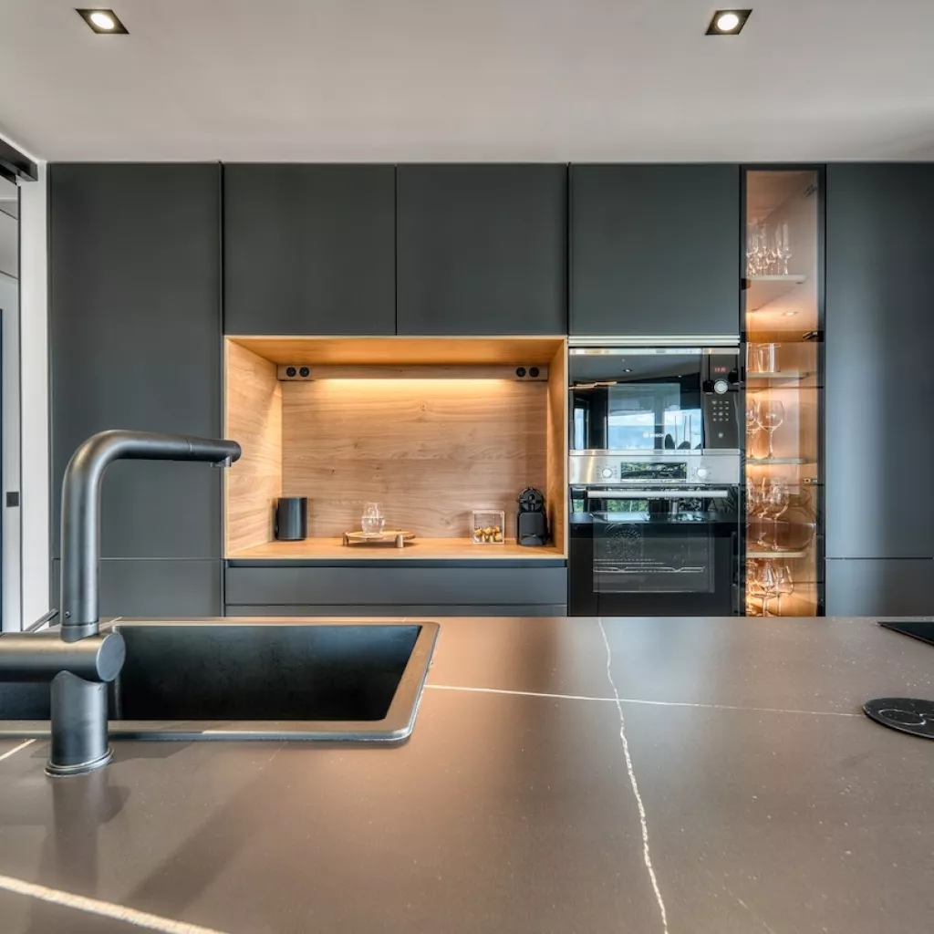 Añadiendo un toque cálido y natural, se ha incluido una hornacina en roble natural. La madera de roble, con sus tonos cálidos, contrasta con los acabados más fríos y modernos del resto de la cocina.