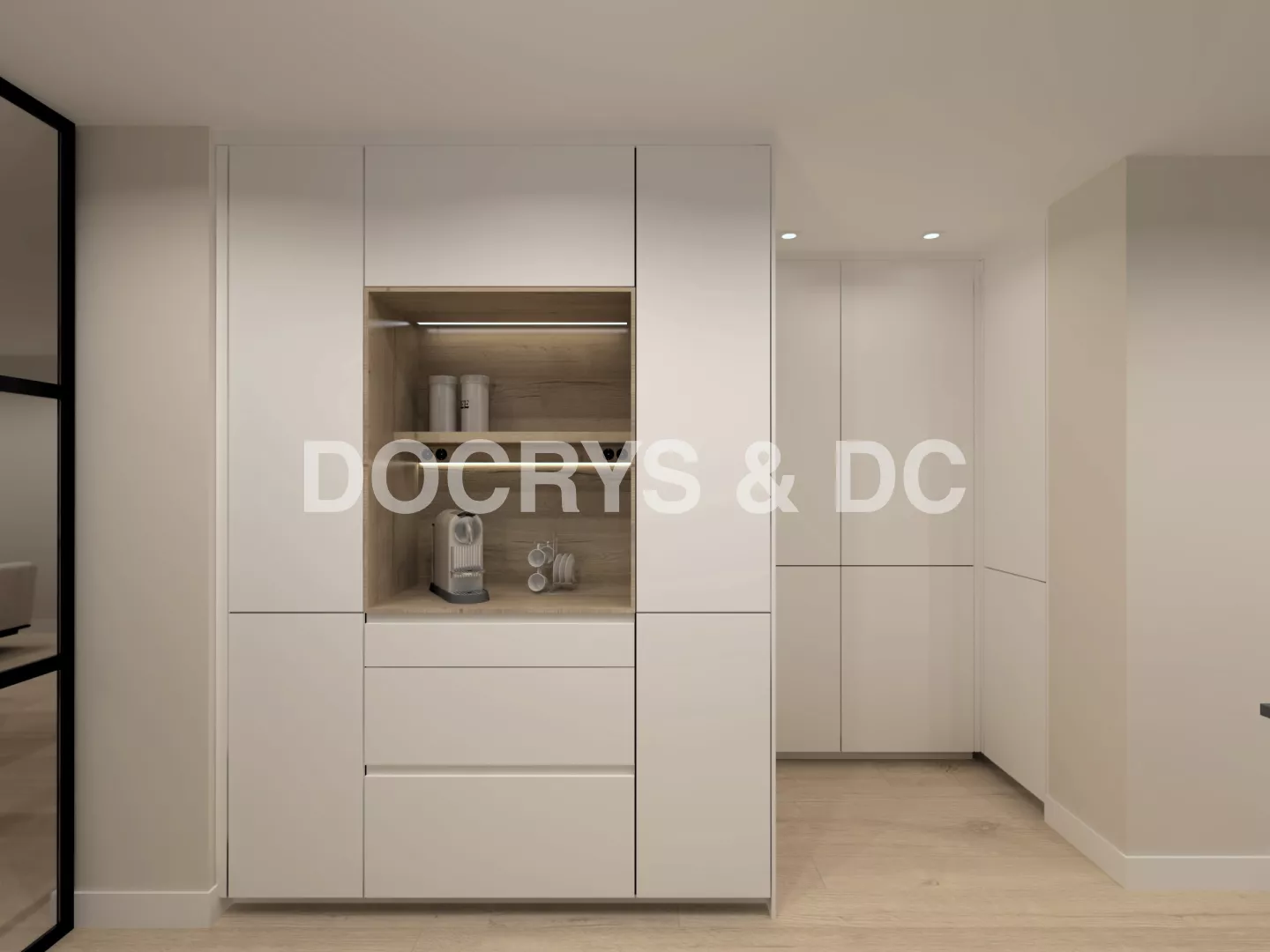 El mobiliario en columna ofrece gran capacidad de almacenaje y alberga los electrodomésticos de integración en acabado negro, aportando coherencia estética y practicidad. Además, el módulo abierto con acabado en madera clara introduce un rincón funcional, perfecto para organizar la zona de café o pequeños accesorios de uso diario.