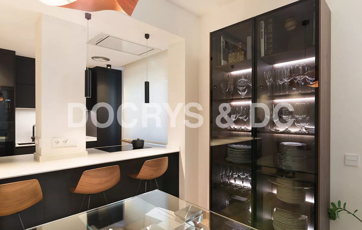 Por otro lado, tenemos la vitrina de dos columnas que le da elegancia y calidez al espacio abierto al salón.
