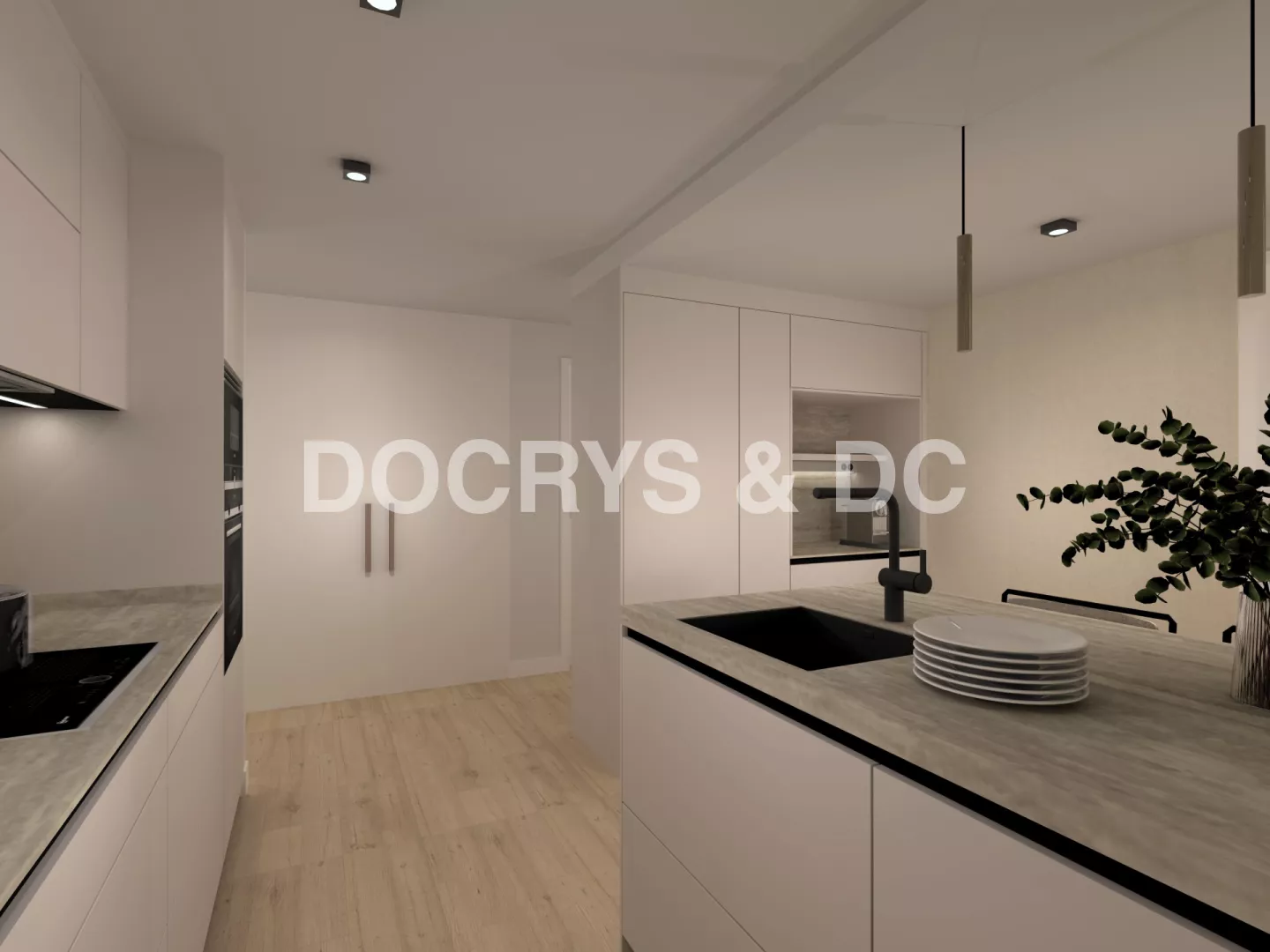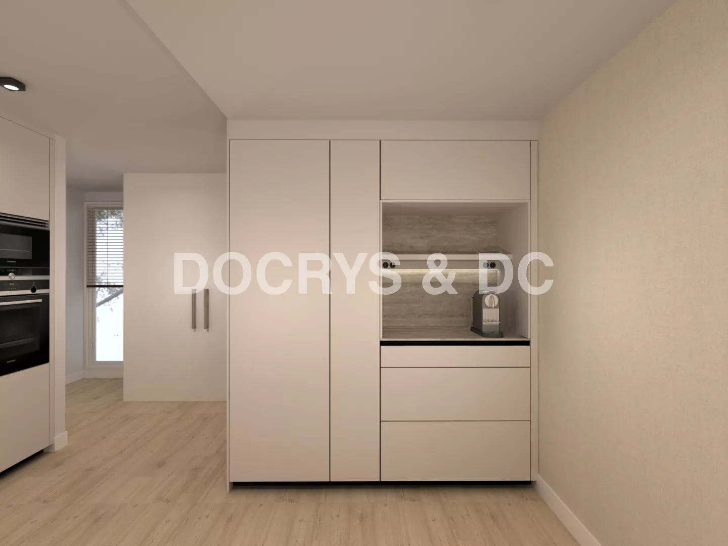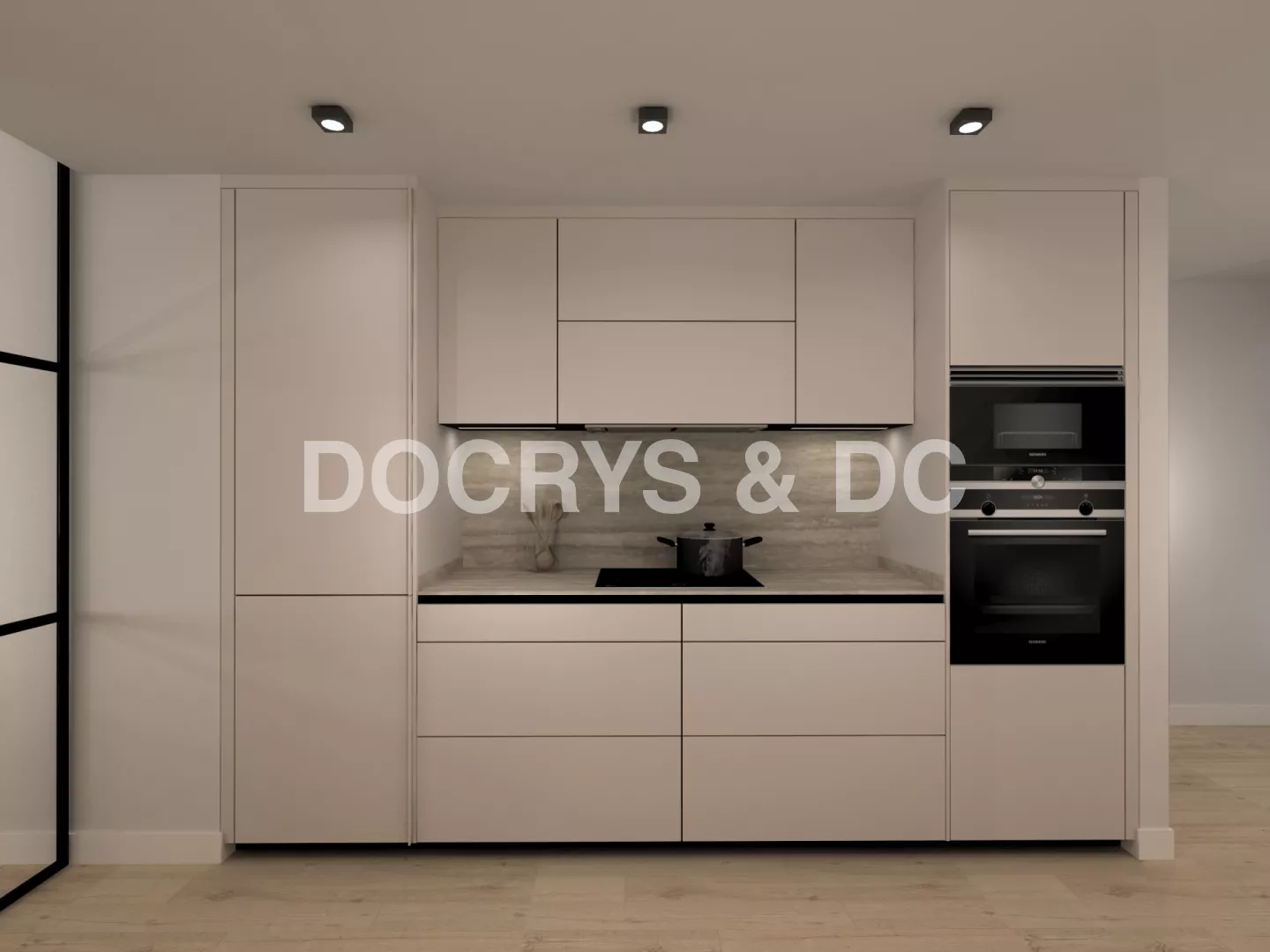 Este proyecto propone una cocina contemporánea de líneas limpias y proporciones equilibradas, donde los tonos suaves y los materiales naturales crean un ambiente elegante, cálido y atemporal. El mobiliario en acabado neutro se integra con encimeras de textura pétrea y pavimento de madera clara, aportando continuidad visual y una sensación de confort inmediato.