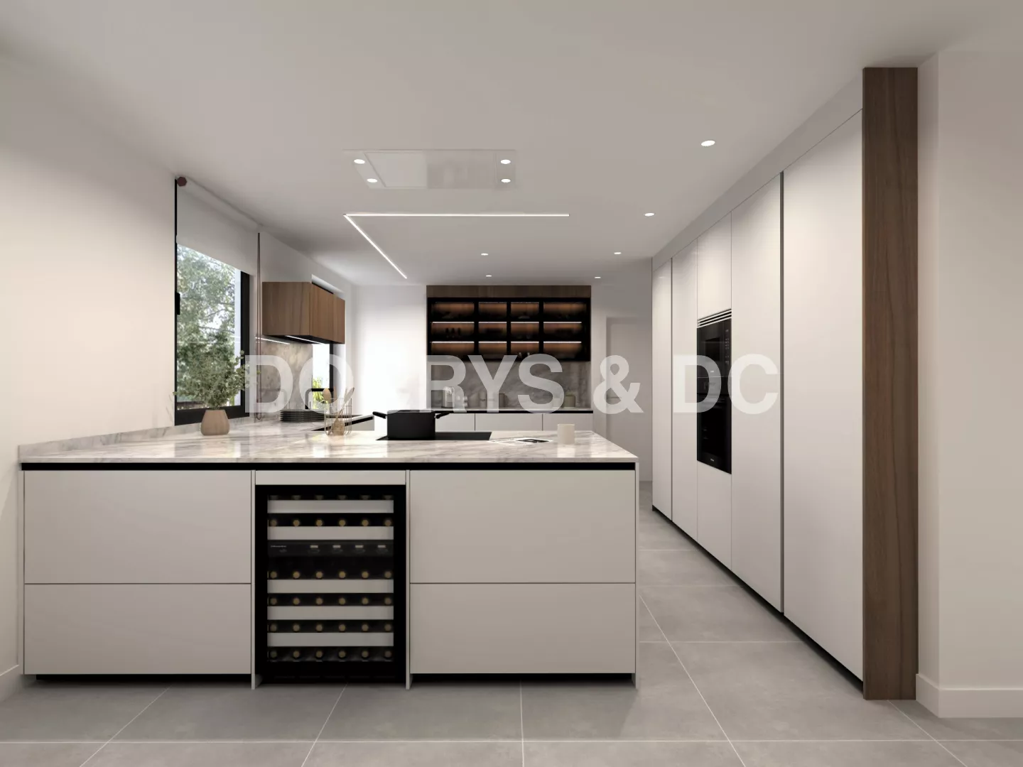 El diseño completo de la cocina está articulado alrededor de una gran isla, la cual es el centro de la estancia, el elemento central. La encimera con vetas combina belleza y resistencia, mientras que la vinoteca integrada aporta un toque práctico y sofisticado.