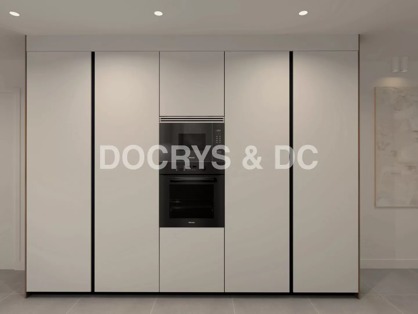 El mobiliario en acabado mate con perfil negro, ofrece una imagen a la cocina negra y refinada. Las columnas a medida de la cocina integran tanto electrodomésticos como almacenaje manteniendo un frente uniforme y limpio. En contraste, los módulos de madera oscura y vidrio ahumado introducen calidez y profundidad visual a la estancia, generando un ambiente que esté equilibrado entre lo técnico y lo natural.