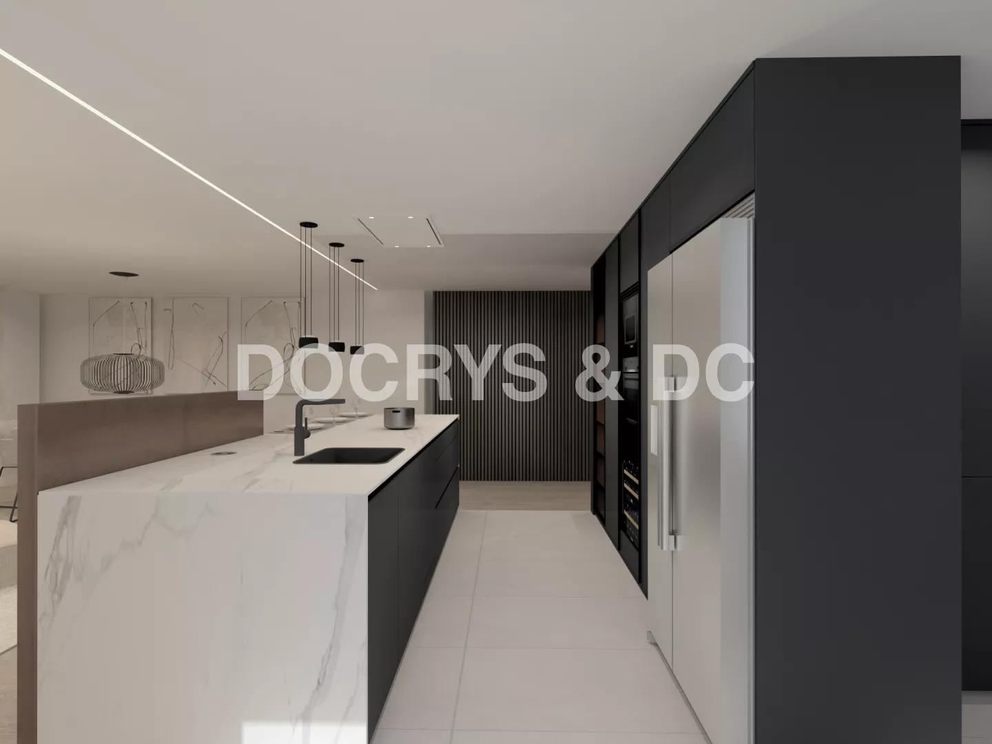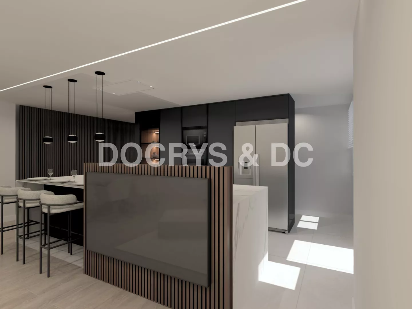 Cada detalle contribuye a una atmósfera de orden y armonía, desde los tiradores ocultos hasta los paneles verticales en madera que conectan visualmente la cocina con el resto de la vivienda. Un proyecto pensado para quienes valoran la estética contemporánea sin renunciar a la comodidad de un espacio abierto y funcional.